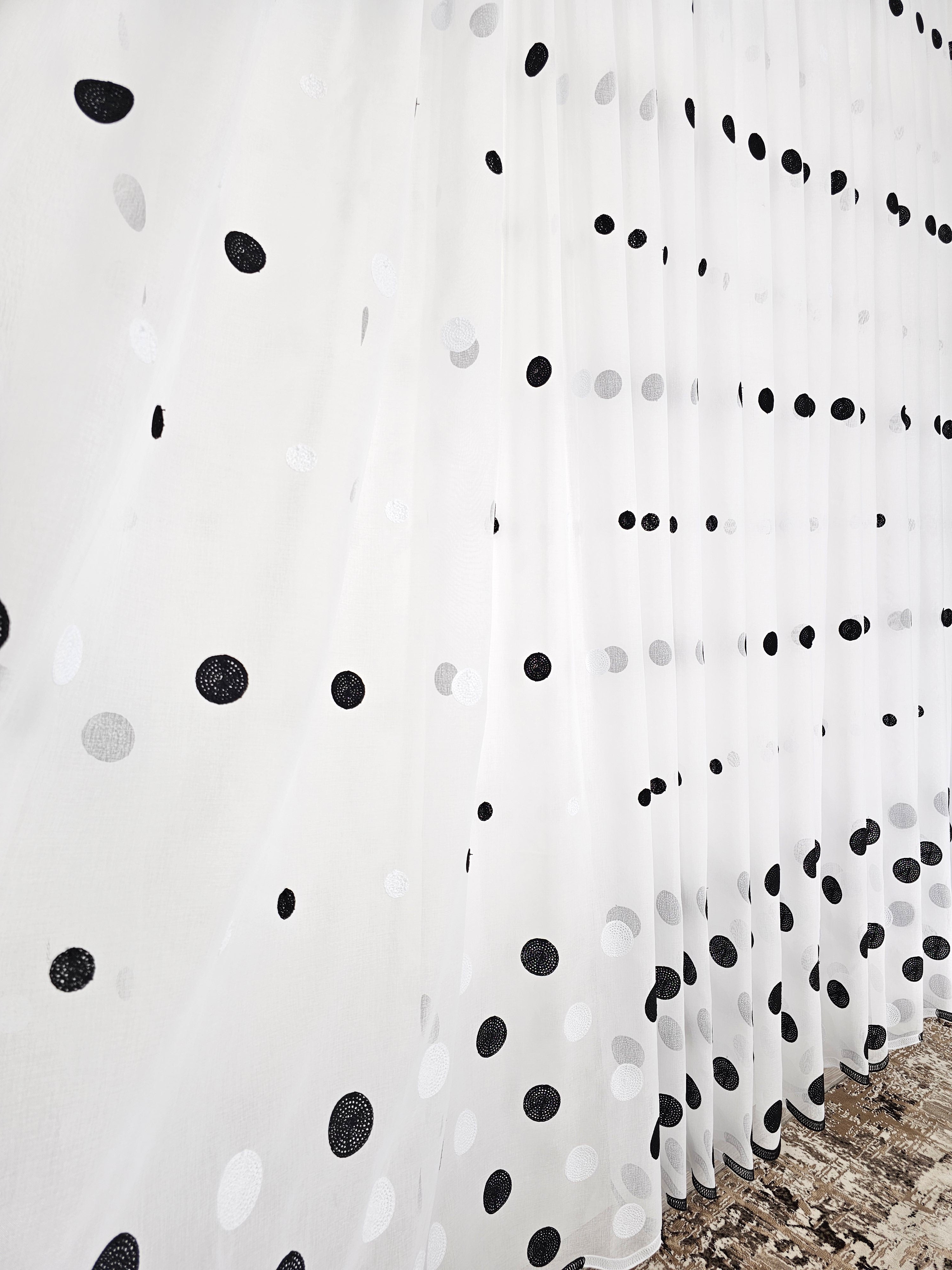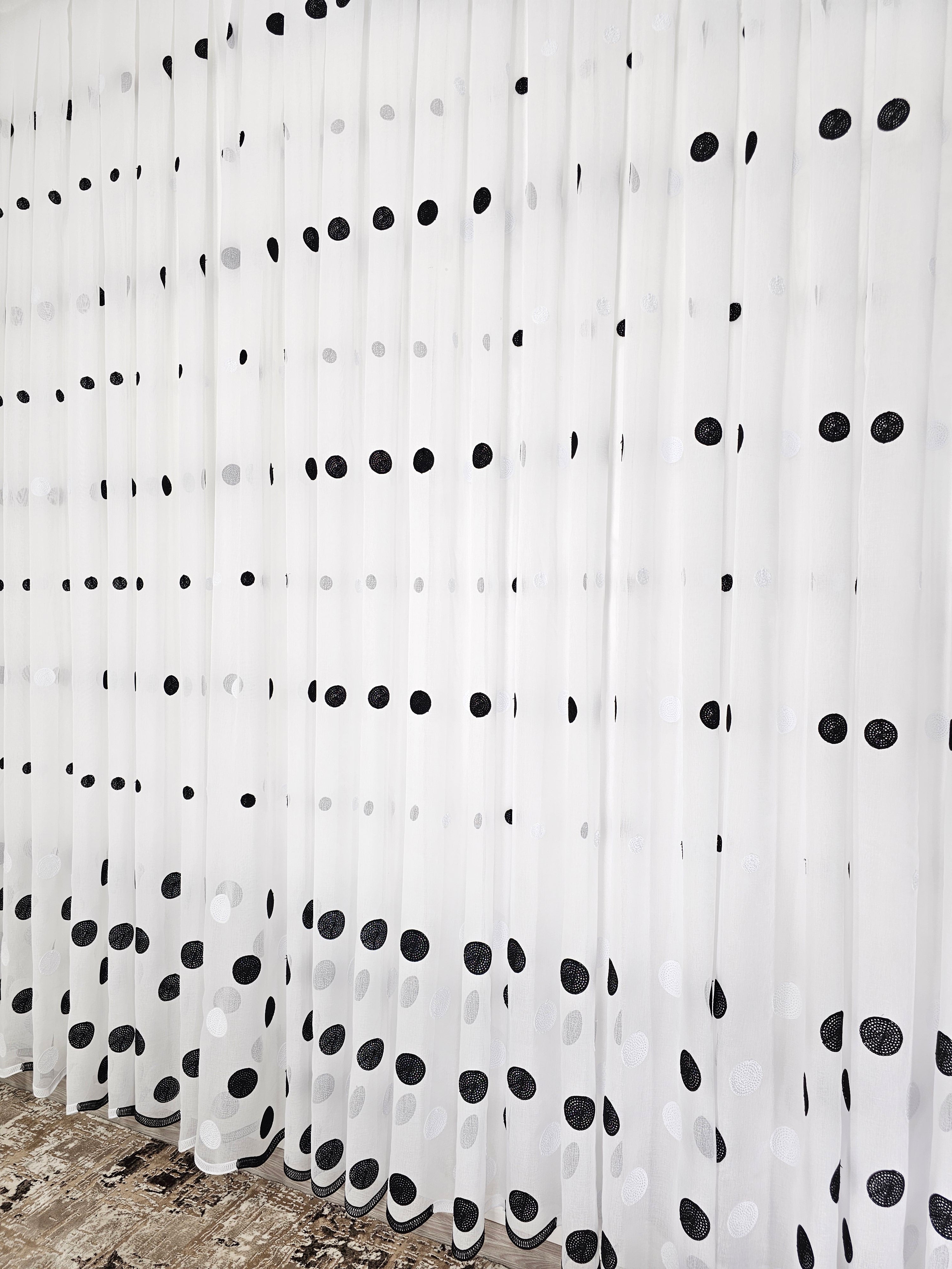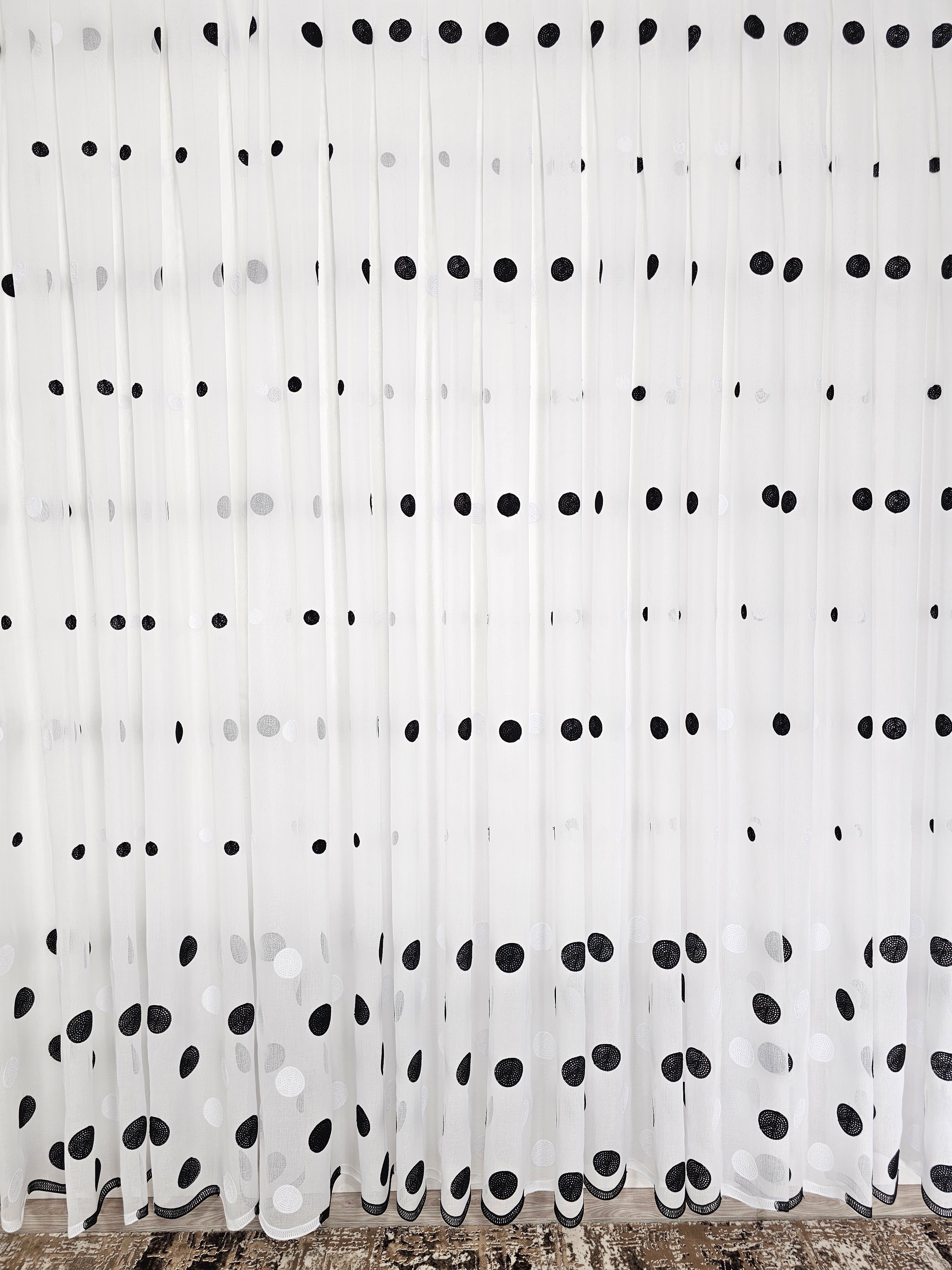 Perdeaua Buline Alb cu Negru aduce un aer modern și jucăuș în decorul casei tale. Realizată din material plin ca textură tip in, combină fundalul alb cu buline negre, oferind un contrast puternic și un design contemporan.