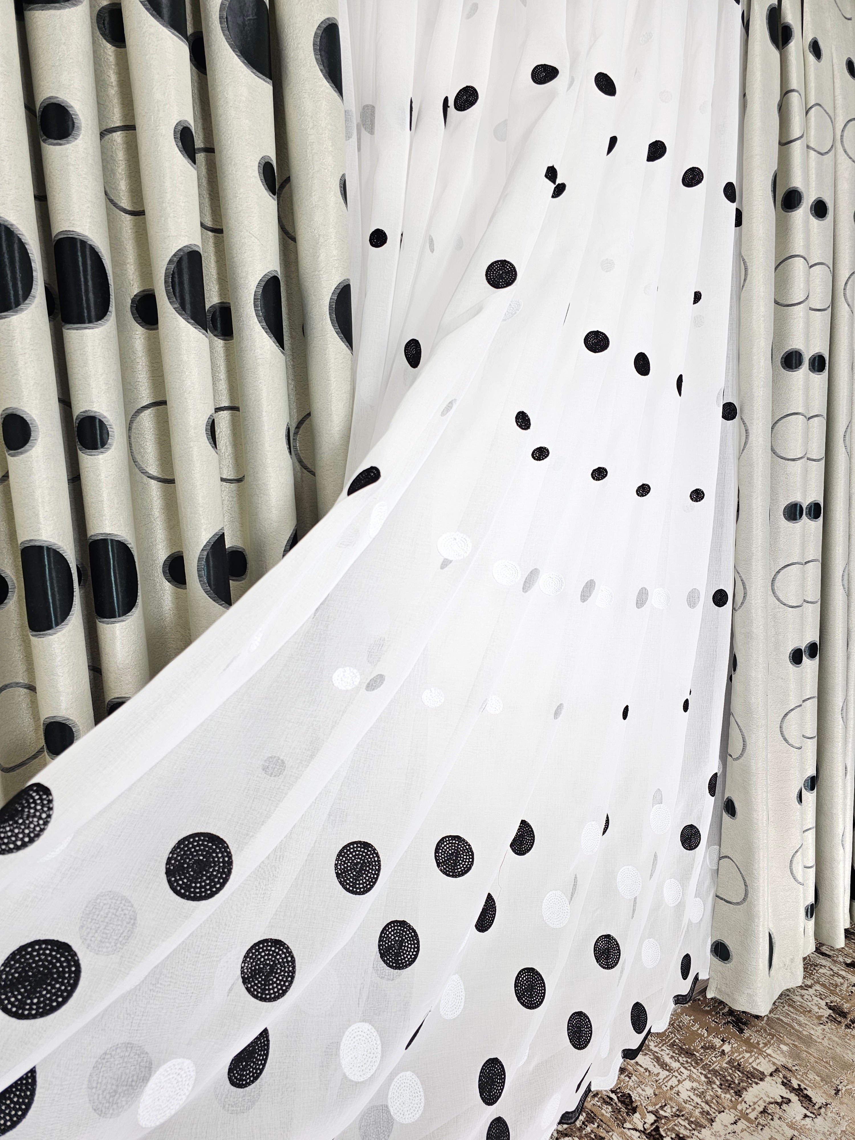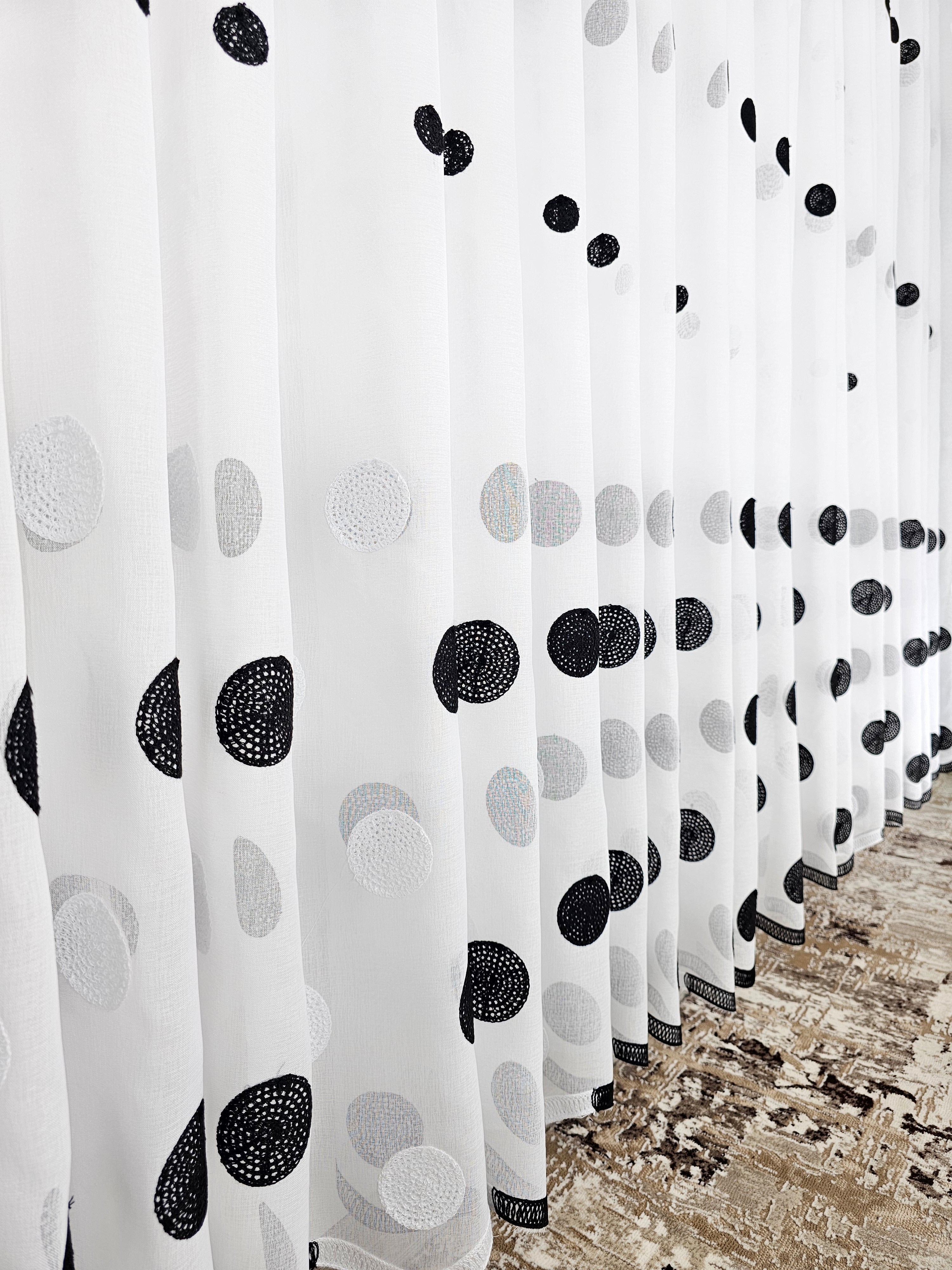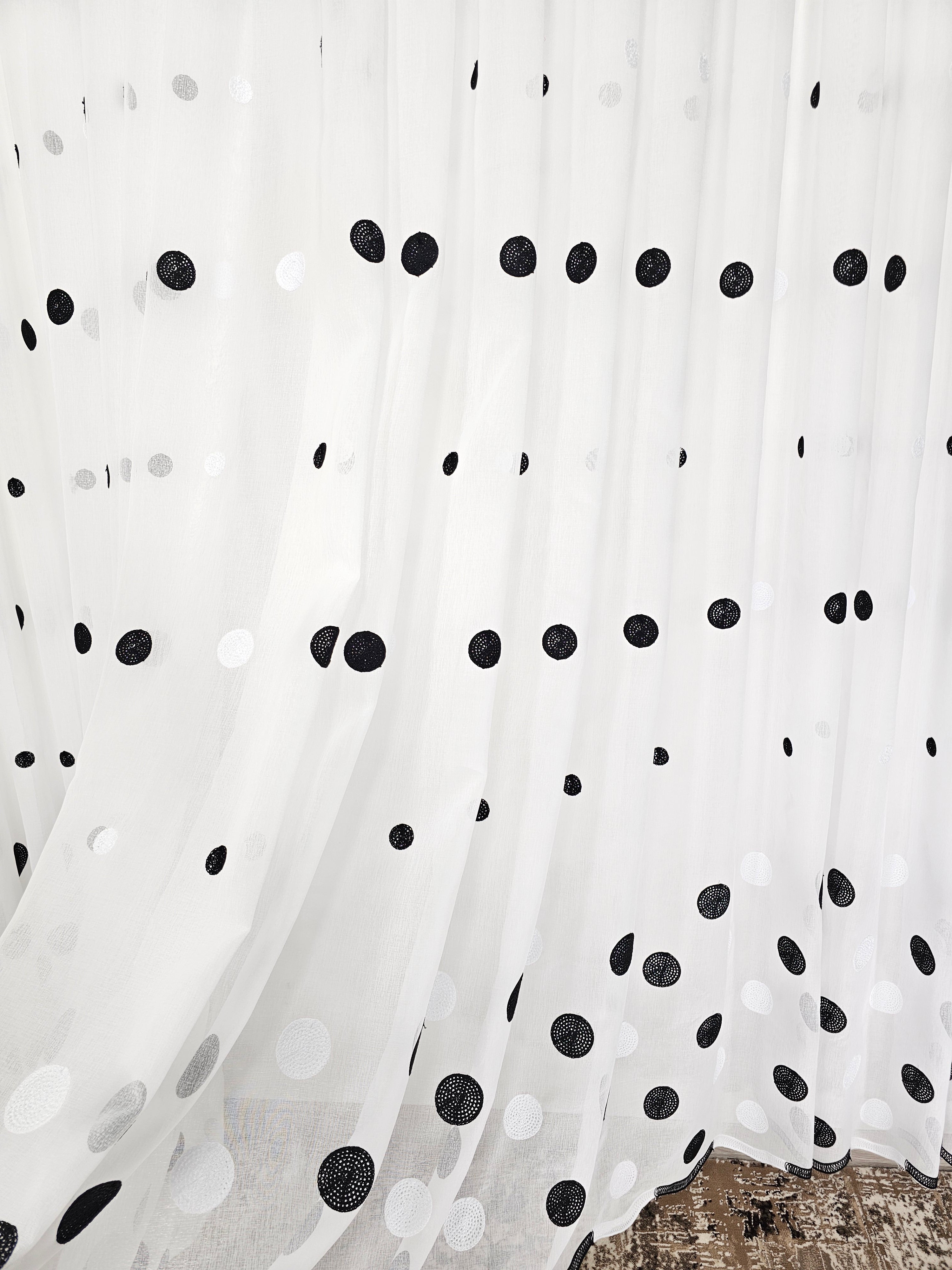 Perdeaua Buline Alb cu Negru aduce un aer modern și jucăuș în decorul casei tale. Realizată din material plin ca textură tip in, combină fundalul alb cu buline negre, oferind un contrast puternic și un design contemporan.