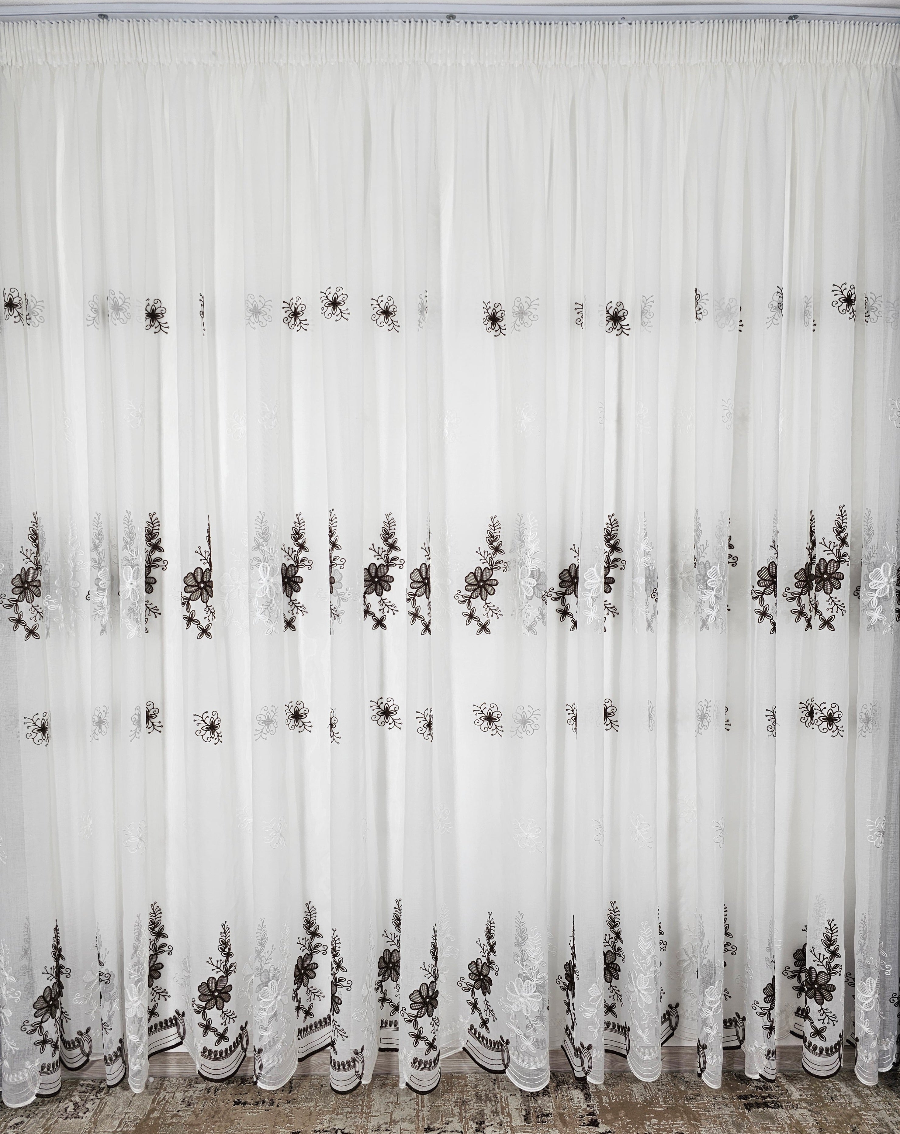 Perdeaua Camila cu flori maro transformă ferestrele într-un detaliu decorativ rafinat, aducând un plus de stil și naturalețe casei tale.