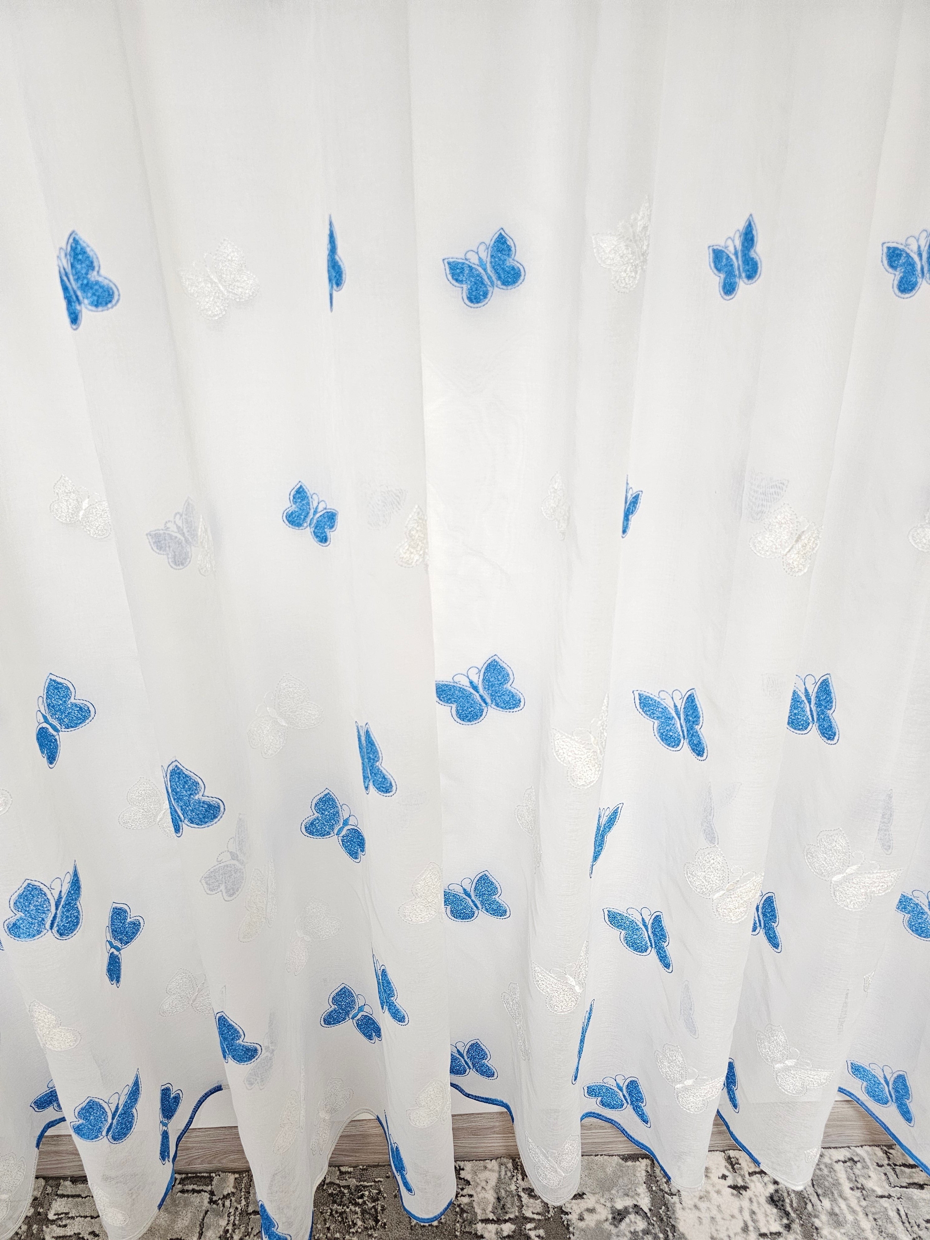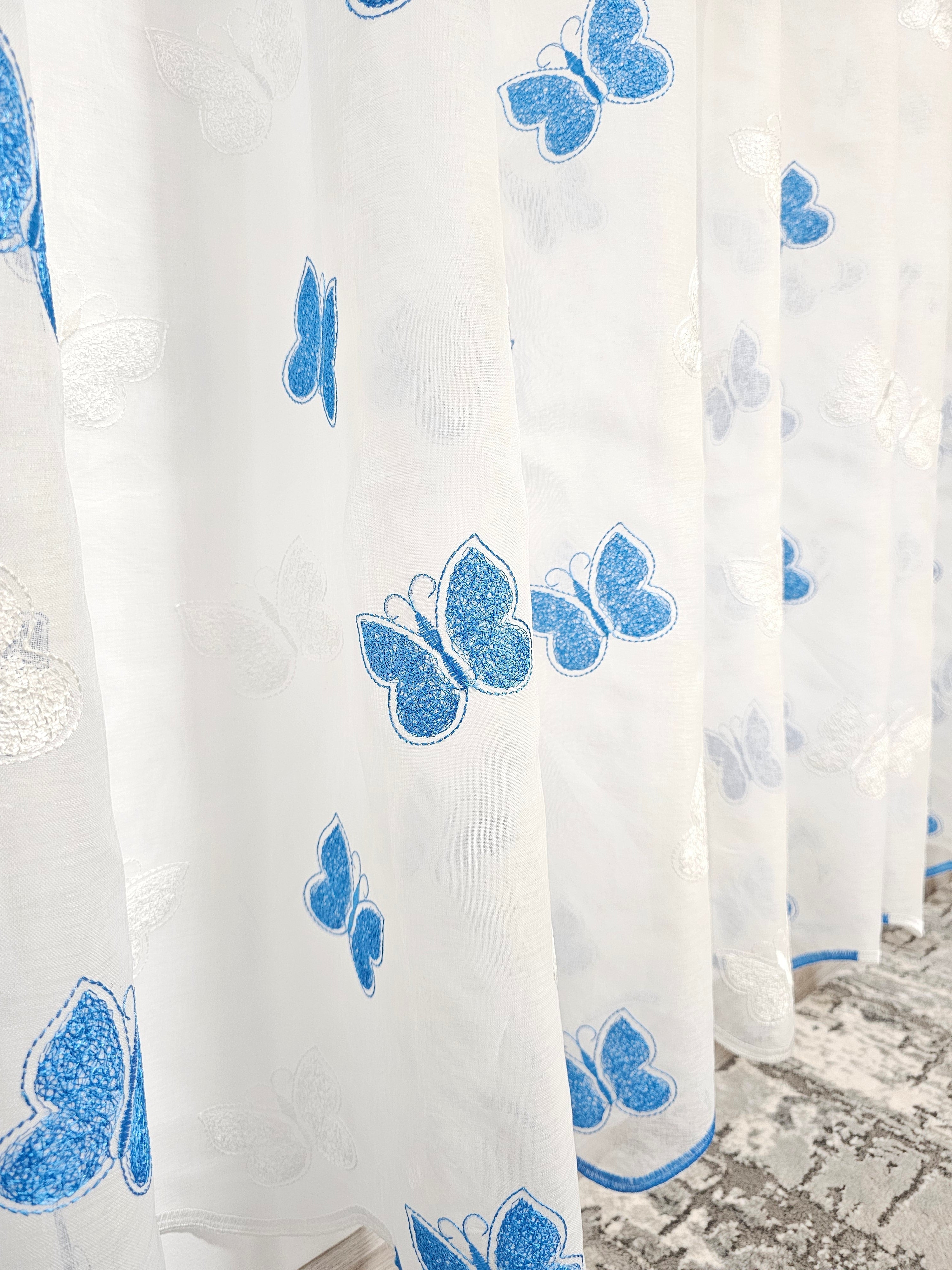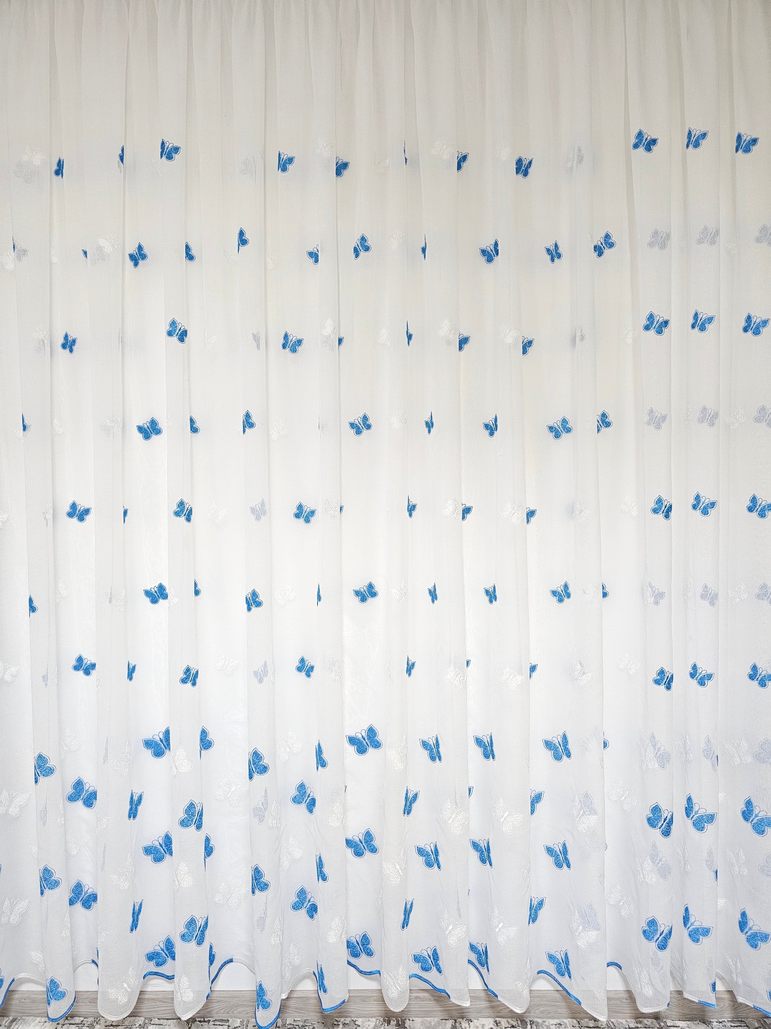 Design Fermecător: Fluturii albaștri, atent imprimați, aduc un contrast subtil pe fundalul alb al perdelei, creând un efect vizual captivant și revitalizant.