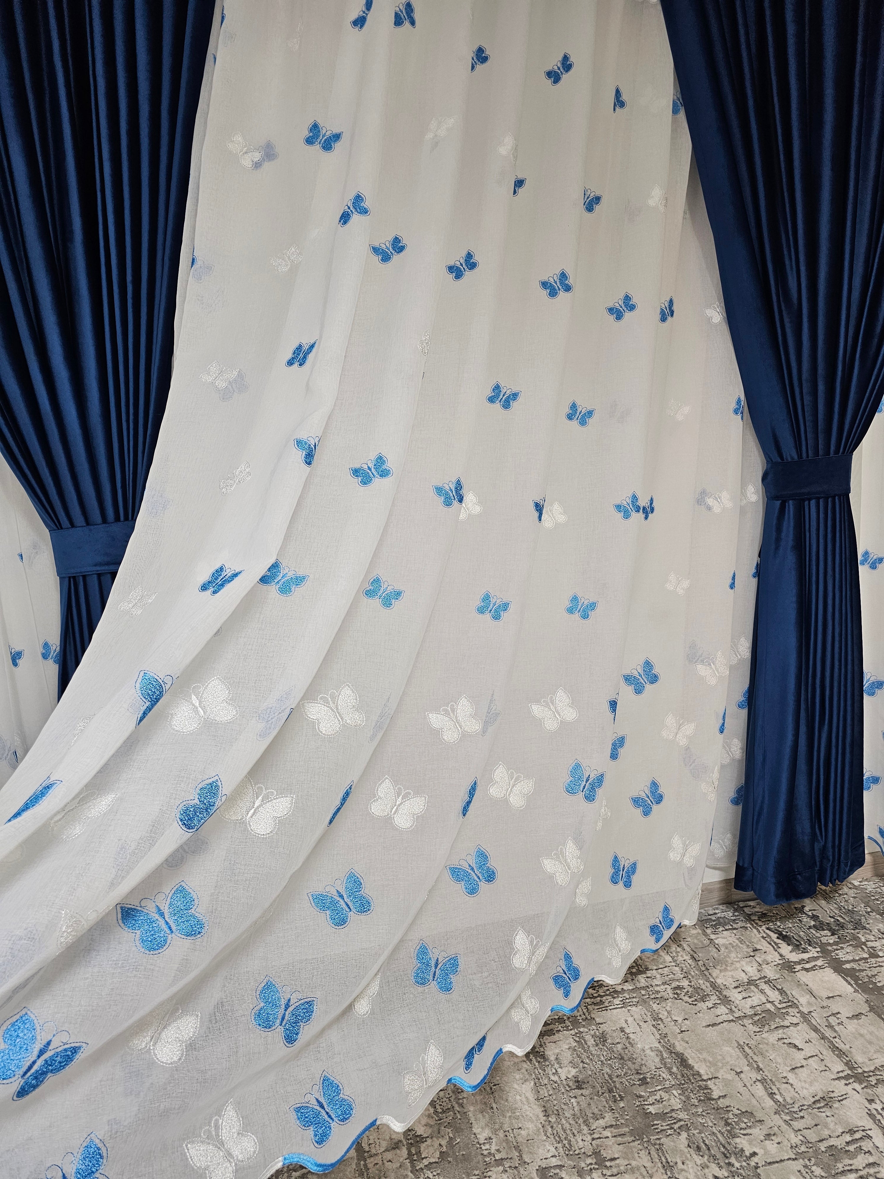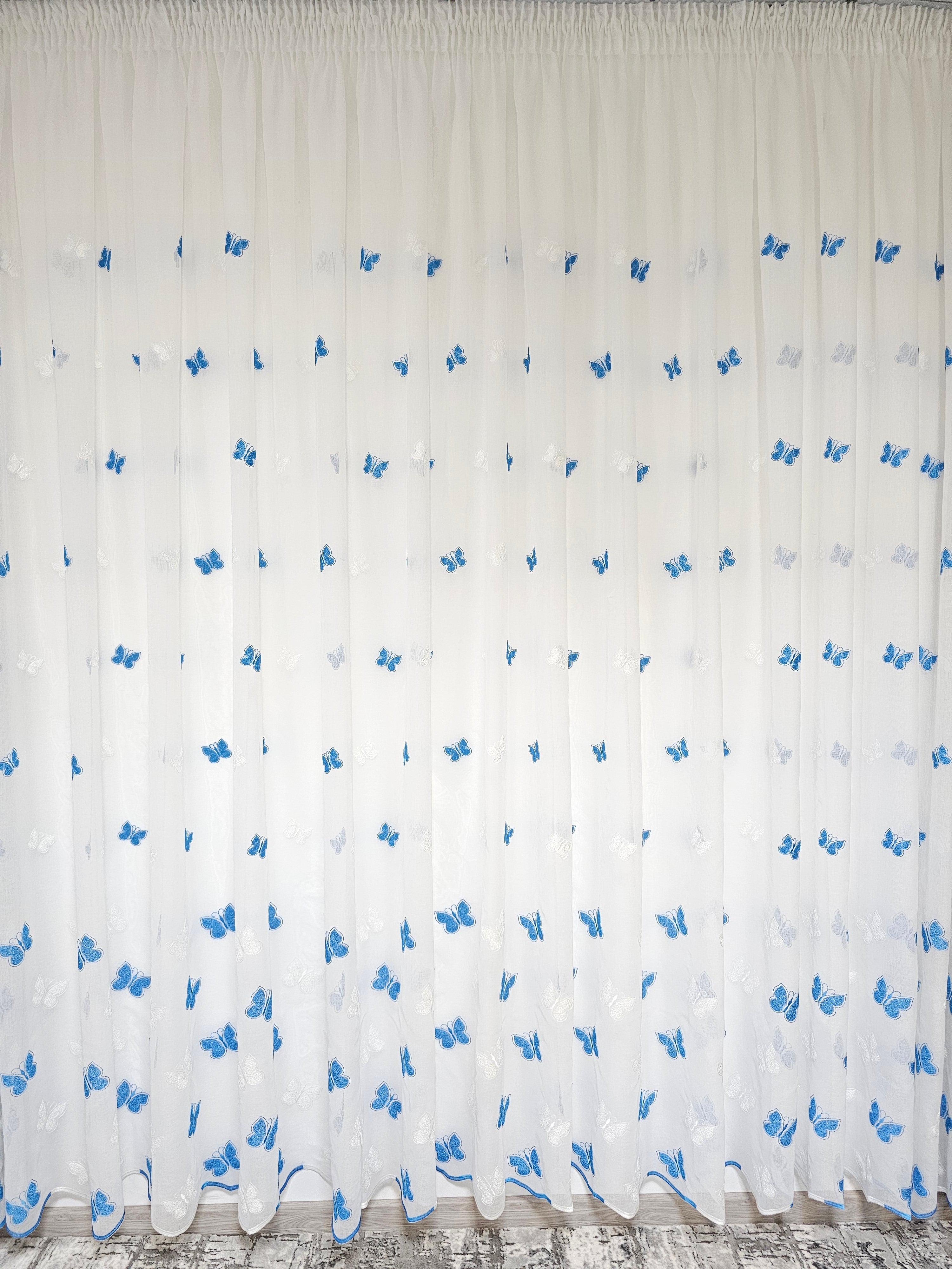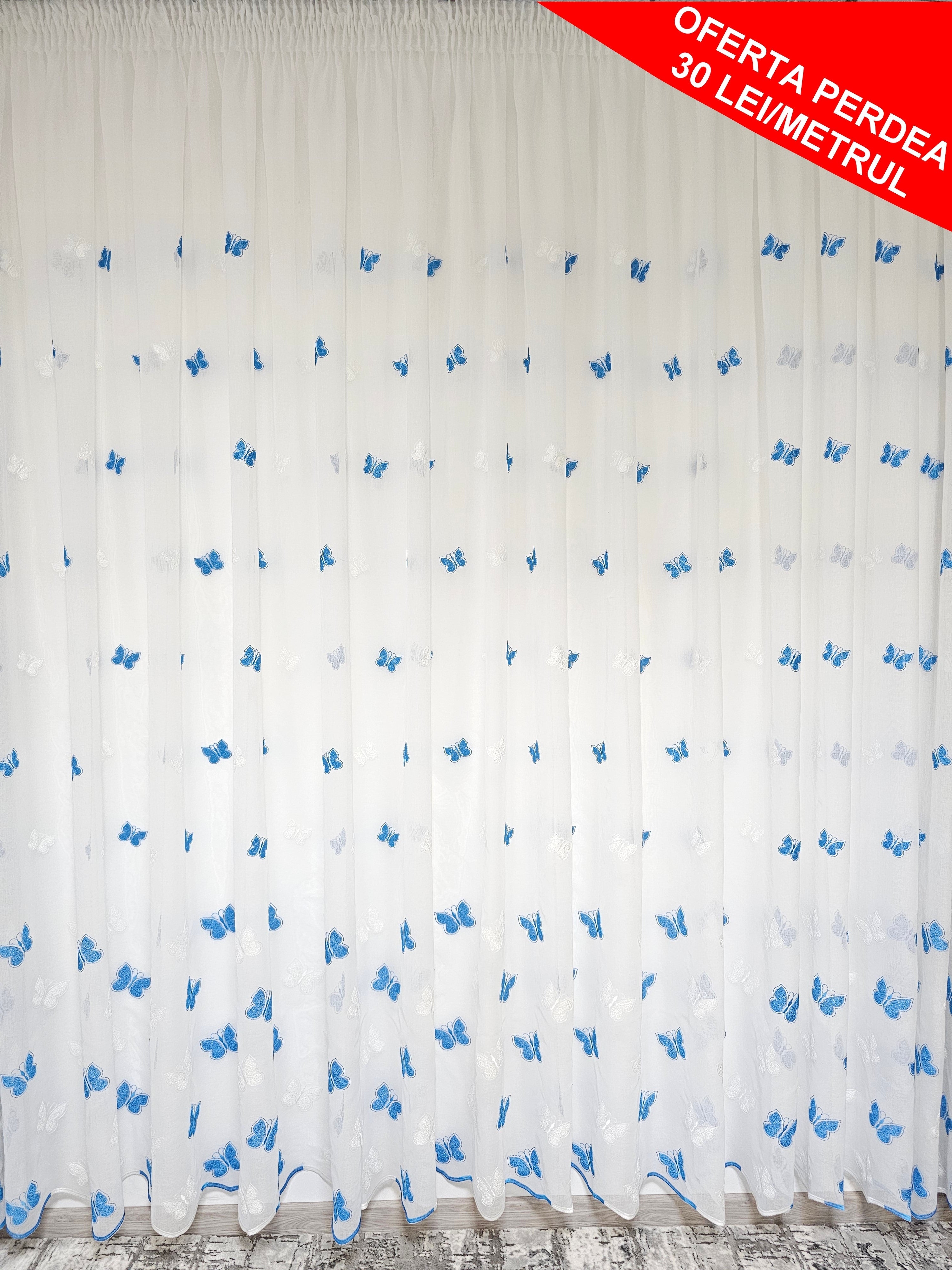 Design Fermecător: Fluturii albaștri, atent imprimați, aduc un contrast subtil pe fundalul alb al perdelei, creând un efect vizual captivant și revitalizant.