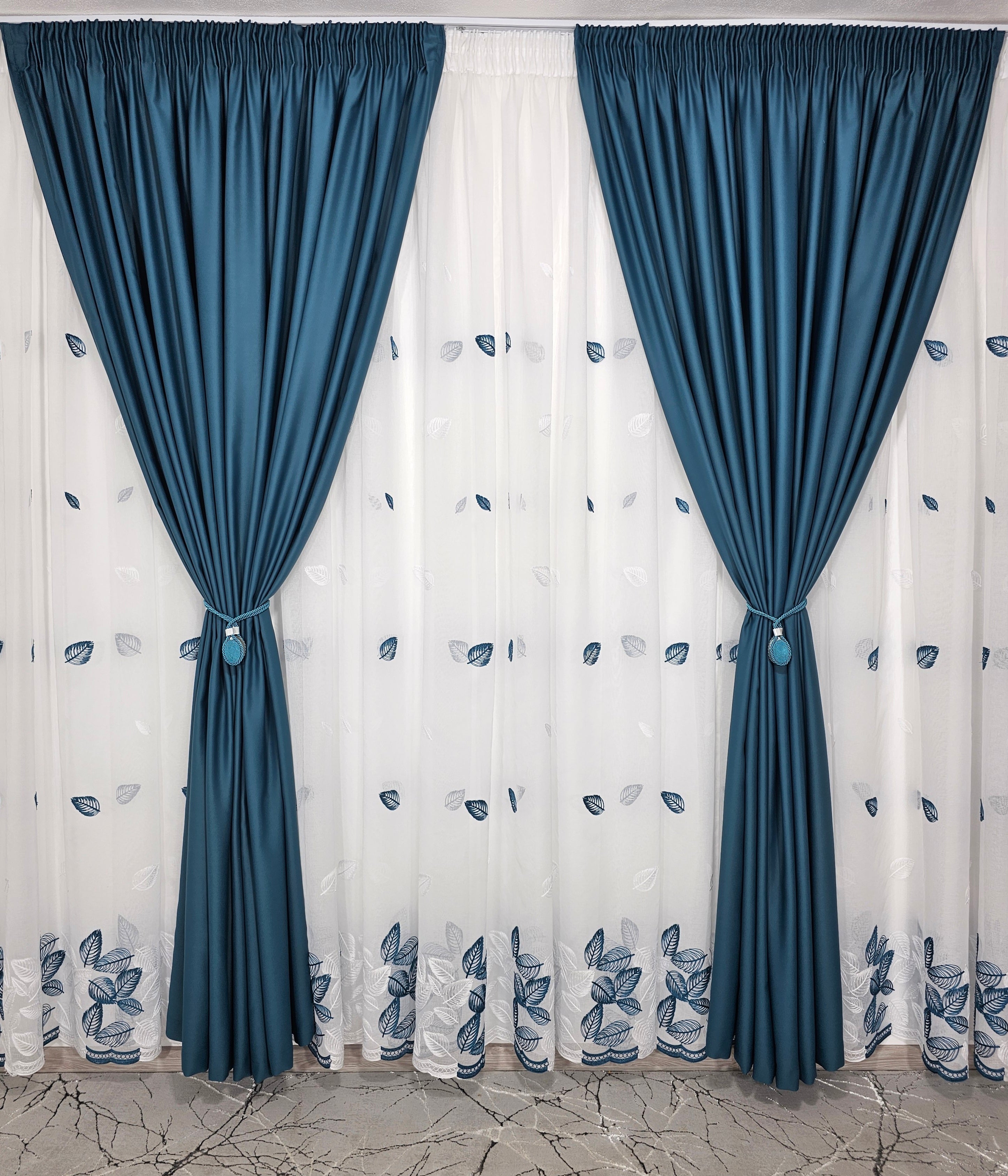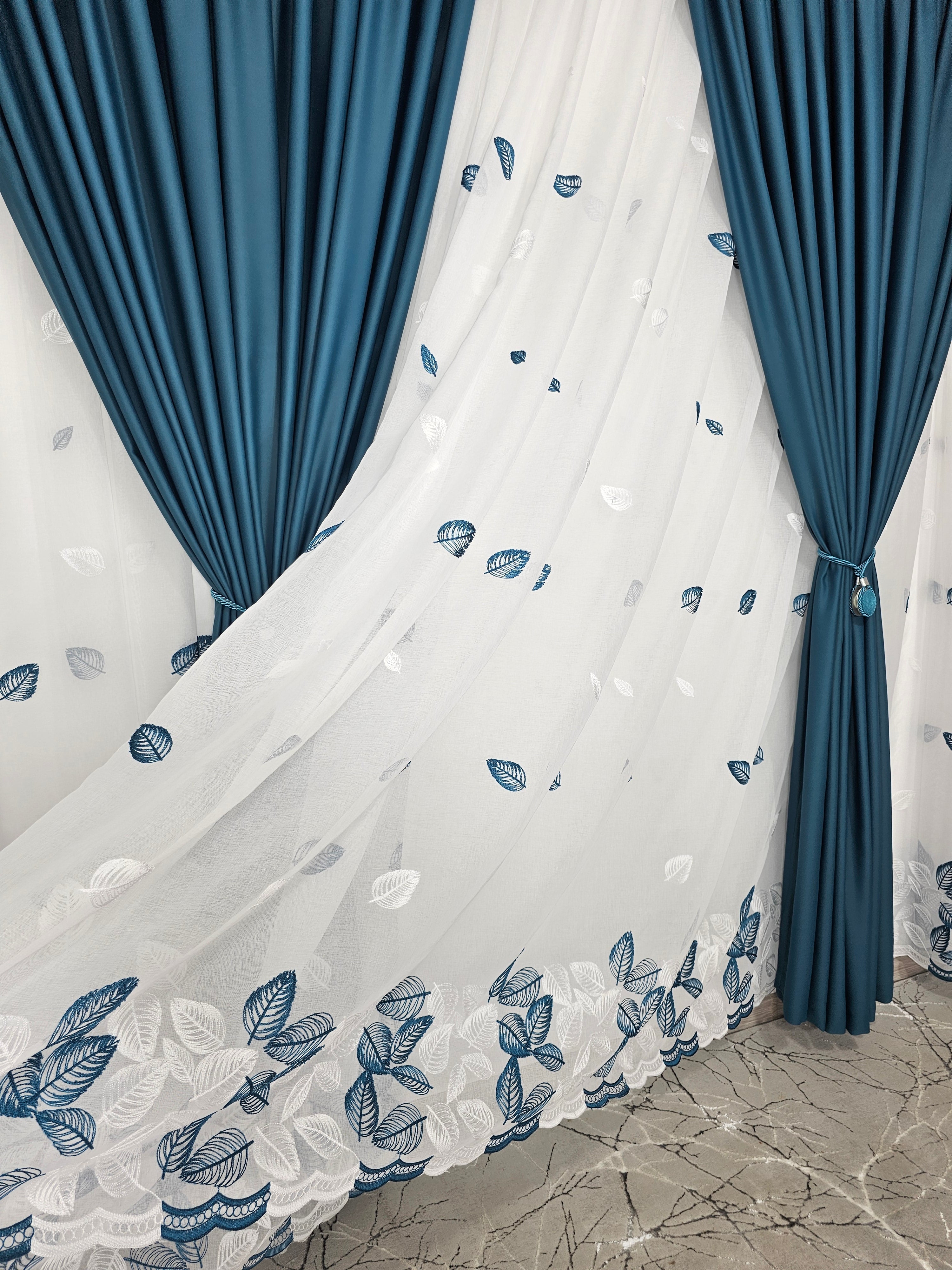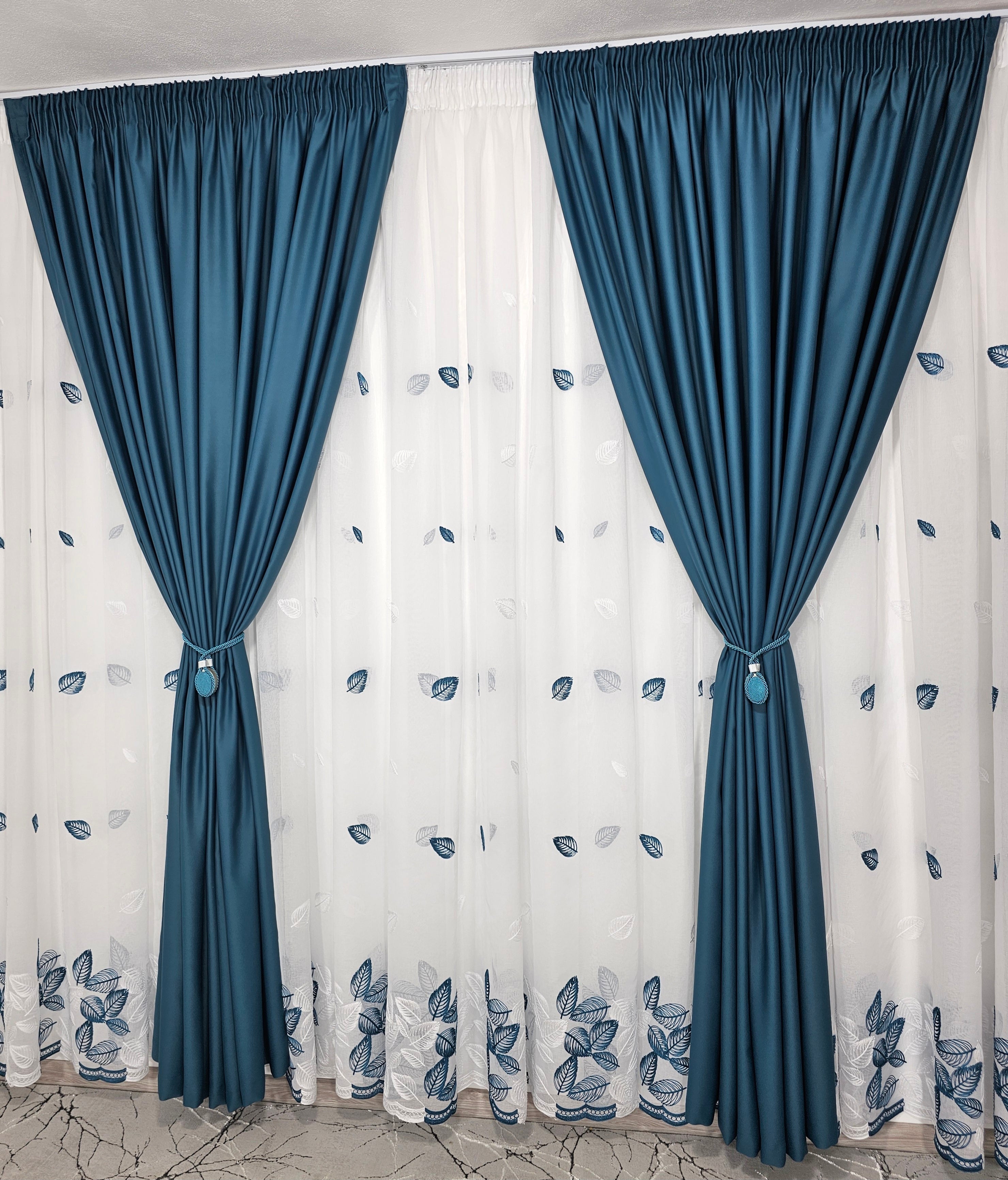 Perdeaua Bodi albă cu frunze turcoaz transformă ferestrele într-un element central de design, aducând energie, stil și rafinament în casa ta.