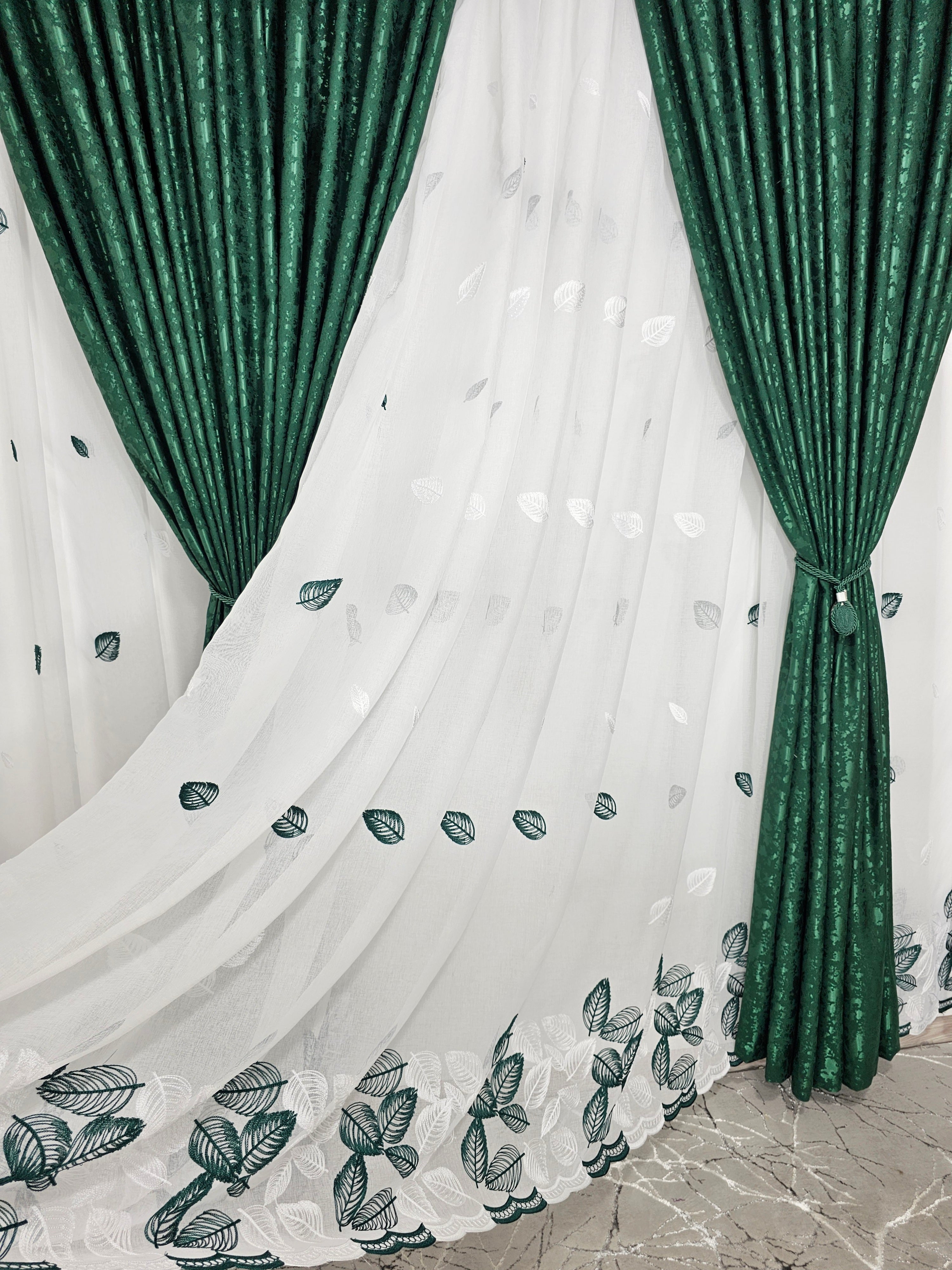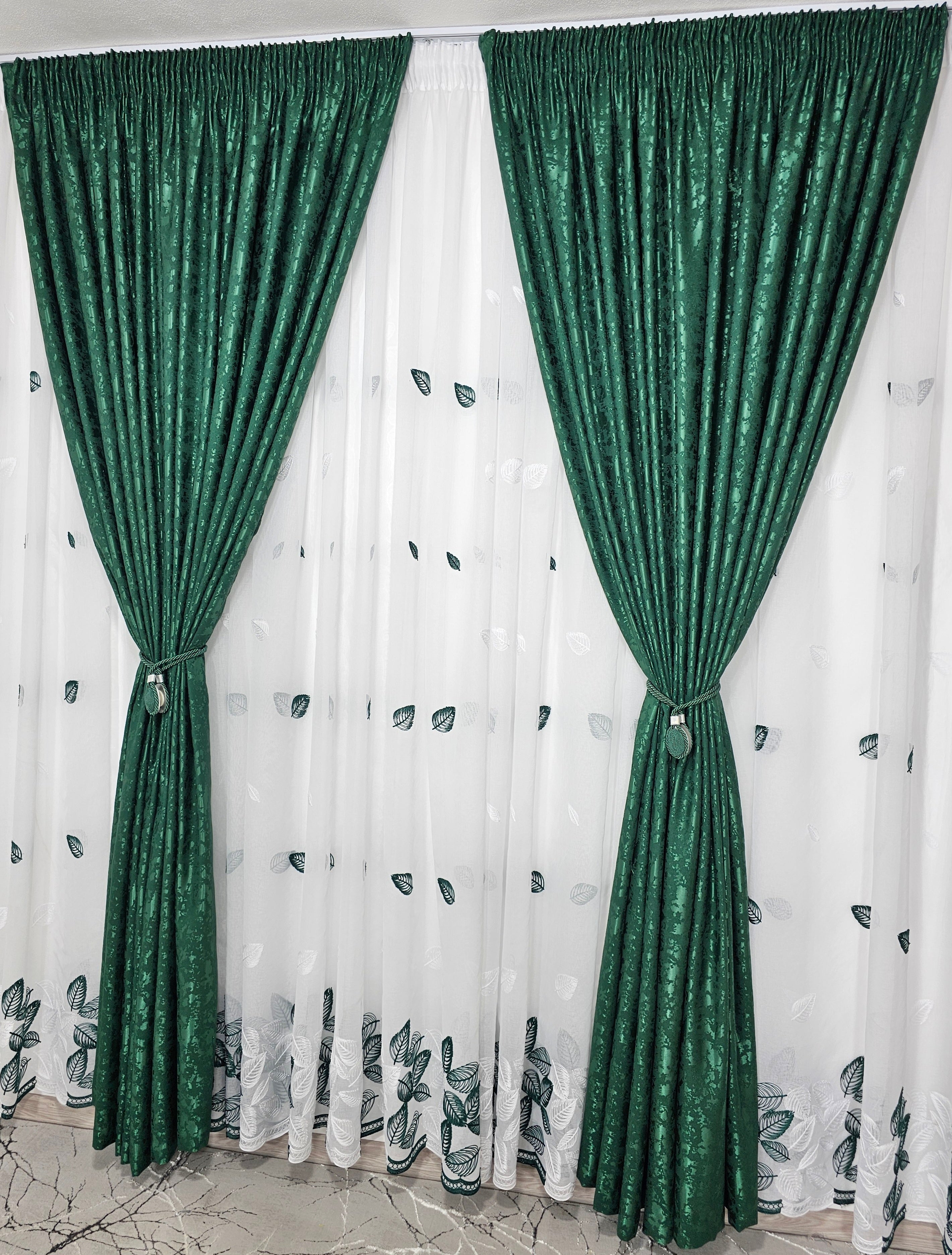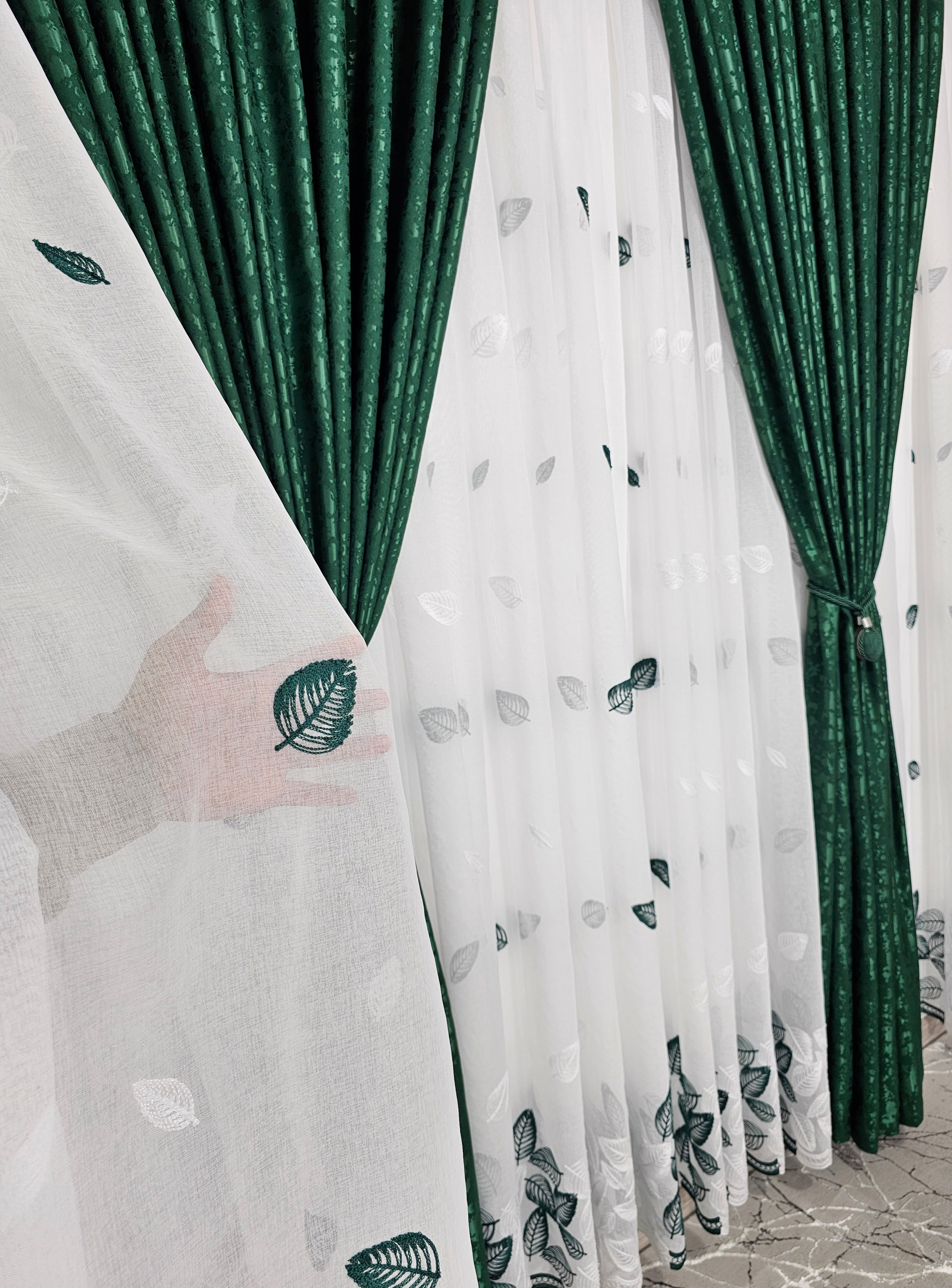 Prin designul cu frunze verzi și textura plină tip in, această perdea creează un ambient natural, relaxant și plin de eleganță.