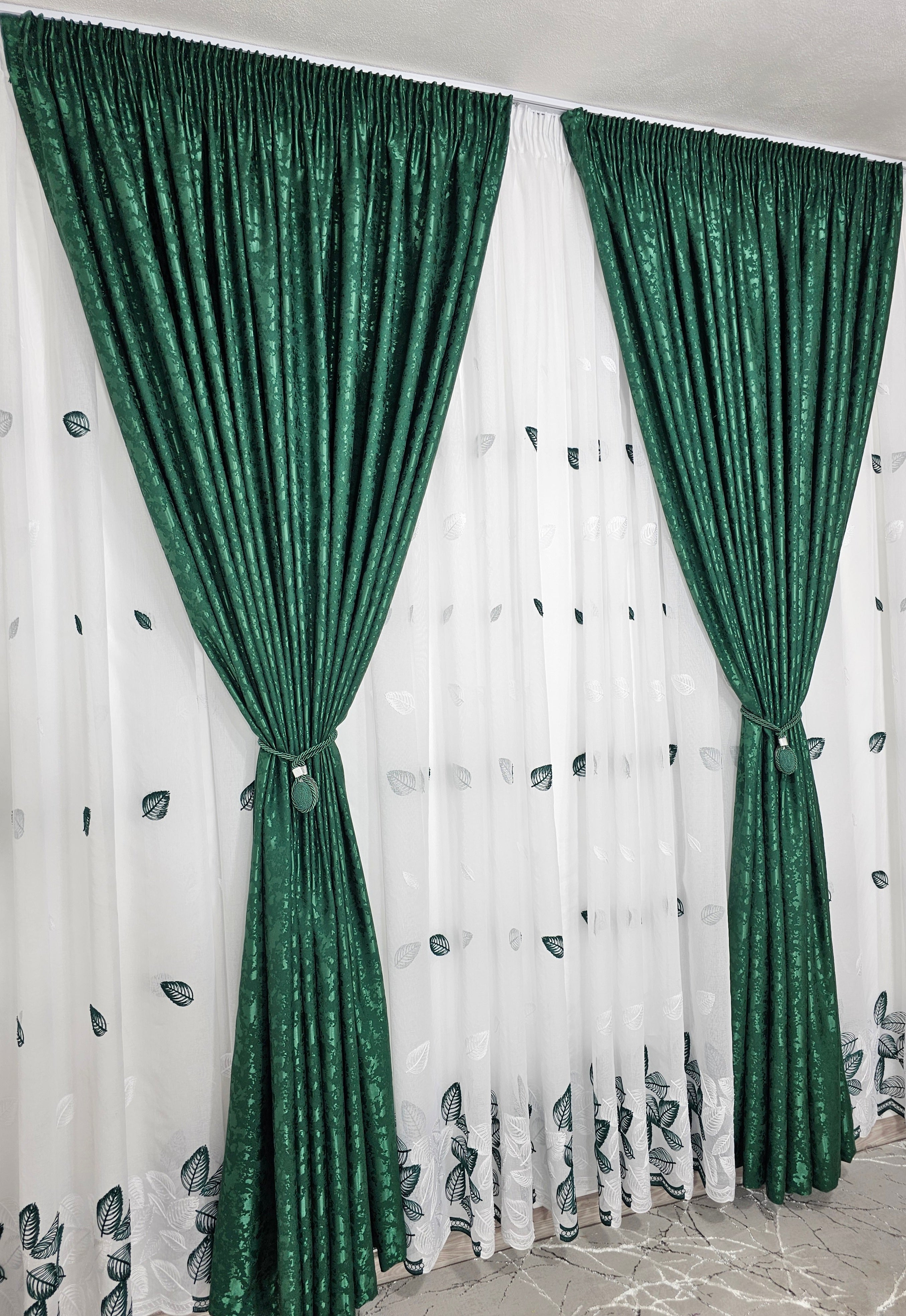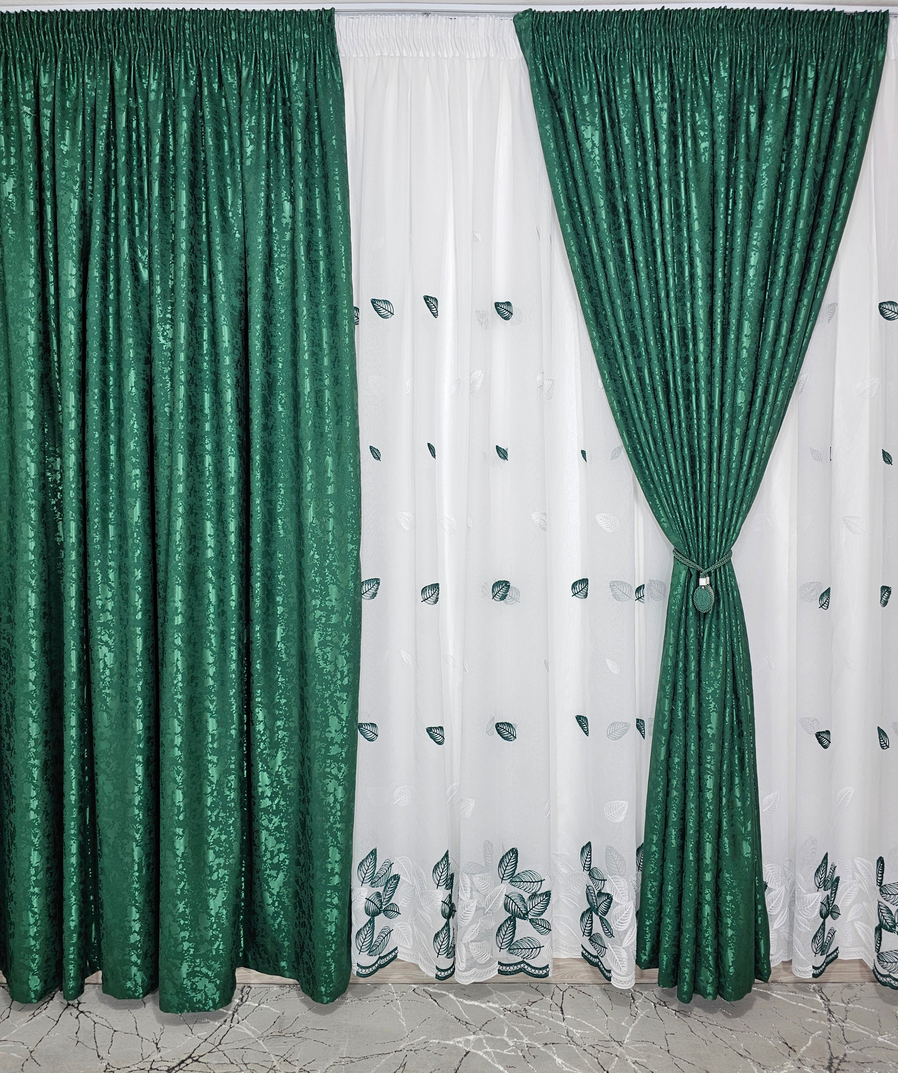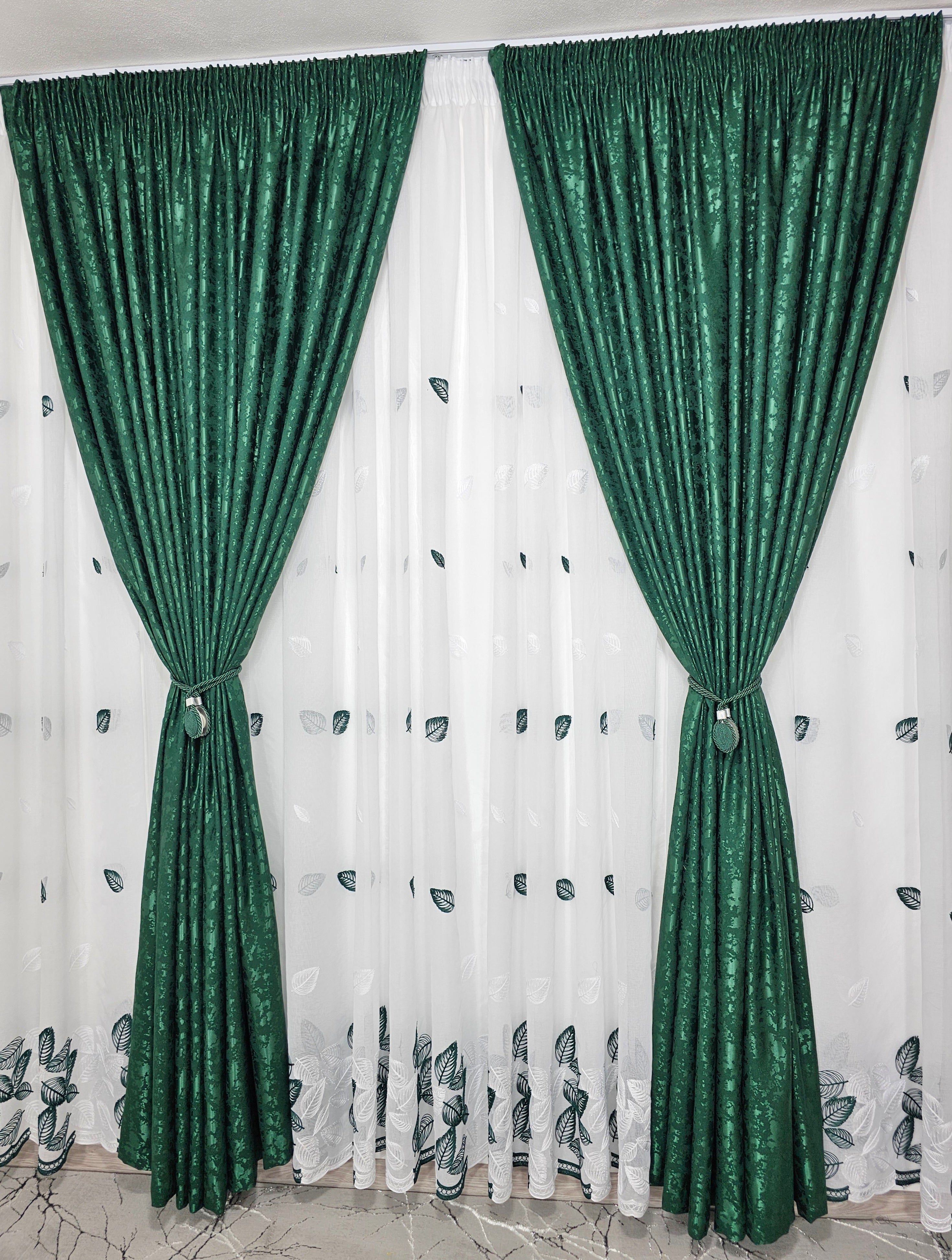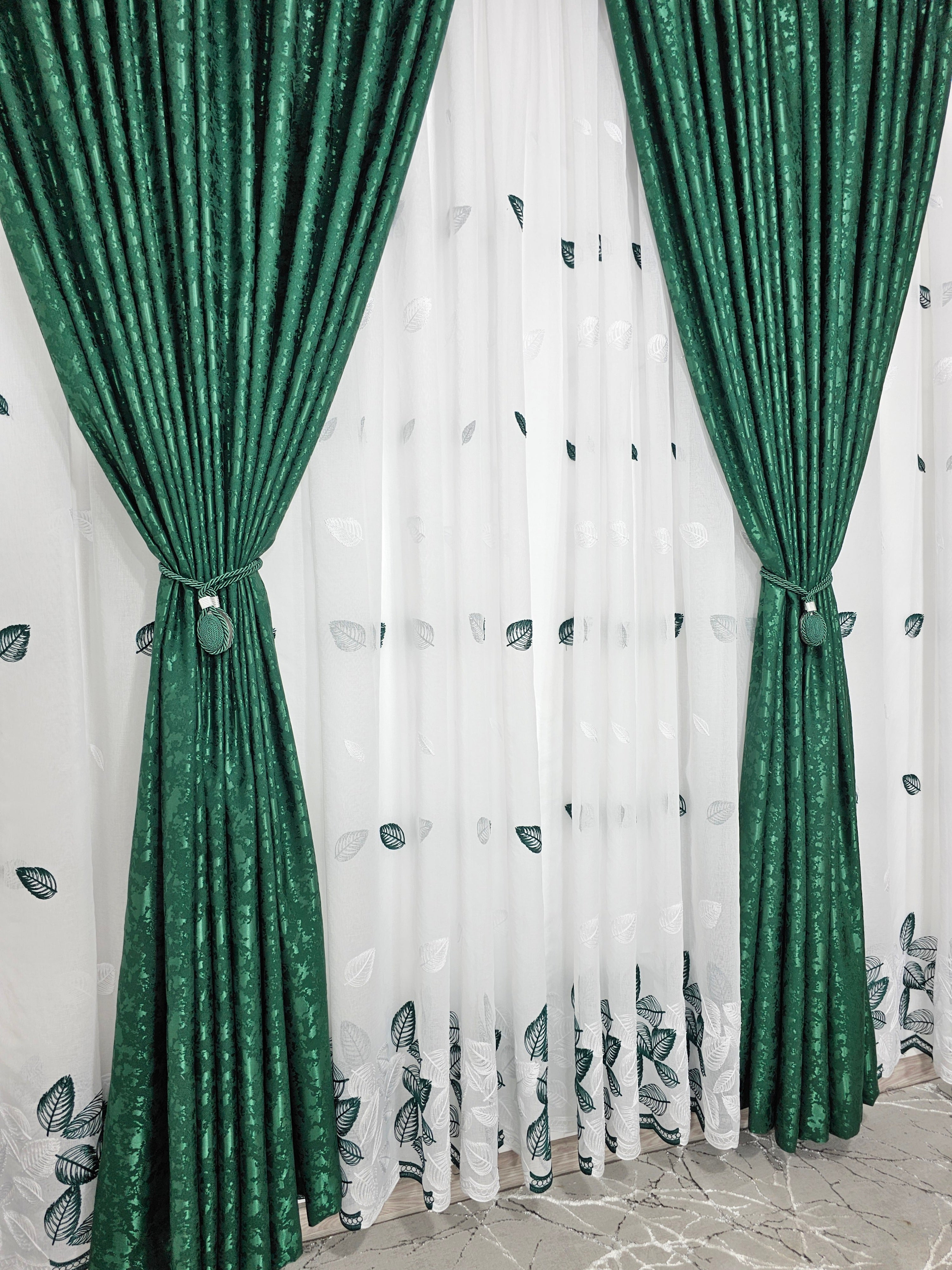 Prin designul cu frunze verzi și textura plină tip in, această perdea creează un ambient natural, relaxant și plin de eleganță.