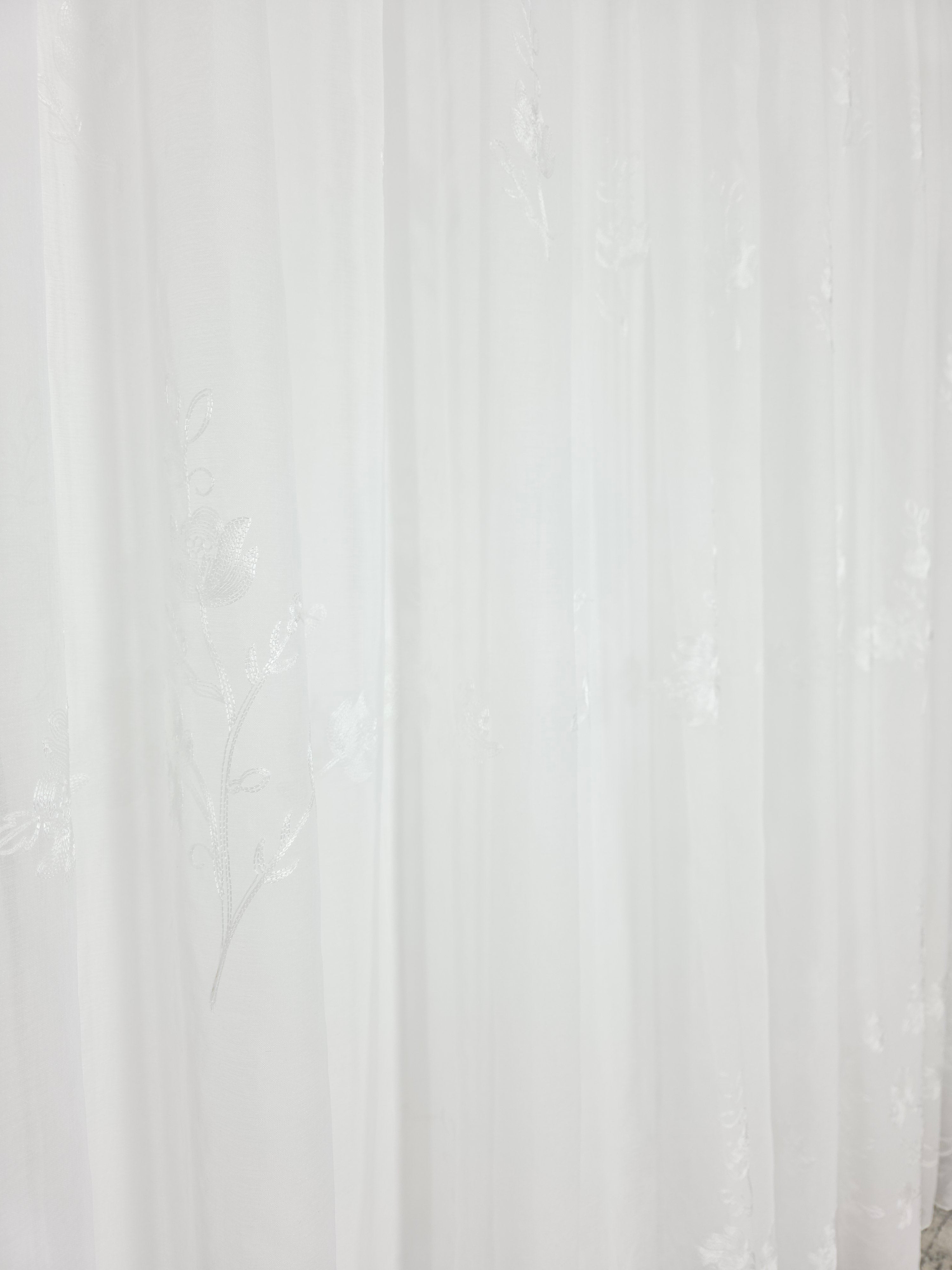 Această perdea albă este realizată din poliester de calitate, conceput pentru a imita aspectul natural al inului, oferind o textură plină și densă. Modelul floral delicat adaugă un plus de rafinament, creând un efect decorativ subtil și elegant.