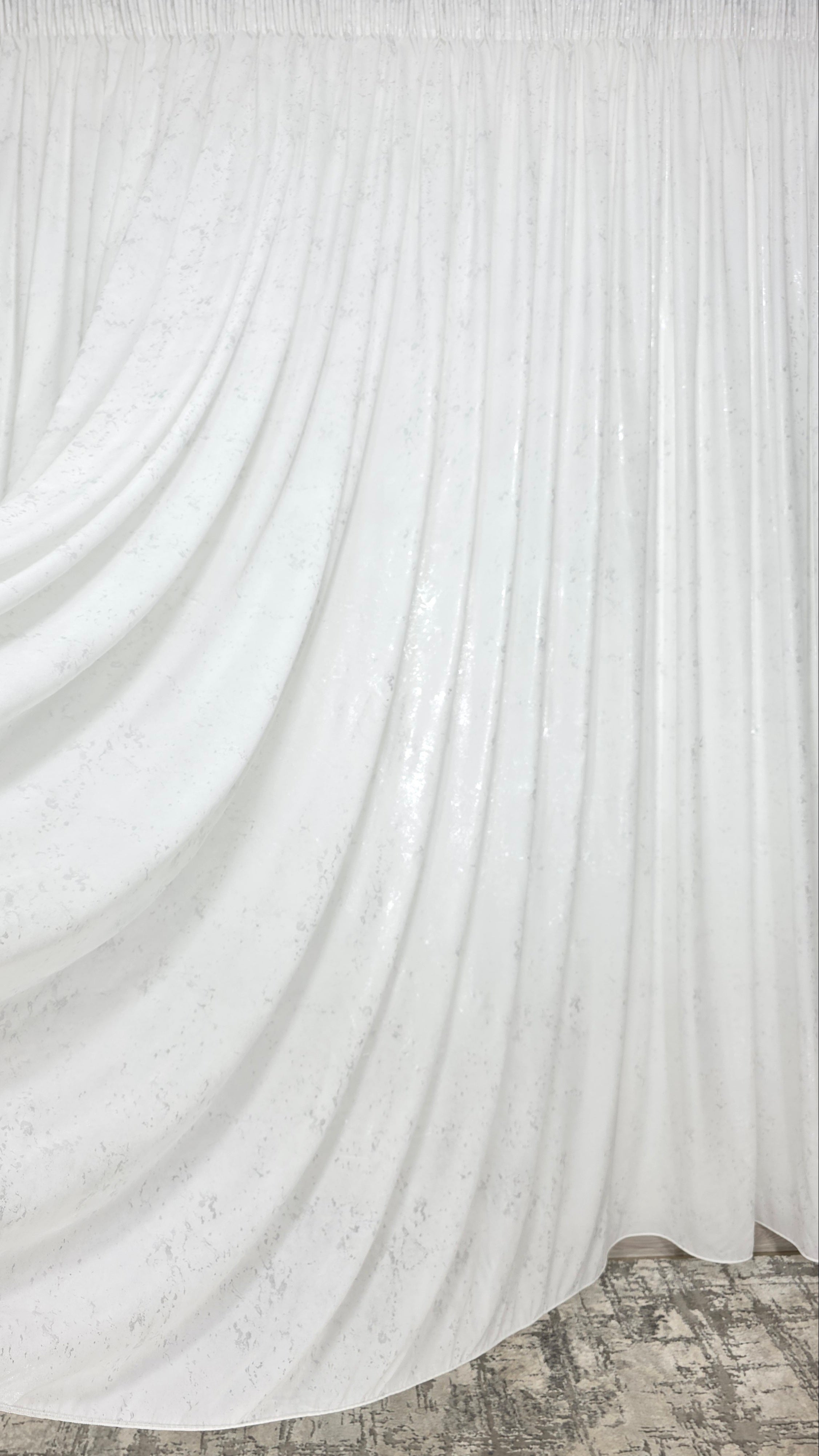 Perdea din Mătase Moale Albă cu Inserții Argintii pe Toată Suprafața – Strălucire Continuă și Opacitate Ridicată pentru Ferestre Prețioase