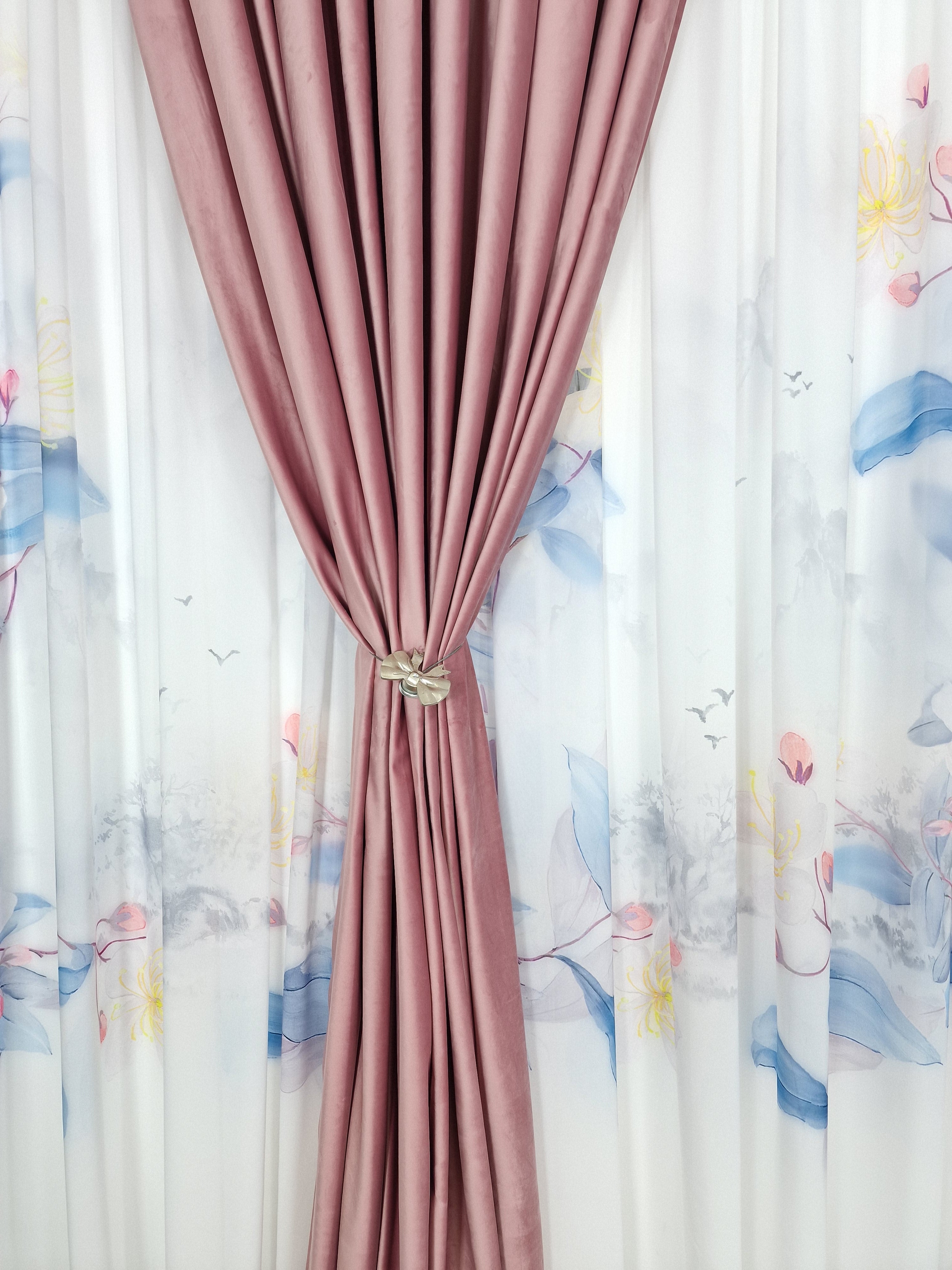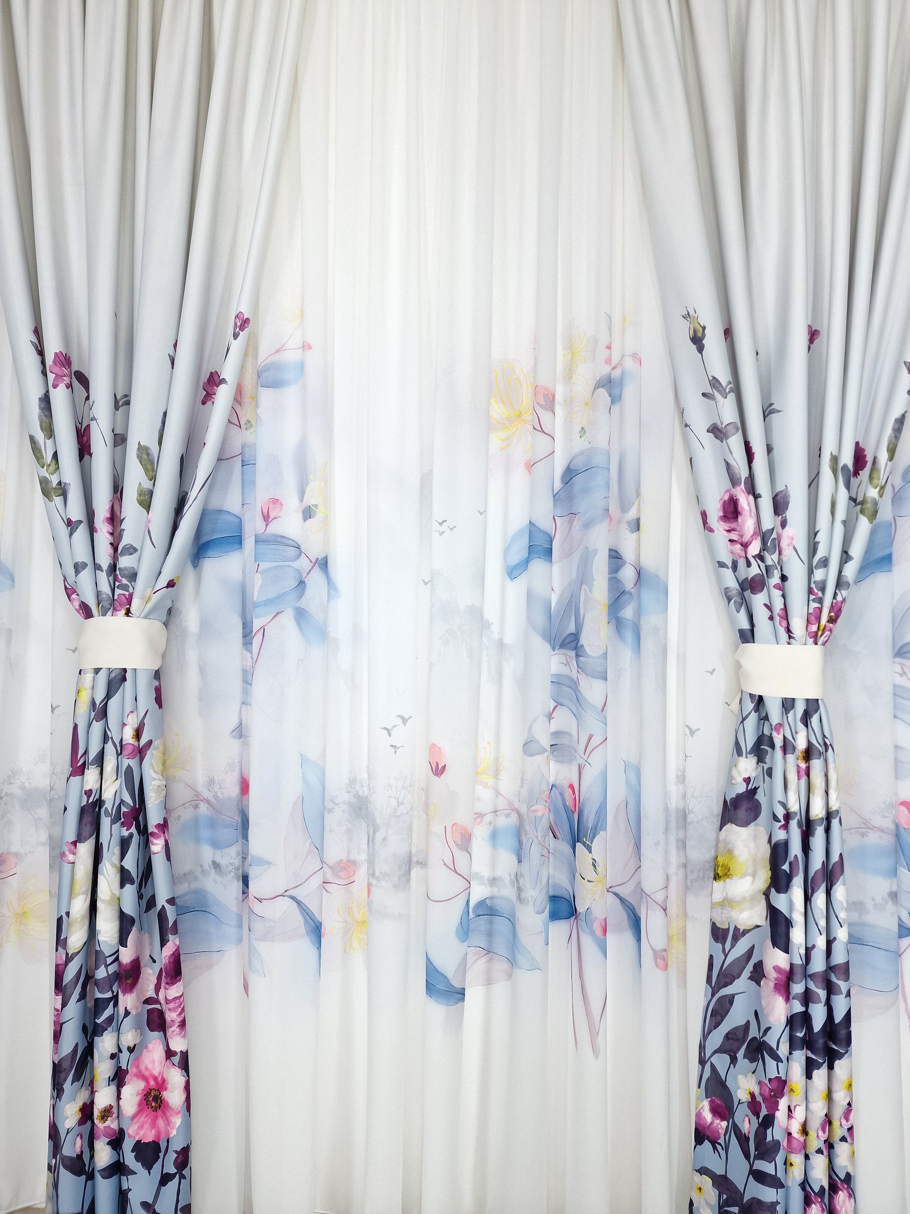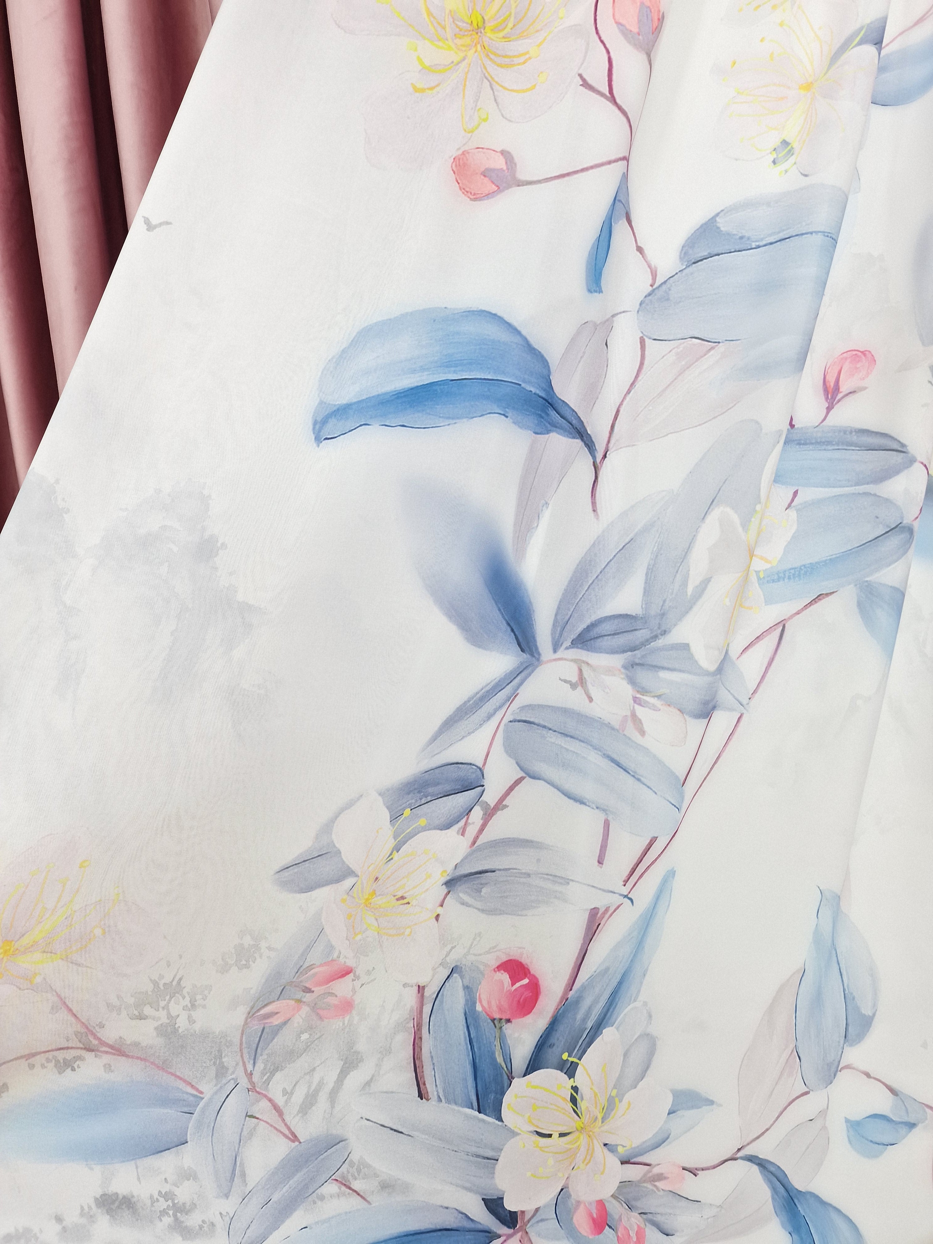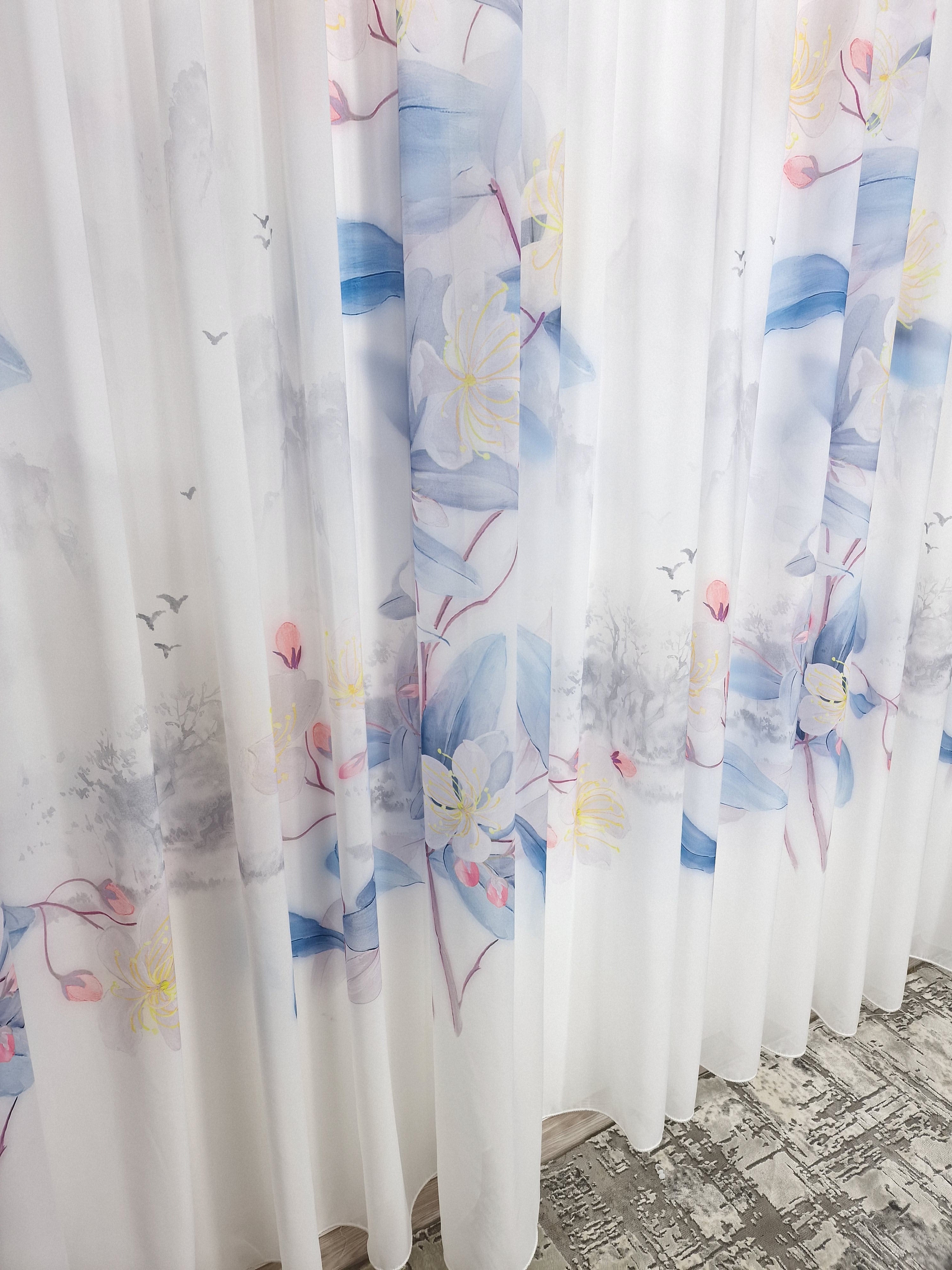 Transformă-ți locuința într-un paradis floral cu acest set uimitor format din perdele din mătase cu un model cu flori în culori de albastru, galben și roz. Aceste perdele îmbină eleganța și frumusețea naturală a florilor, creând un decor rafinat și plin de prospețime.