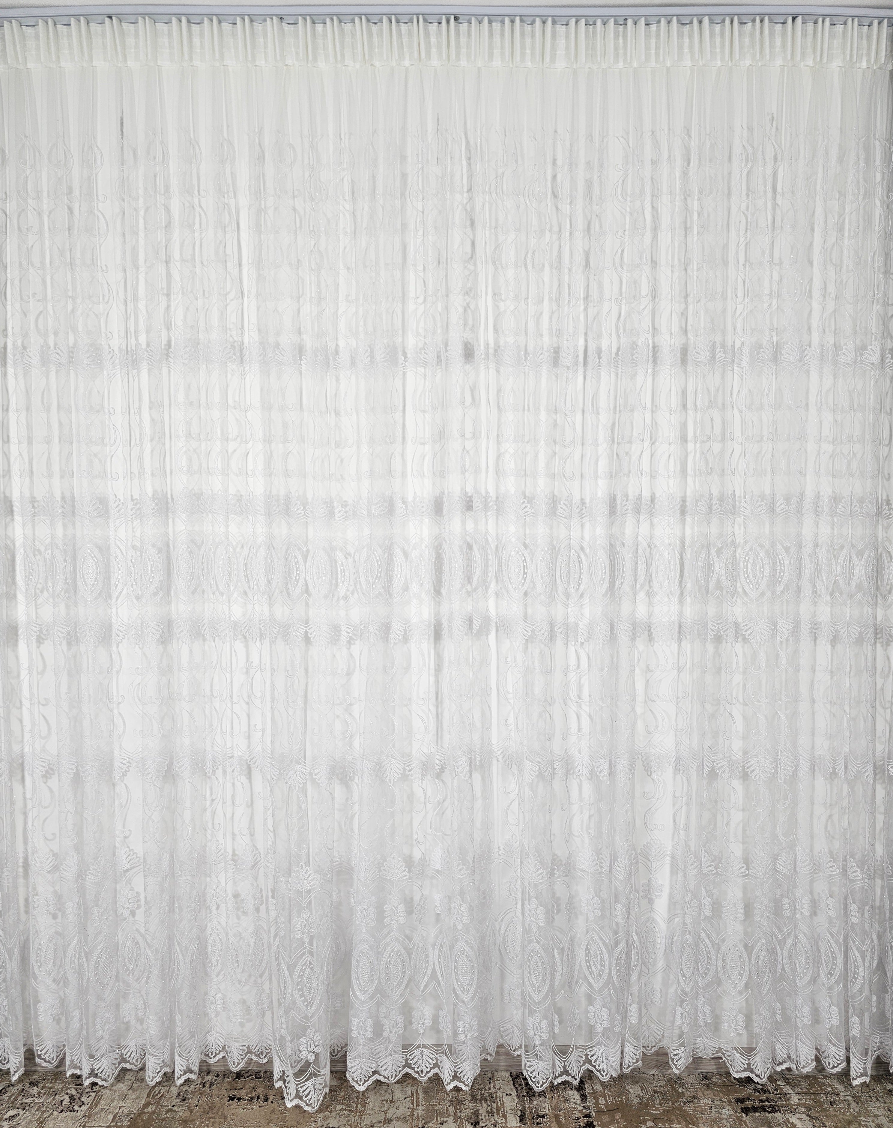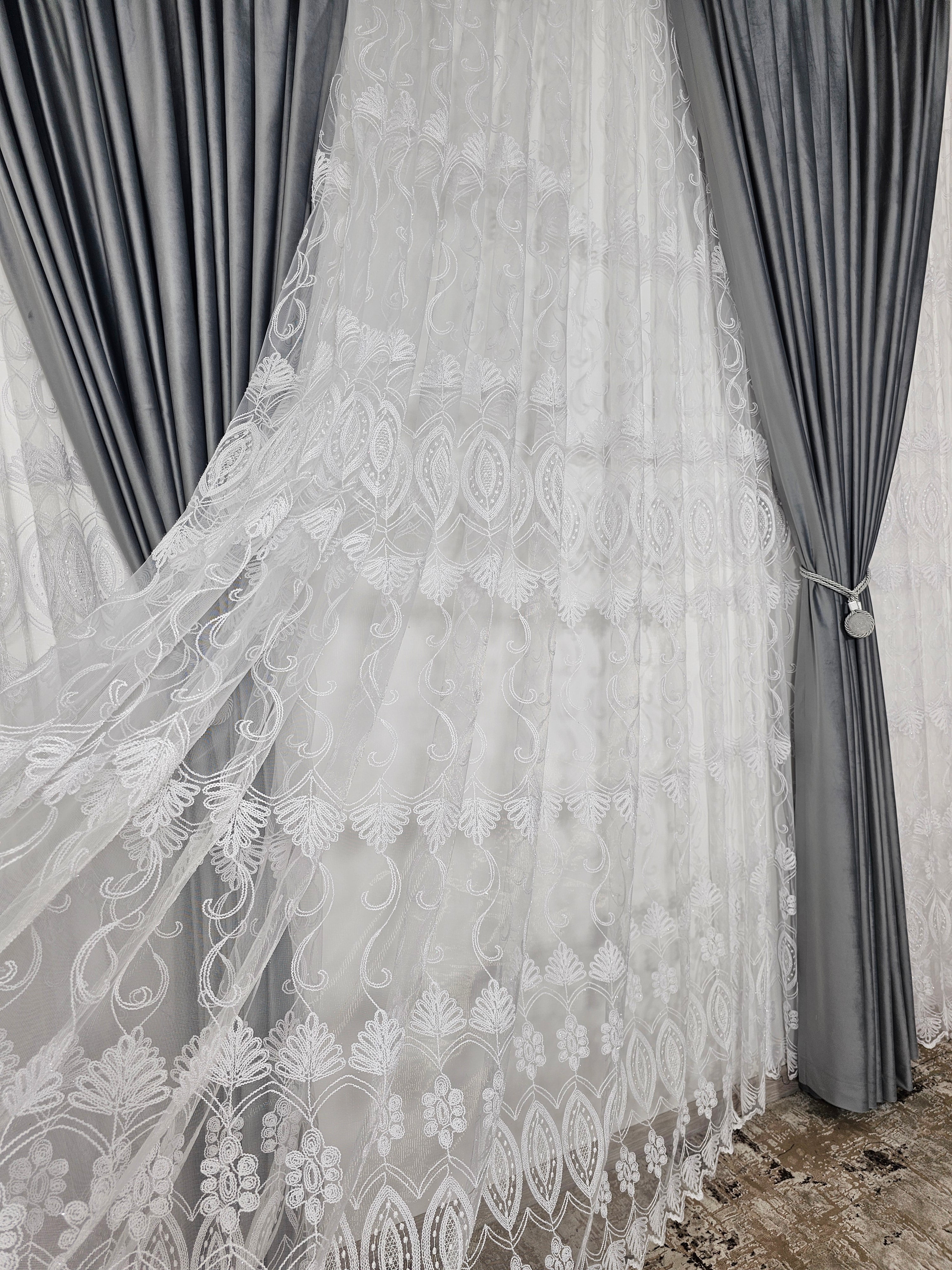 Perdeaua este realizată din material tip tul (imitație din poliester 100%), fin și transparent, decorat cu broderie albă rafinată. Această combinație oferă un aer proaspăt și luminos încăperii, păstrând în același timp o notă elegantă și sofisticată.
