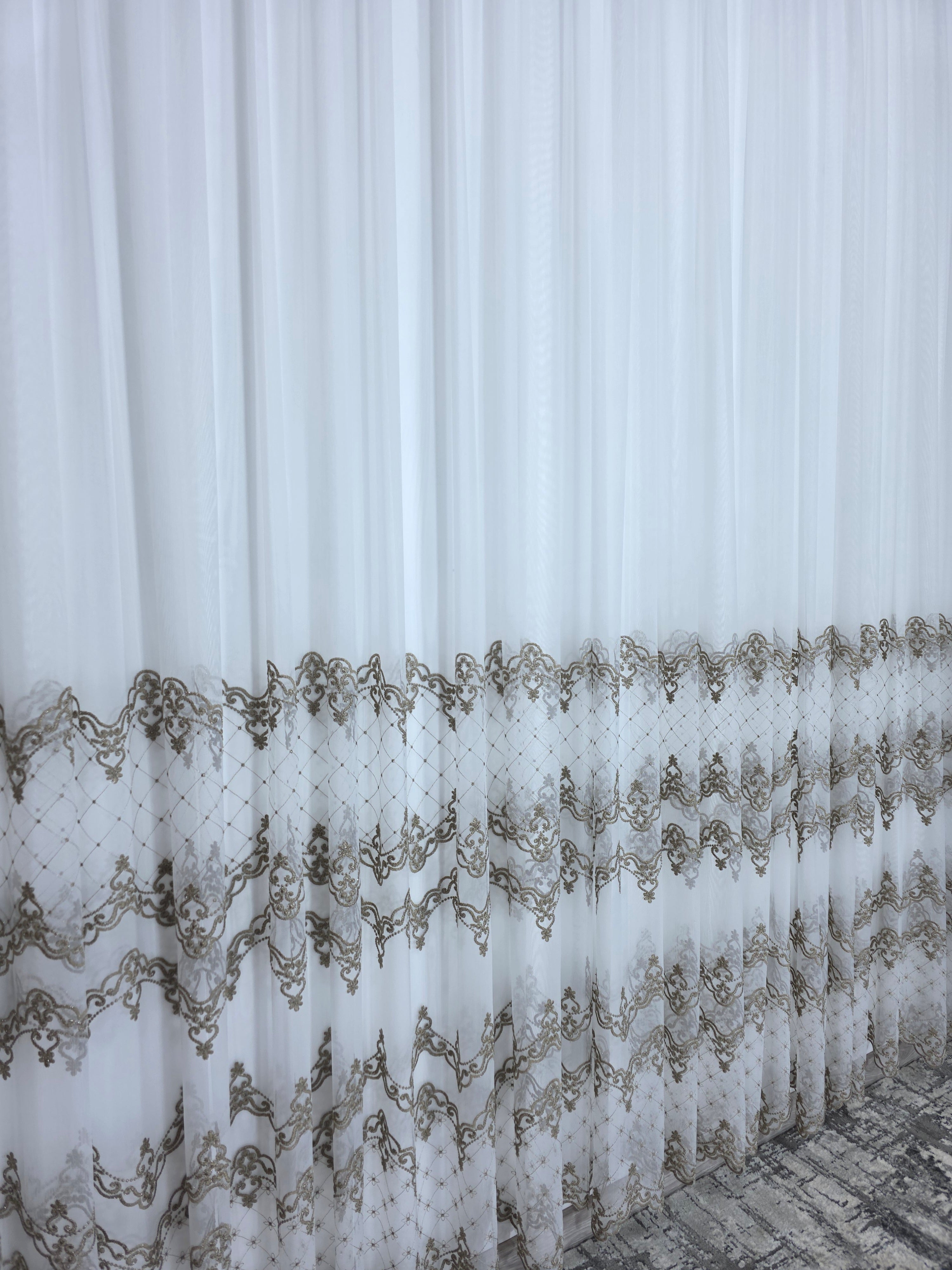 Această perdea este confecționată din poliester de calitate, special prelucrat pentru a imita aspectul natural al bamboo-ului, având o textură plină și densă ce transmite rafinament și căldură vizuală. Broderia crem, delicată și fin lucrată, adaugă un plus de eleganță și stil, creând un efect decorativ subtil și armonios.
