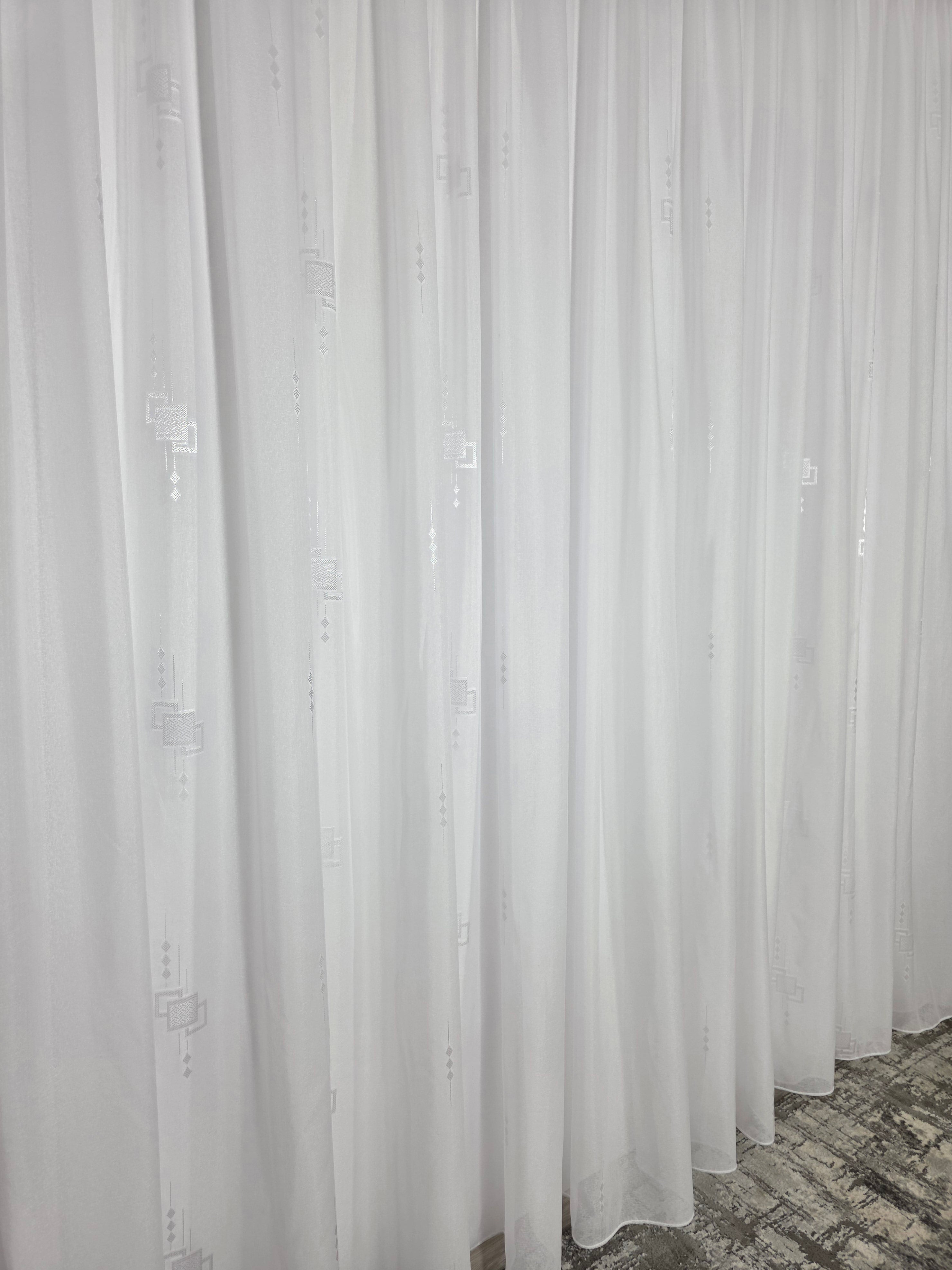 Perdeaua Alina albă cu forme geometrice alb pe alb transformă ferestrele într-un element decorativ sofisticat, aducând echilibru și eleganță naturală casei tale.