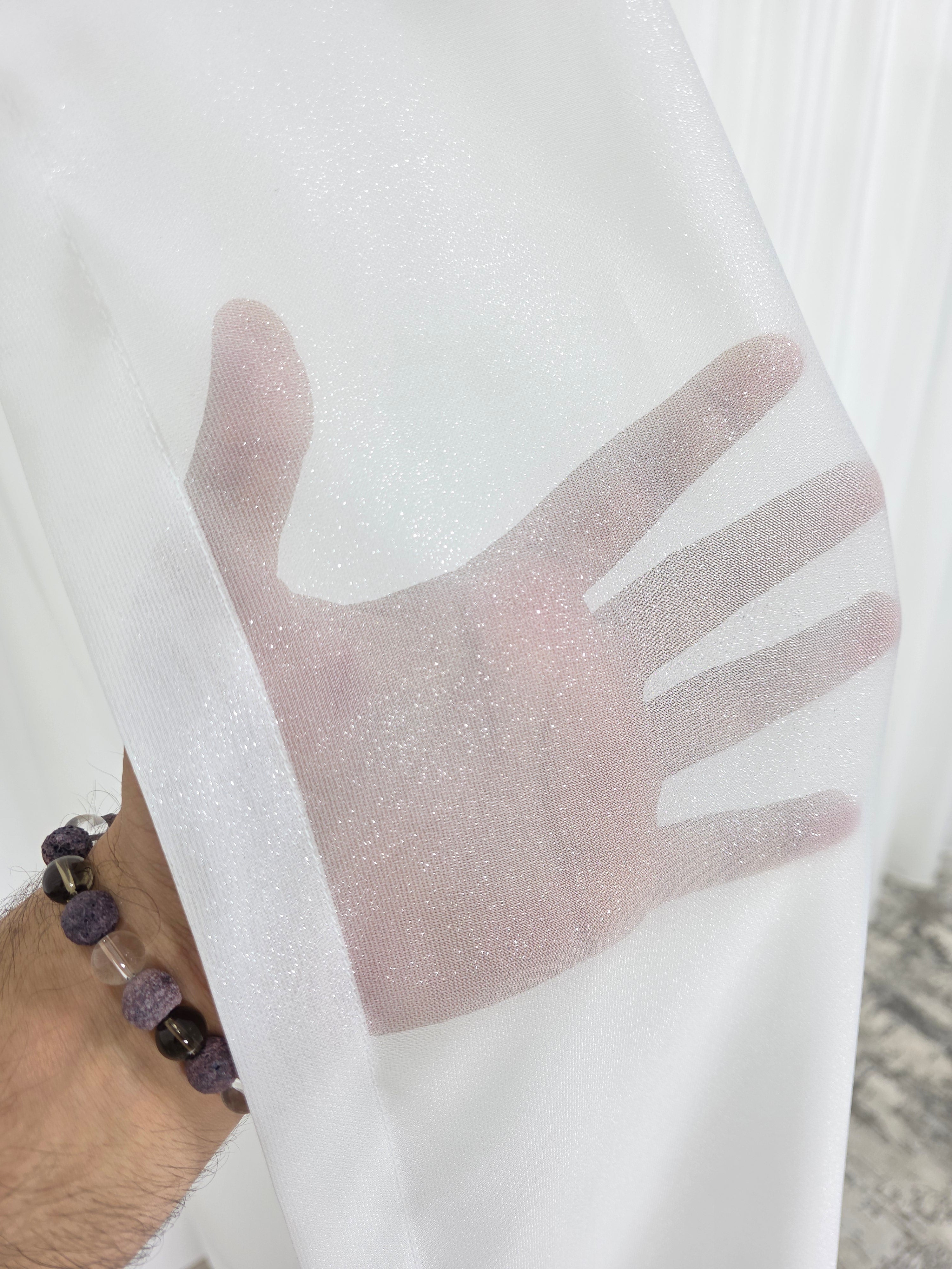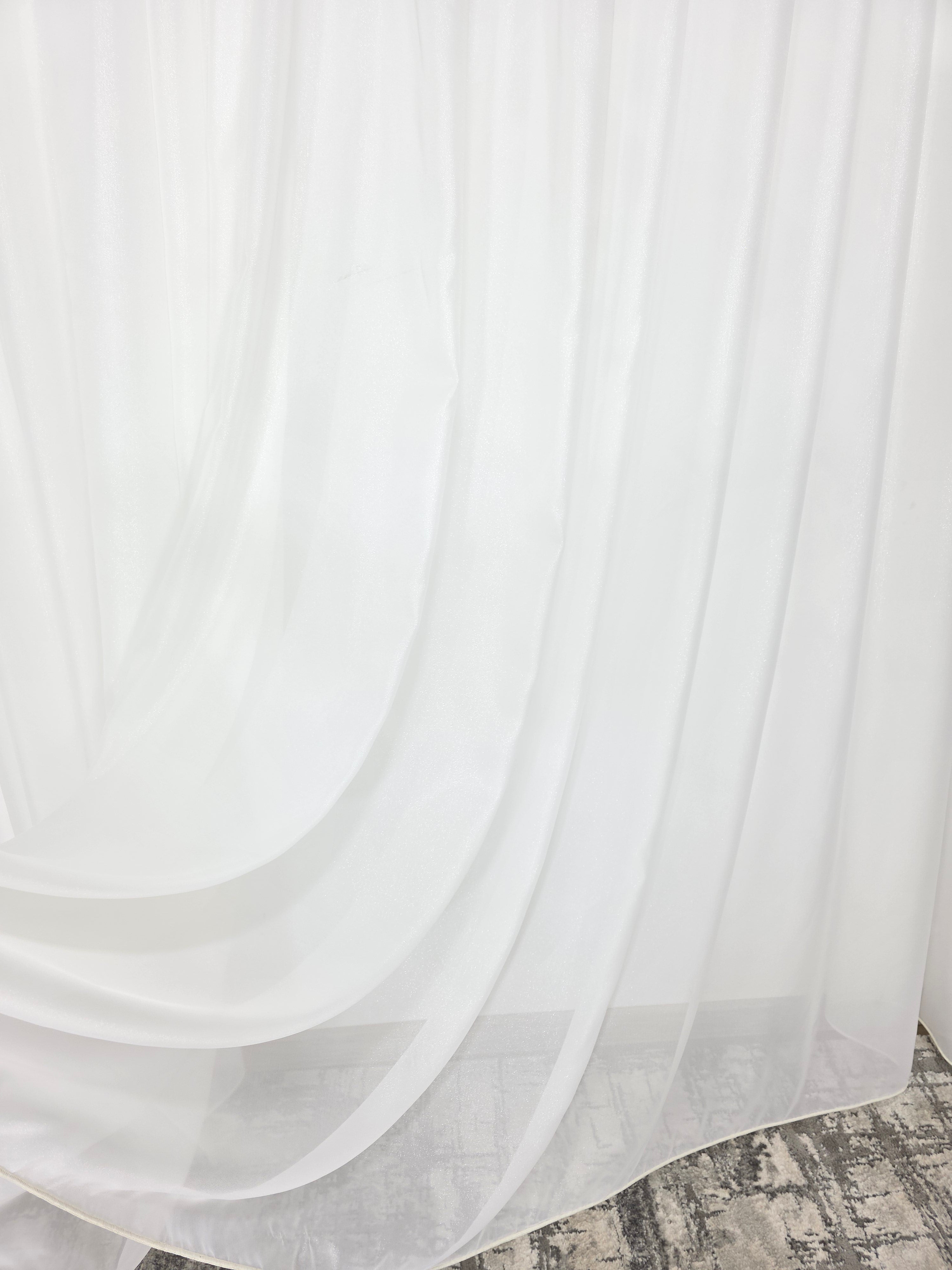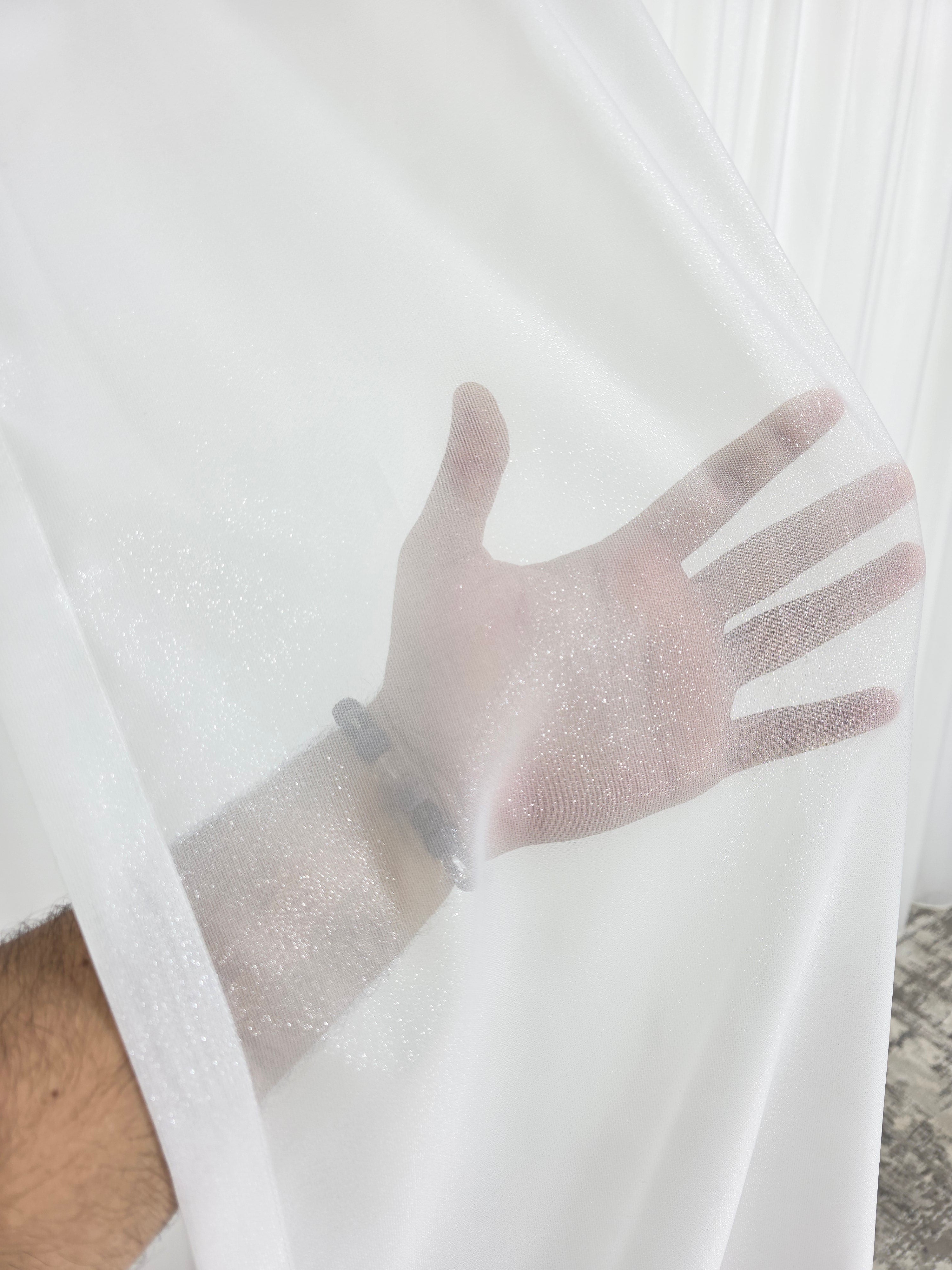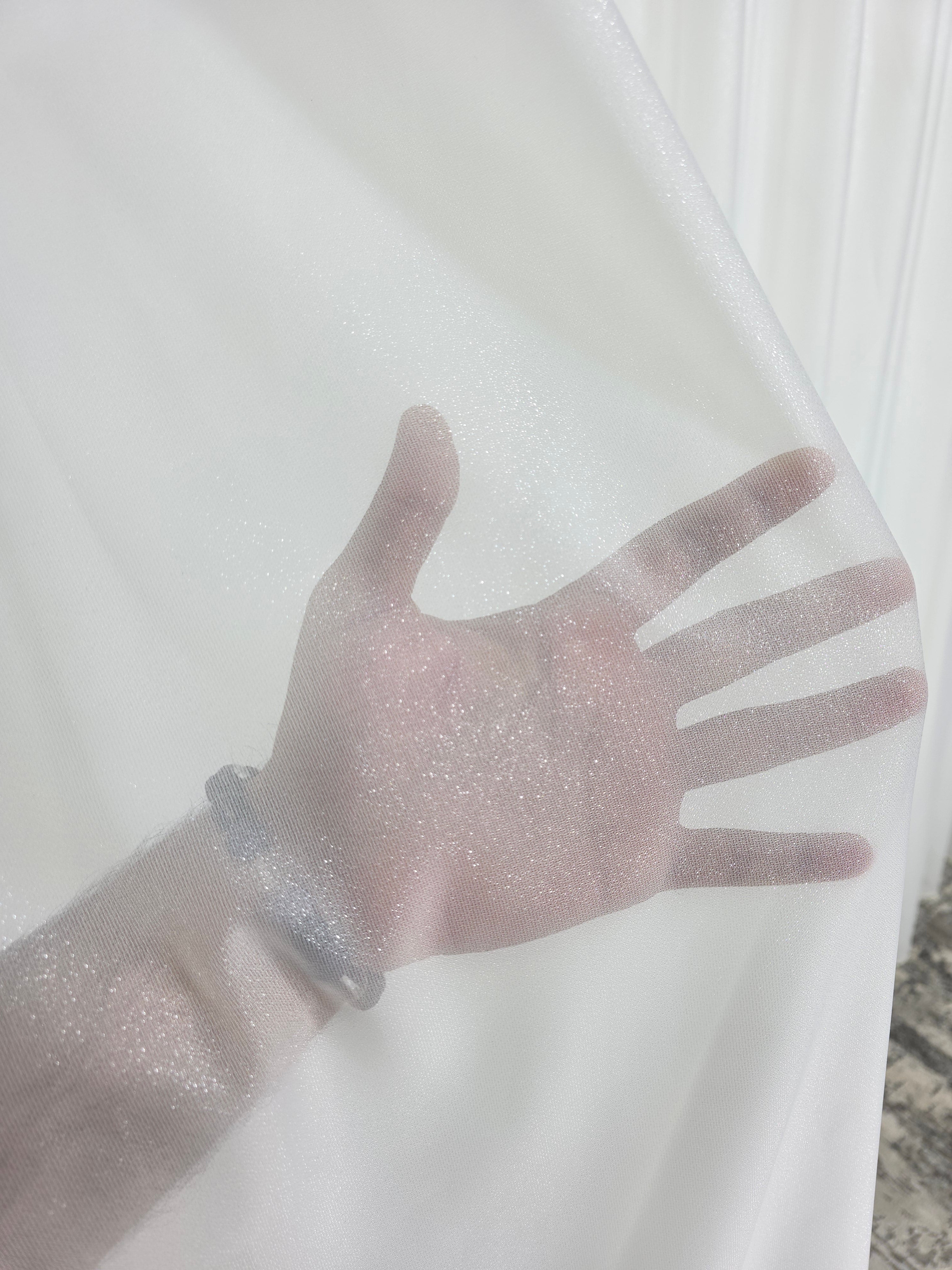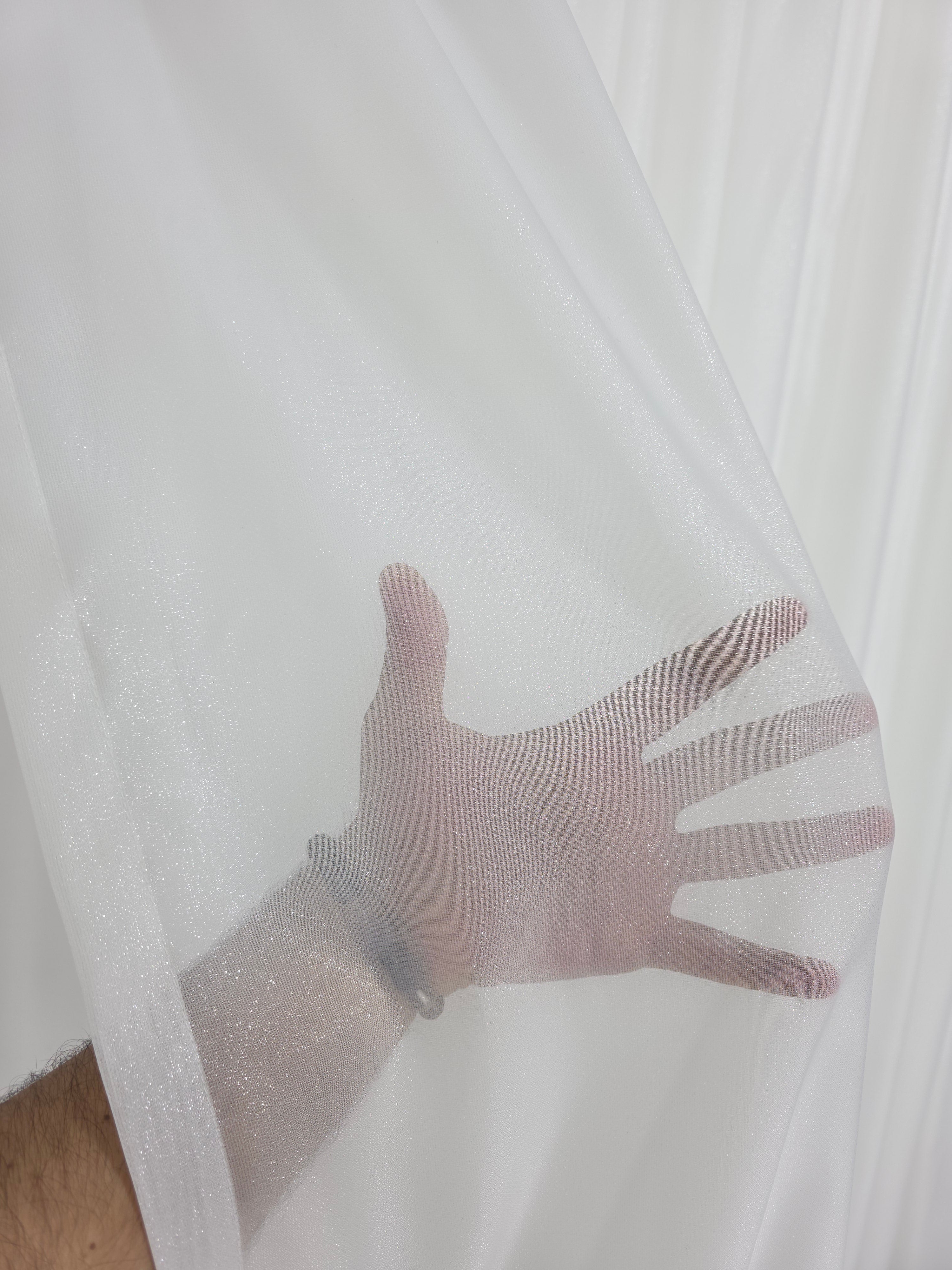 Această perdea crem este realizată din poliester de calitate, având o textură plină și densă ce conferă un aspect bogat și rafinat. Inserțiile fine de sclipici discret adaugă un efect subtil de luminozitate, creând reflexii elegante în lumină.