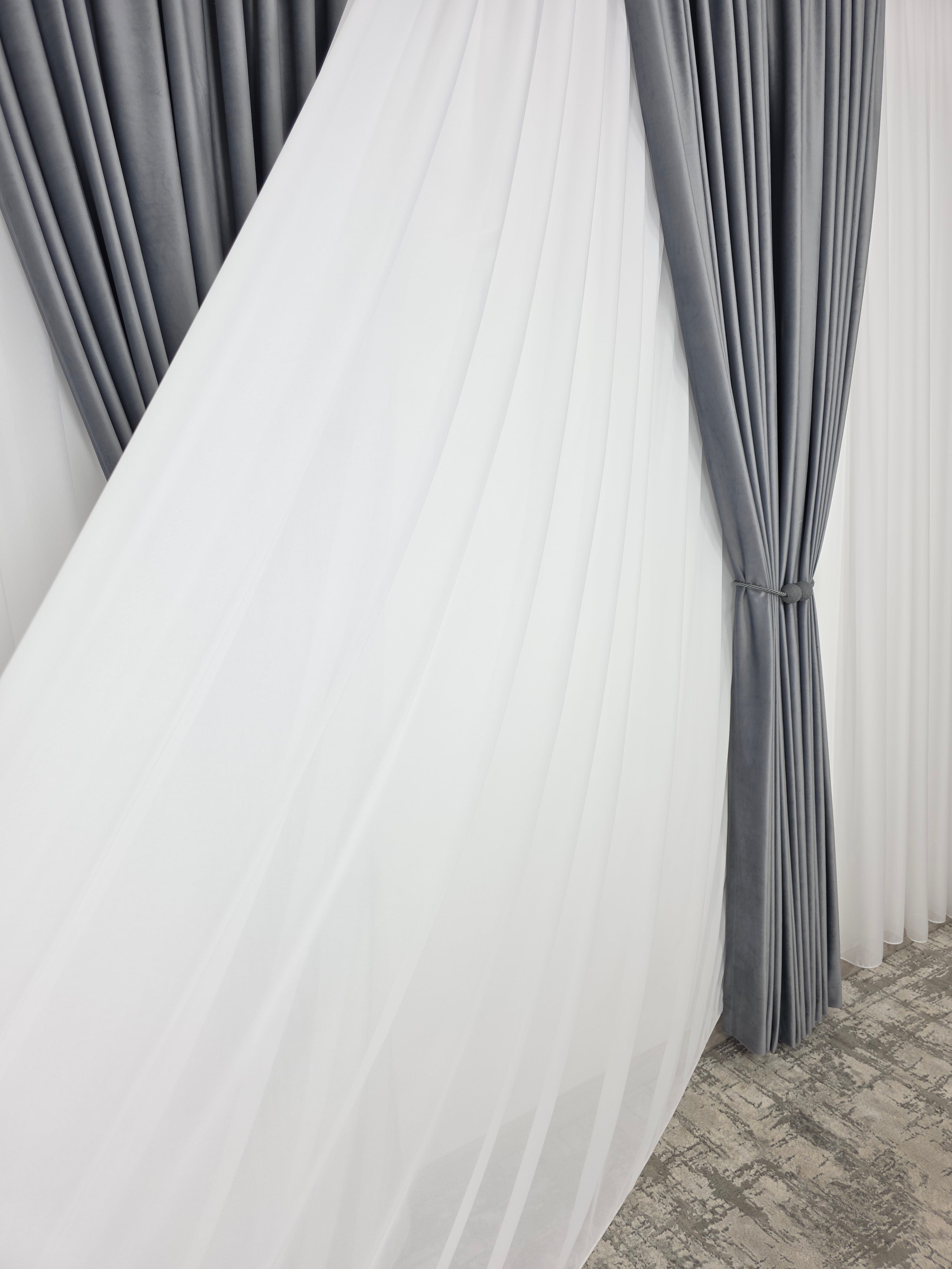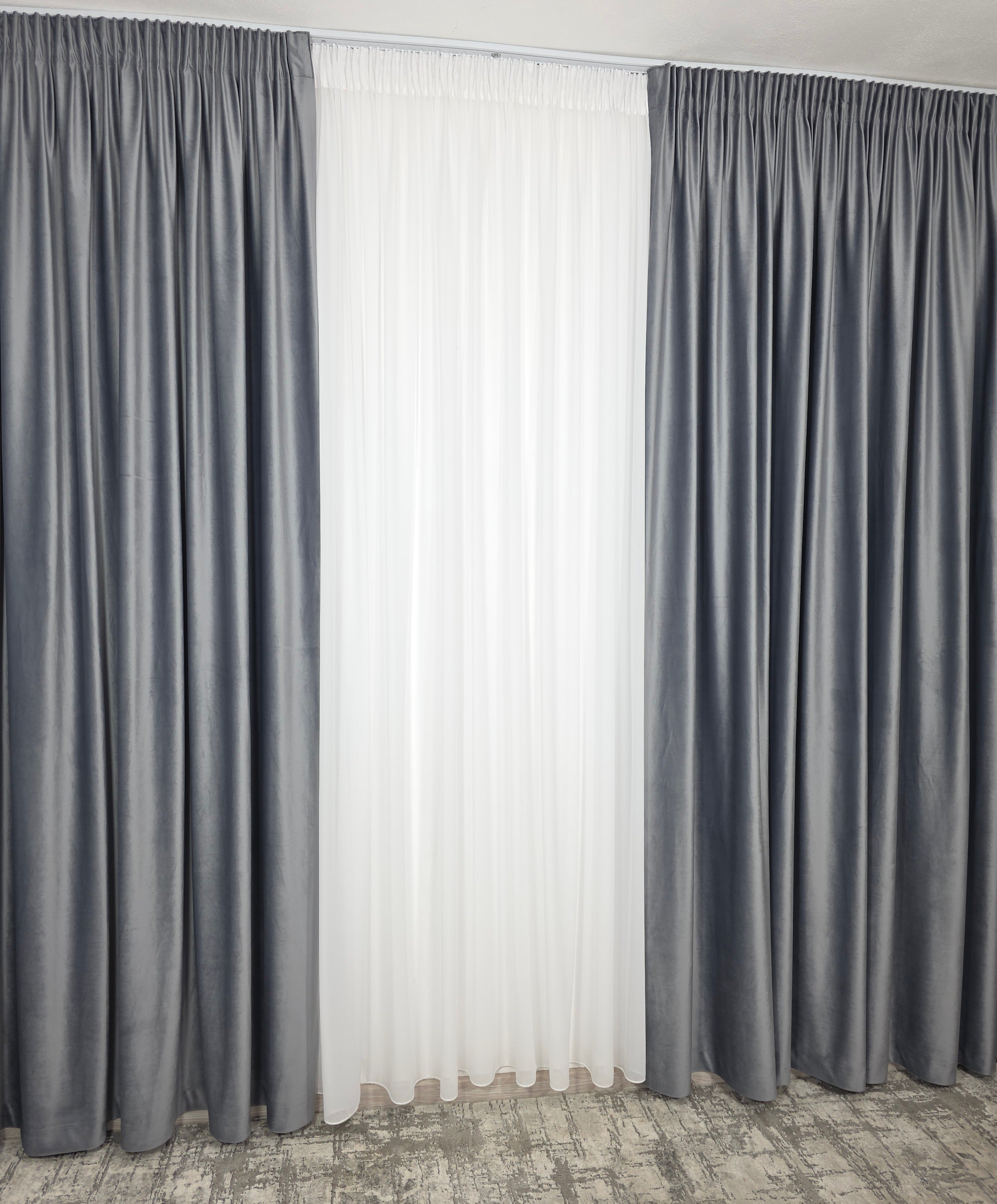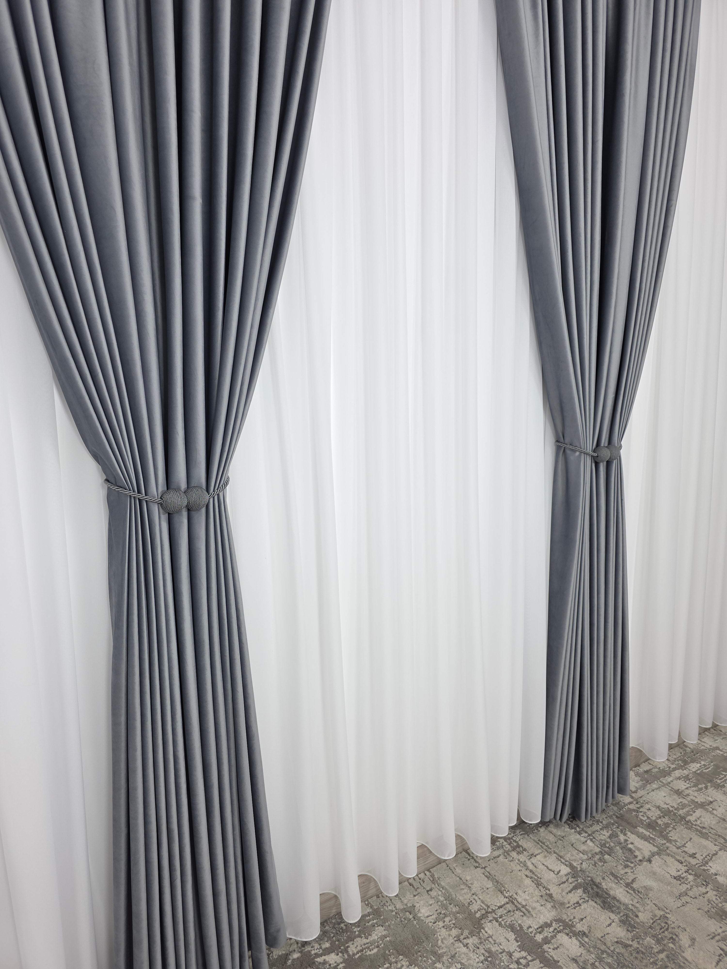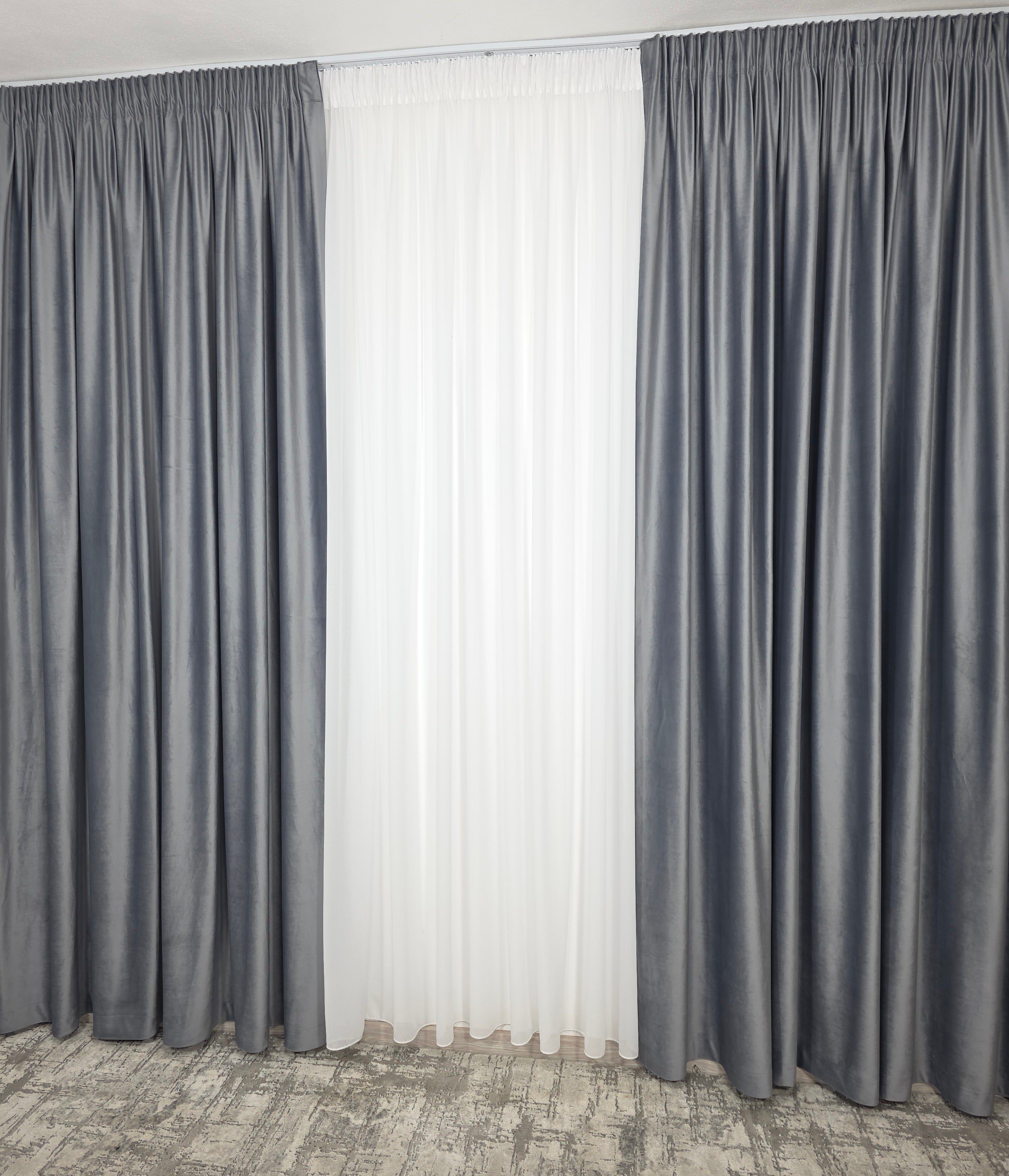 Un duo atemporal ce îmbină lejeritatea voalului alb cu rafinamentul catifelei gri – ideal pentru spații moderne, minimaliste sau clasice reinterpretate.