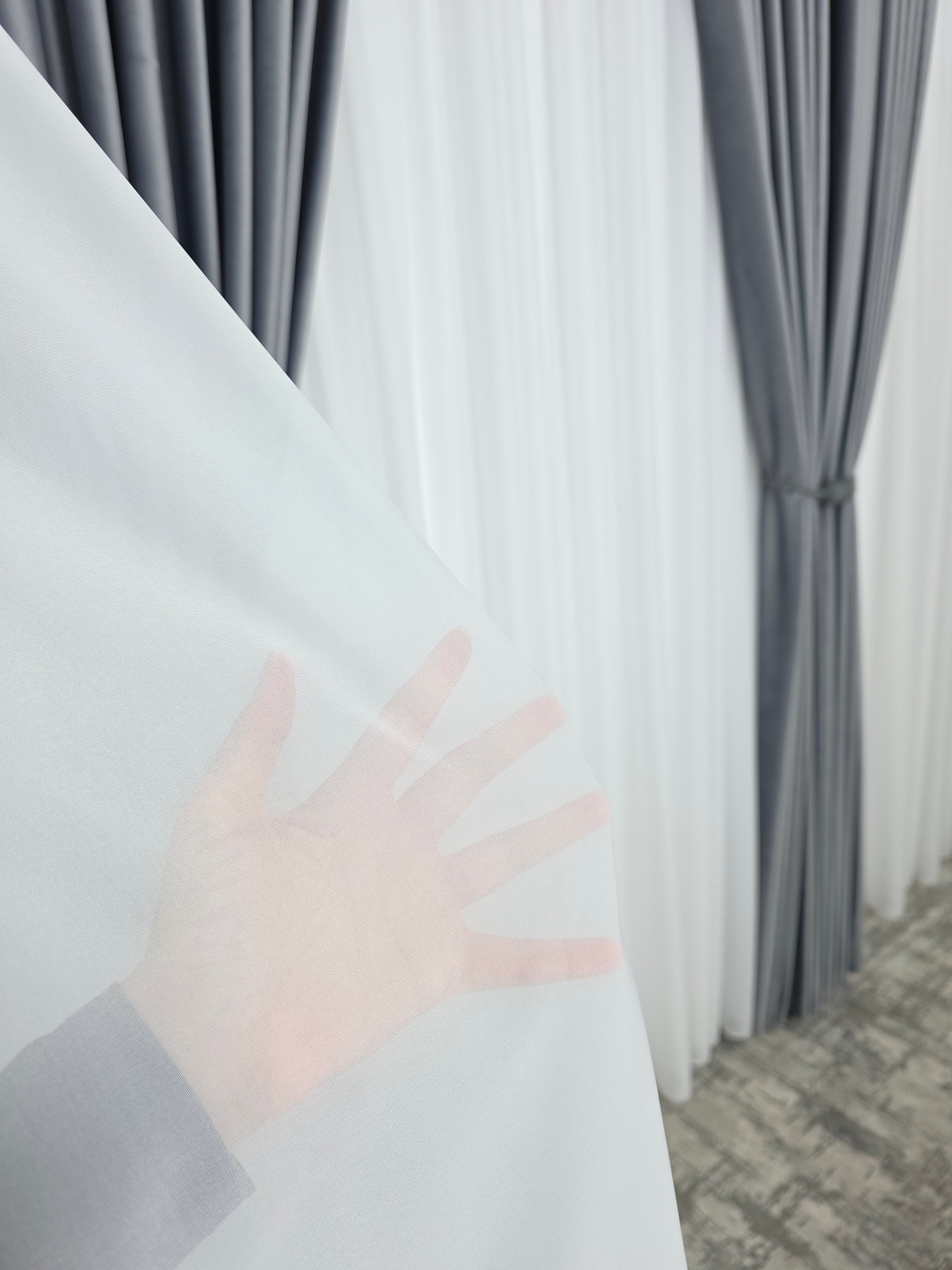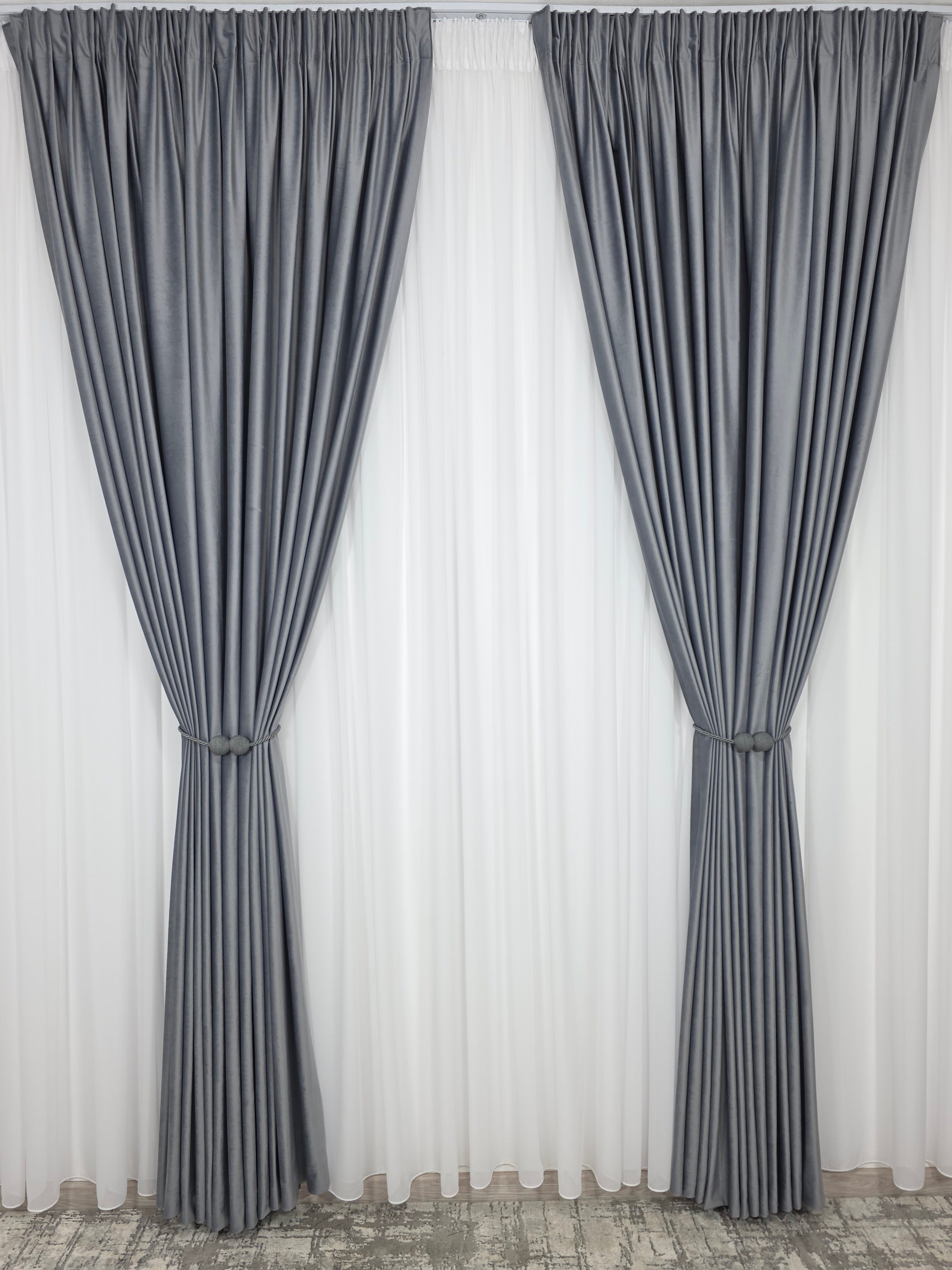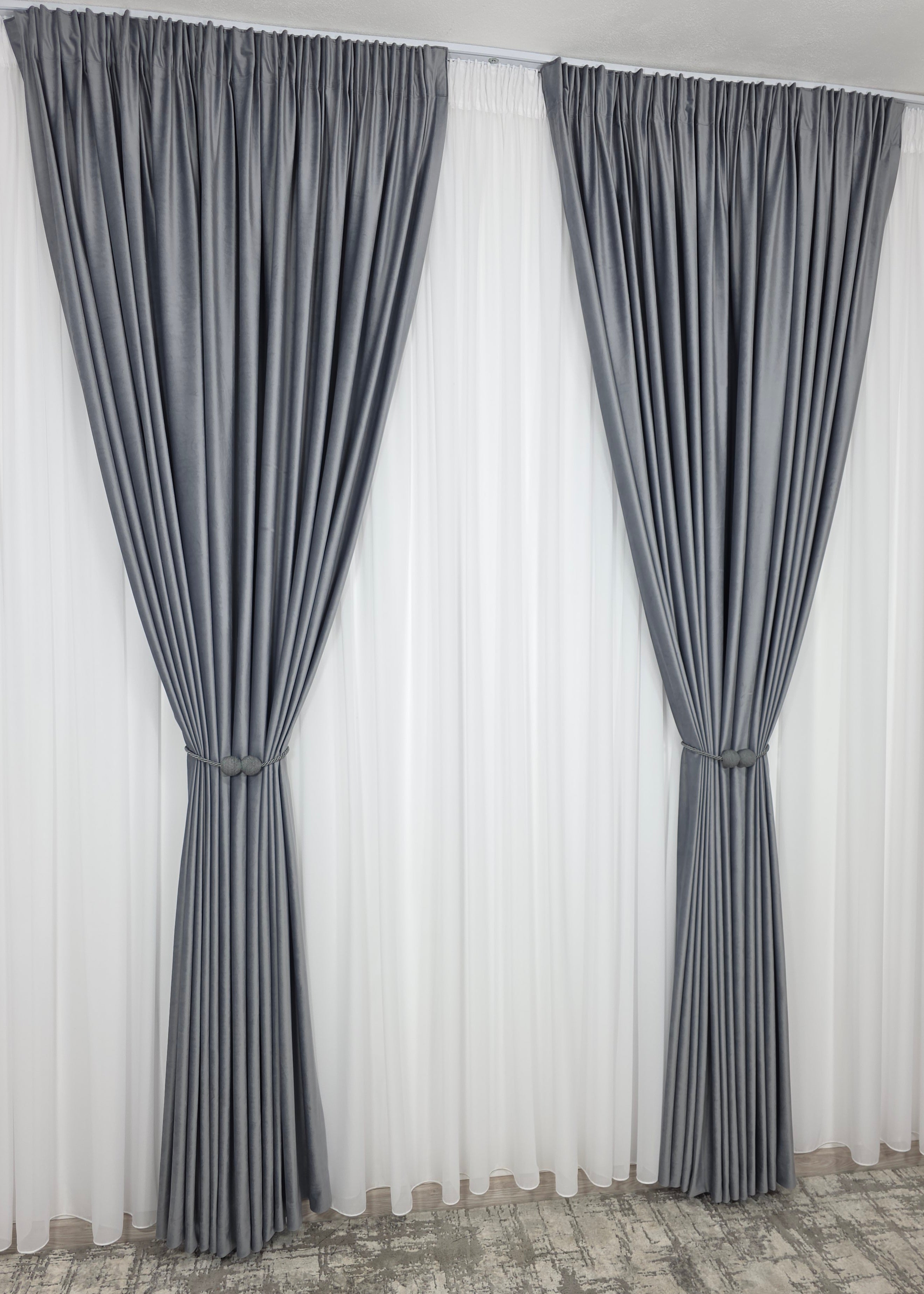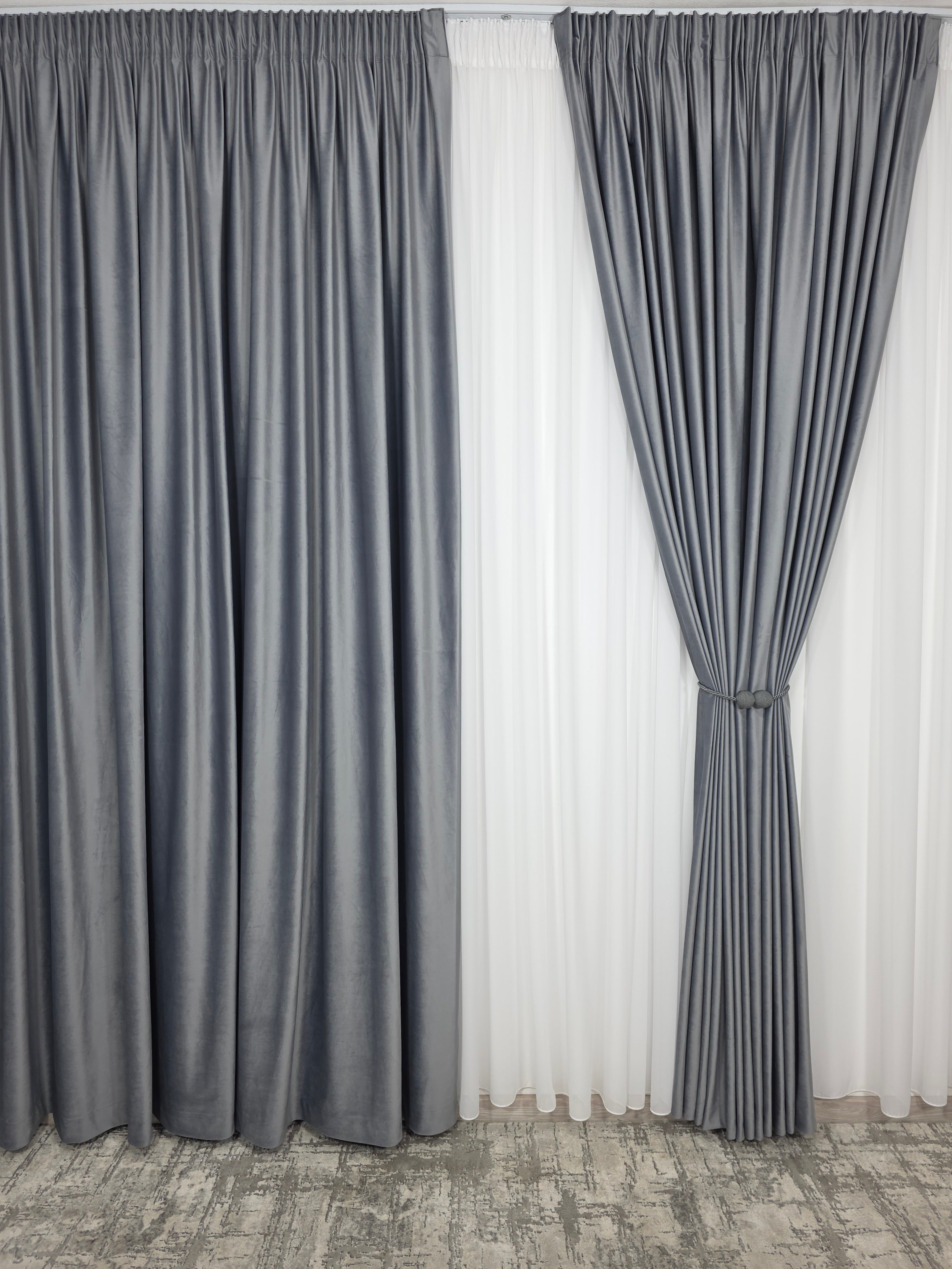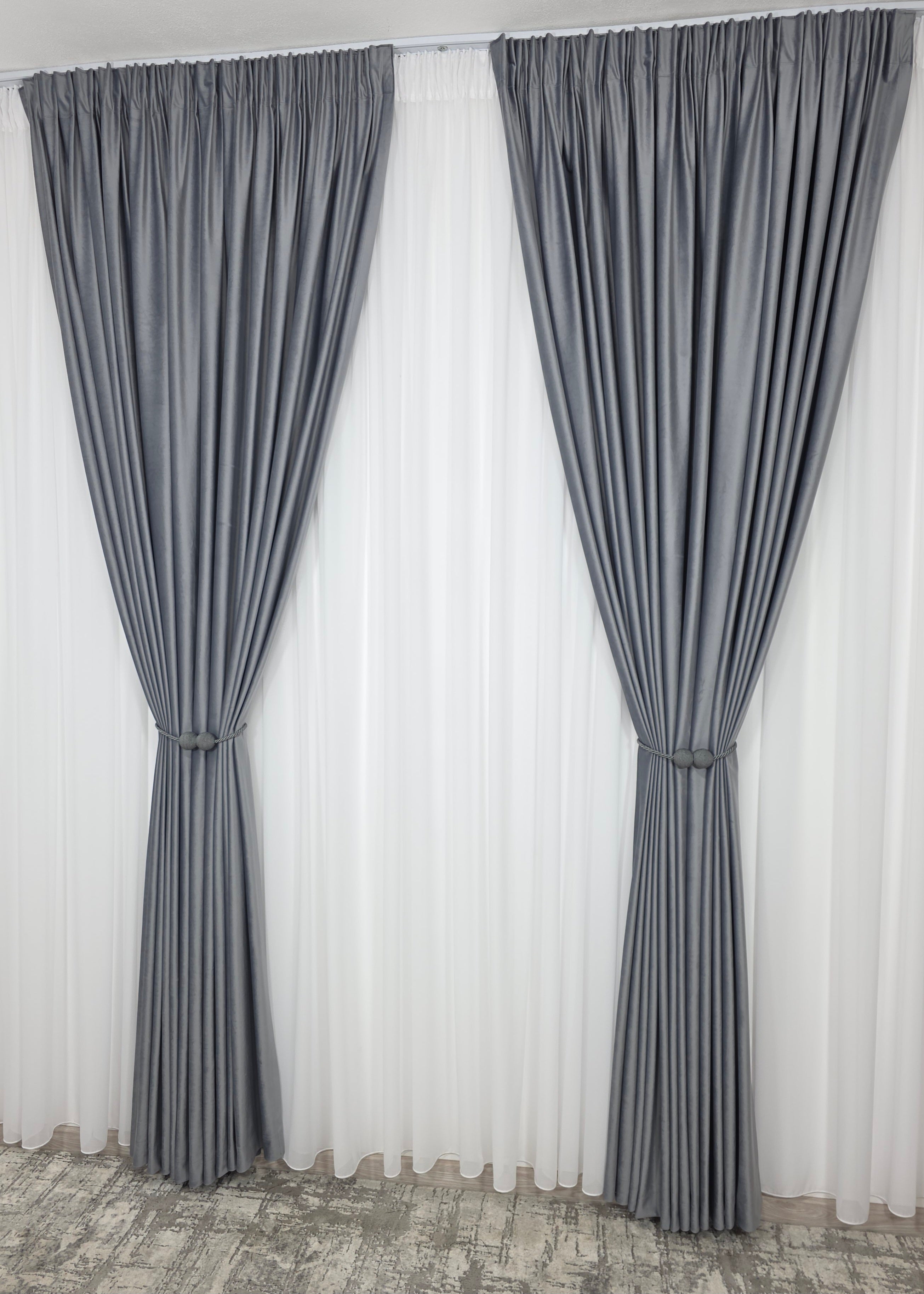 Un duo atemporal ce îmbină lejeritatea voalului alb cu rafinamentul catifelei gri – ideal pentru spații moderne, minimaliste sau clasice reinterpretate.
