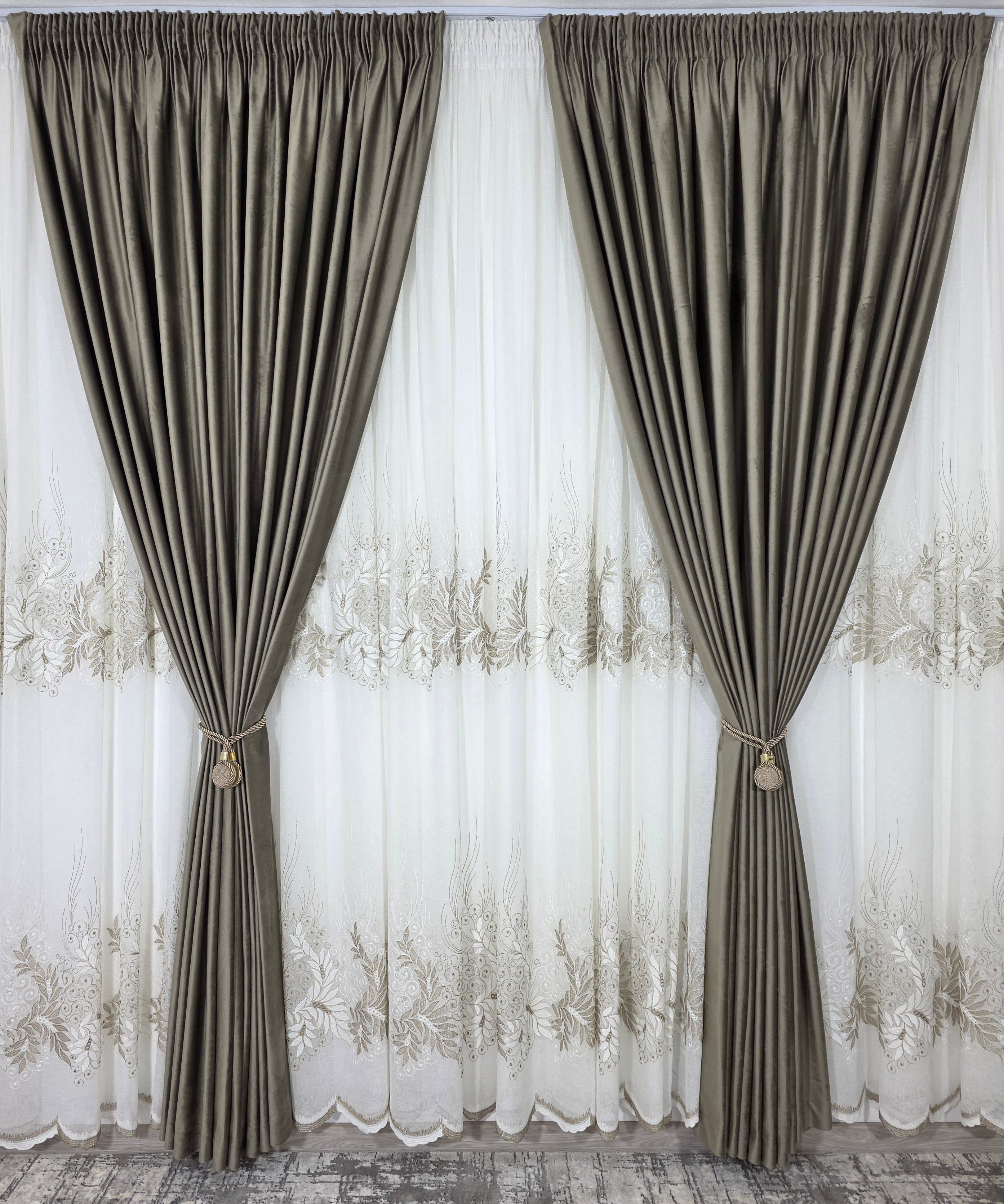 Set Perdea Ivoire din In Gros cu Broderie Bej & Draperie din Catifea Bej Închis – Rafinament Natural și Contrast Elegant