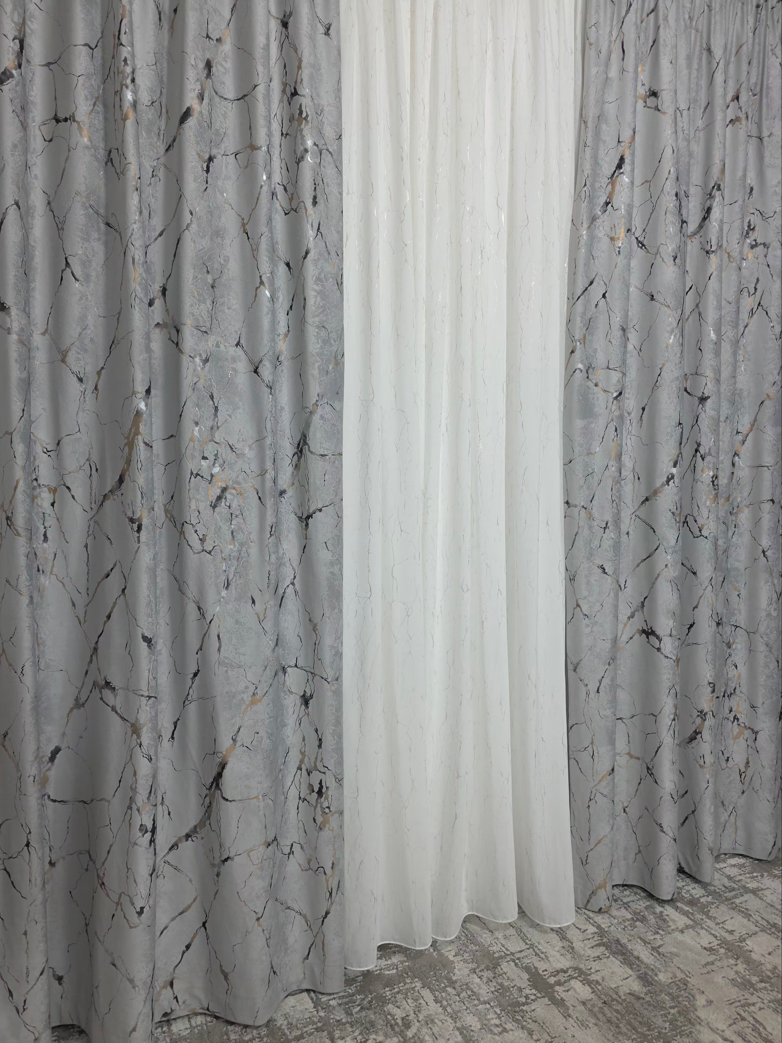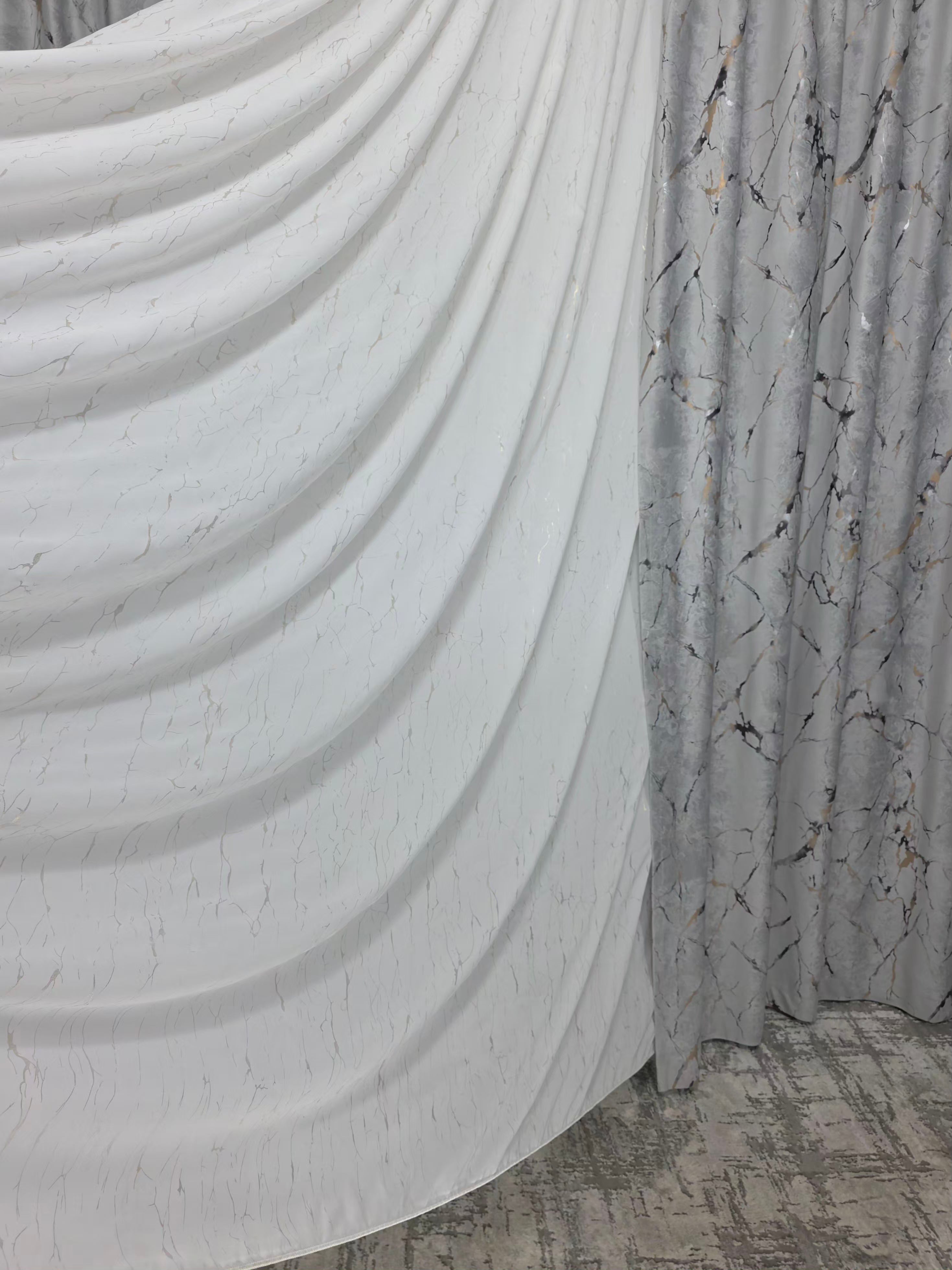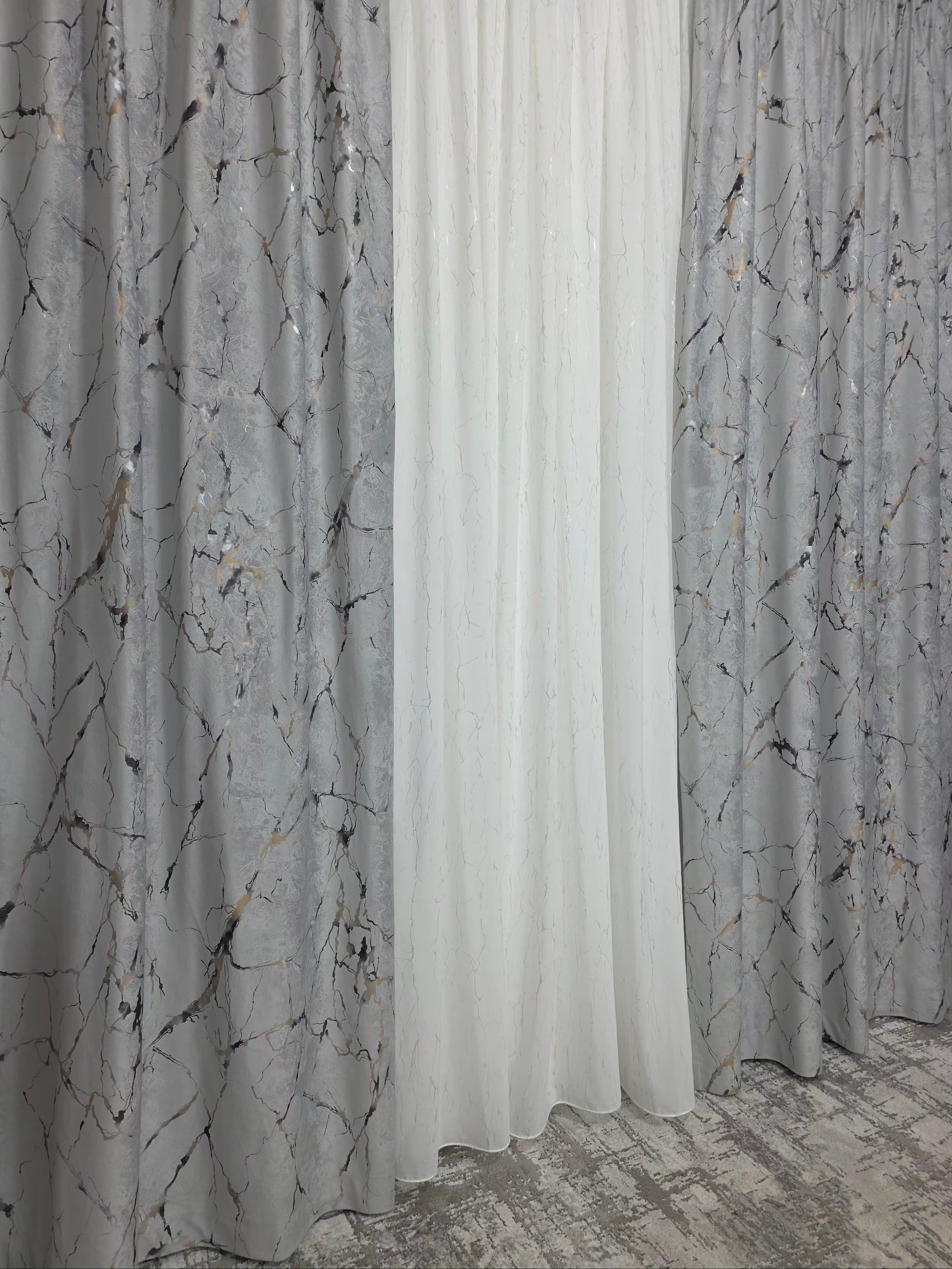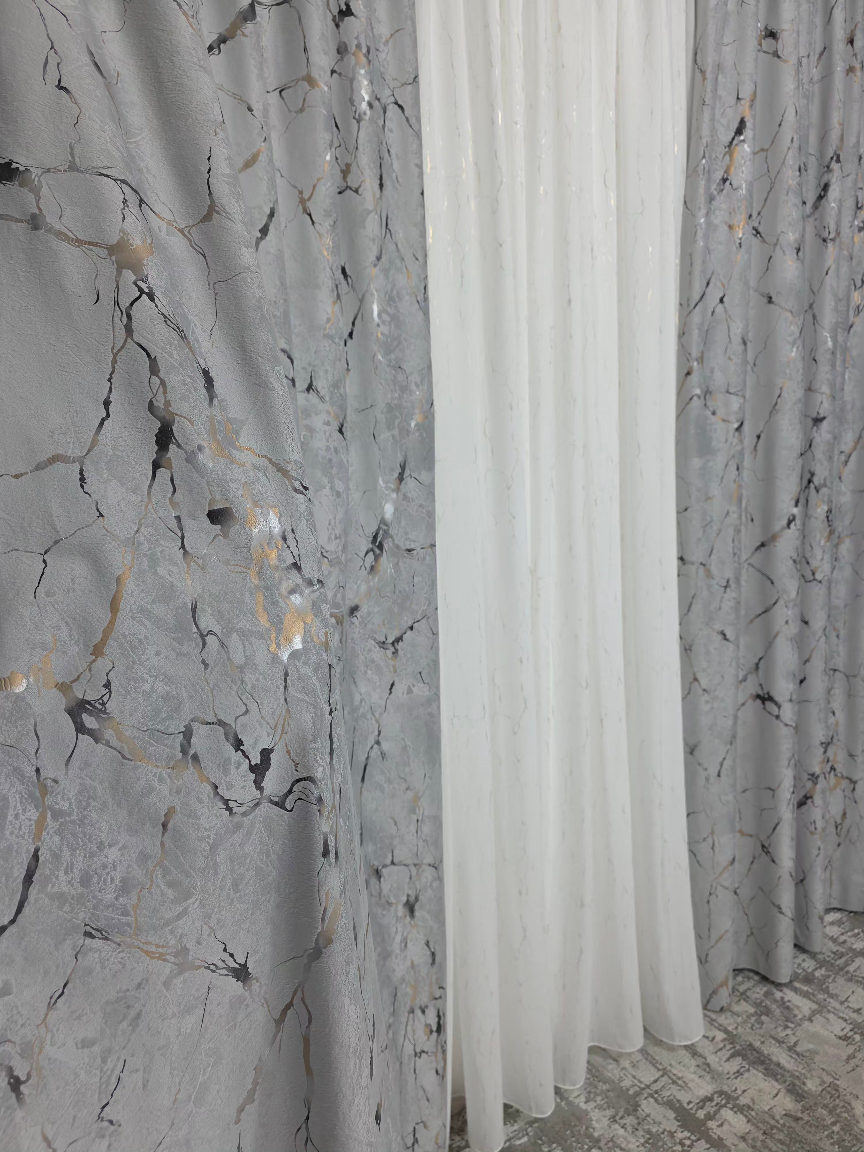 Setul cu perdea din mătase albă cu inserții aurii și draperie din catifea Amazon gri deschis transformă ferestrele într-un simbol al eleganței moderne și al rafinamentului atemporal.