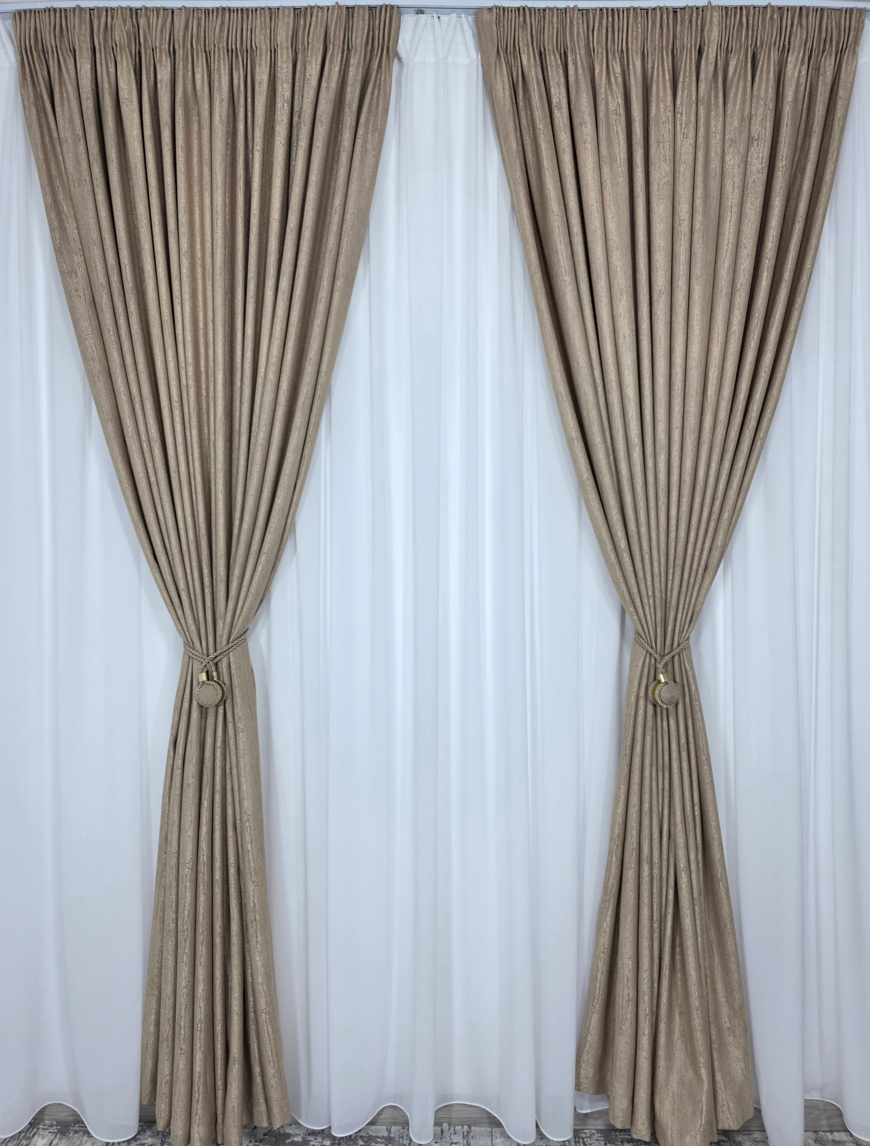 Un set elegant și rafinat, alcătuit din perdea albă simplă din voal, fină și diafană, și draperie crem-auriu cu efect tip vopsea decorativă, ce adaugă un plus de stil și strălucire oricărui interior.