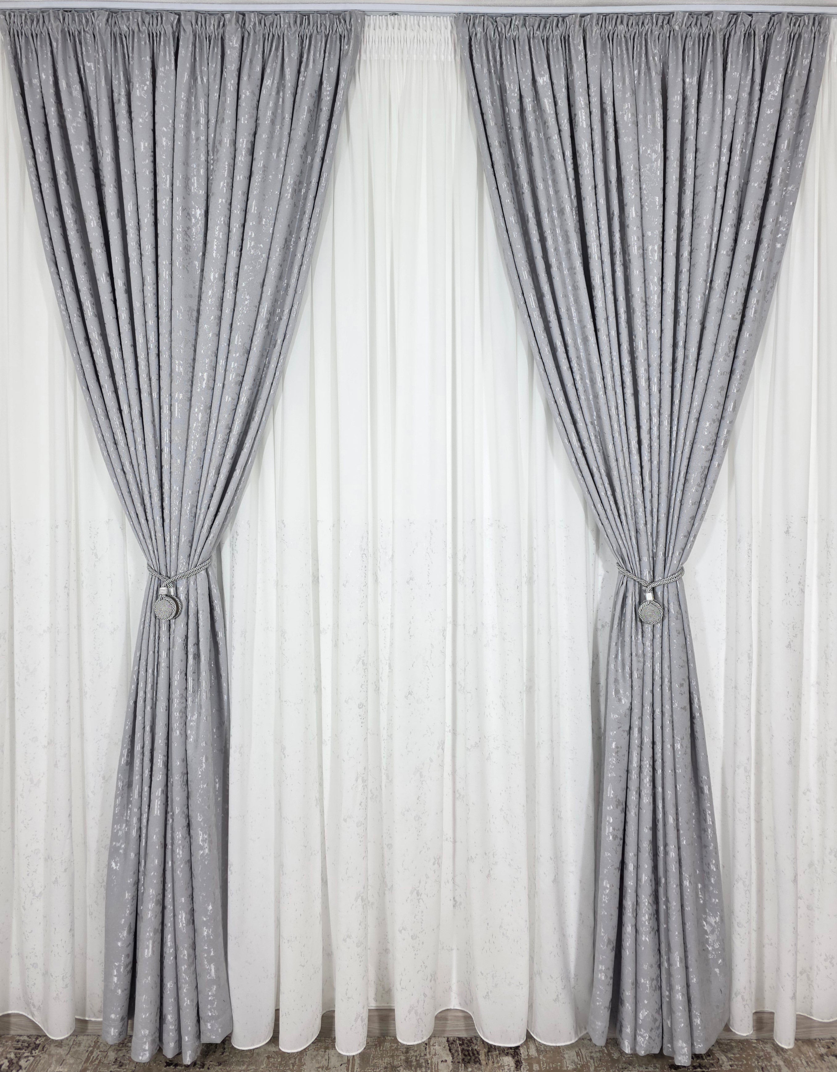 Acest set combină finețea mătăsii albe cu inserții gri și bogăția draperiei gri tip vopsea decorativă, transformând orice spațiu într-un decor modern, sofisticat și plin de stil. ✨
