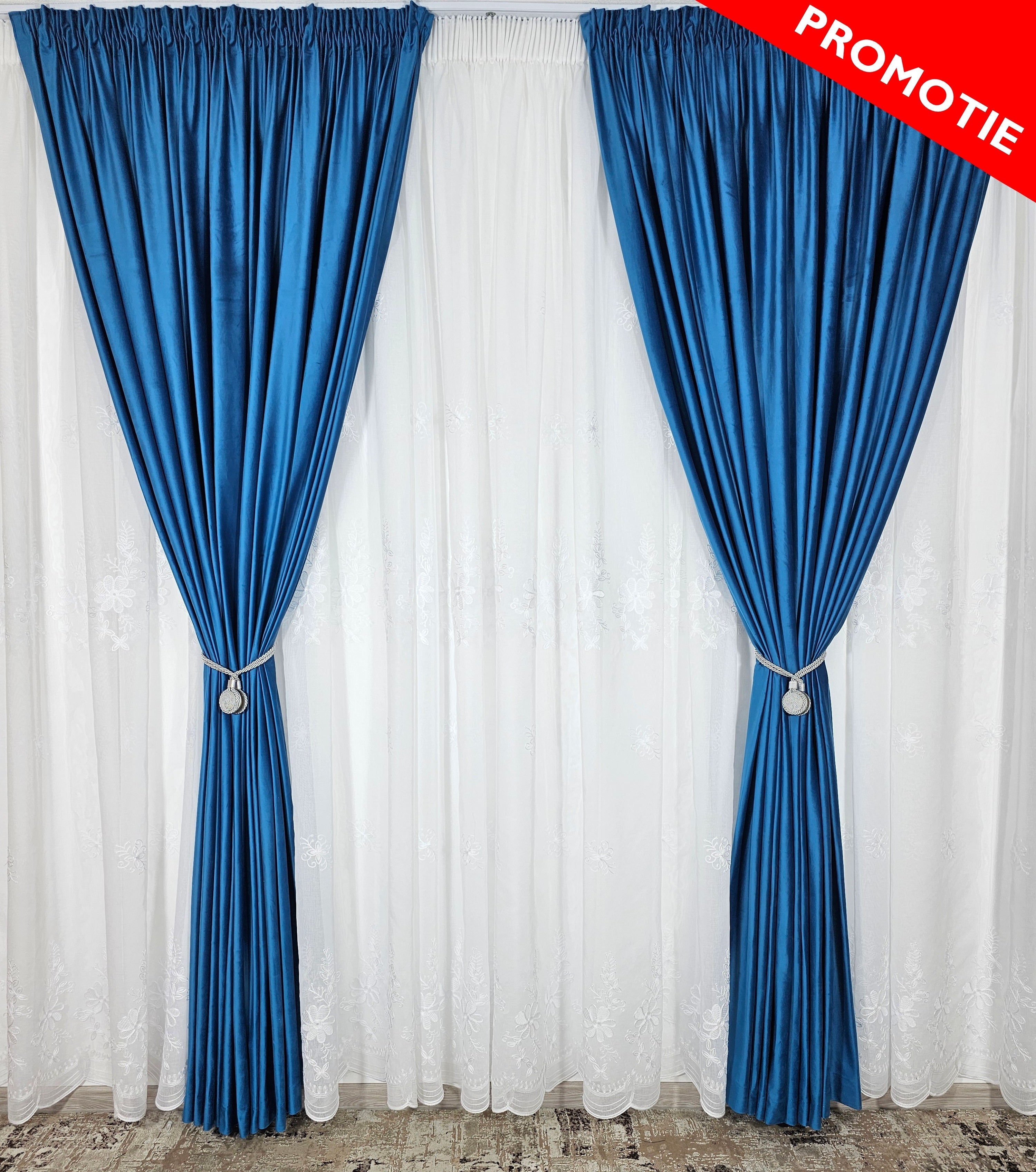 Culoare albastră vibrantă: Creează un contrast elegant cu perdeaua albă, oferind un decor sofisticat și modern.