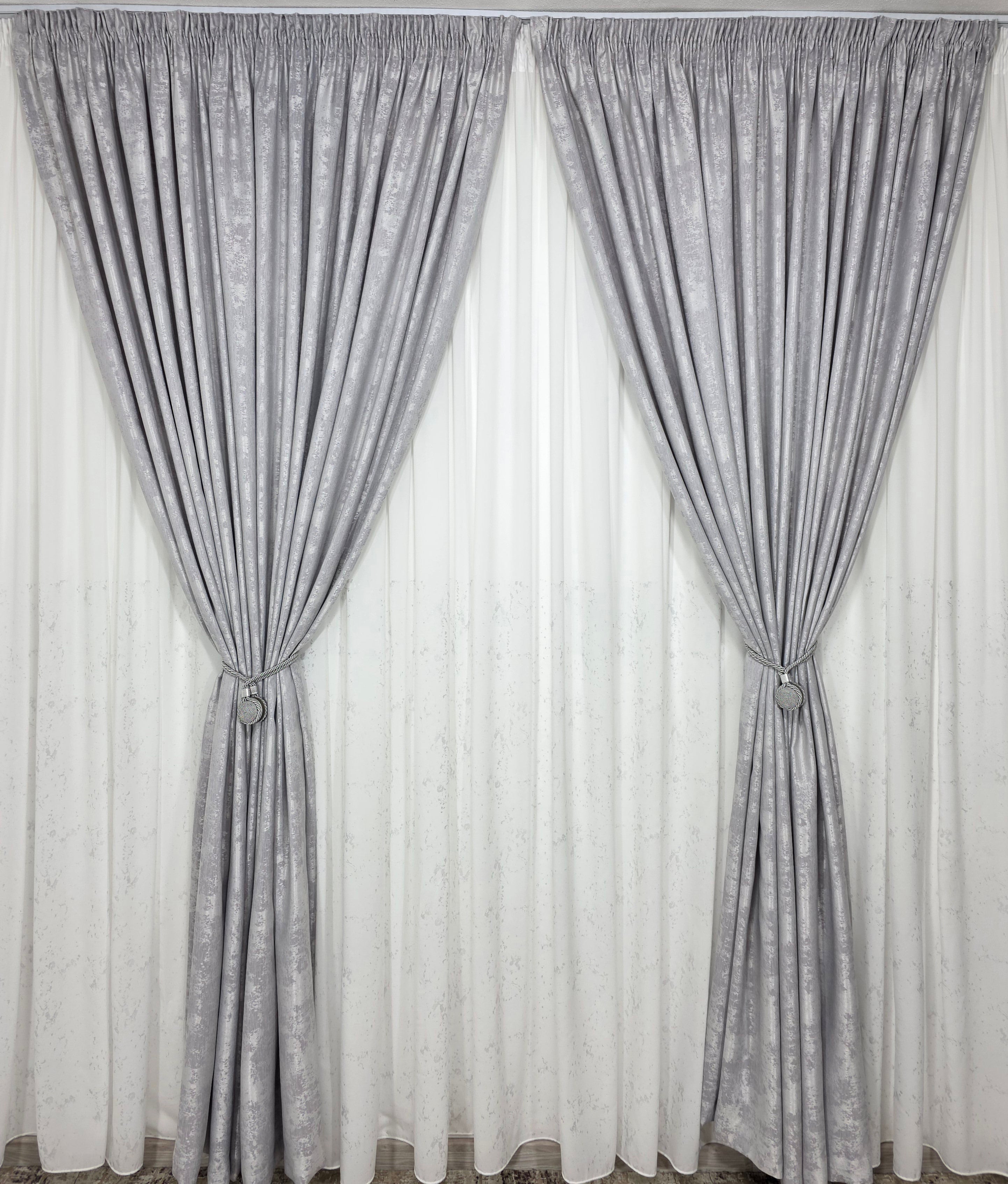 Perdea Albă din Mătase cu Inserții Gri și Draperie Gri Tip Vopsea Decorativă ✨⚪⚫