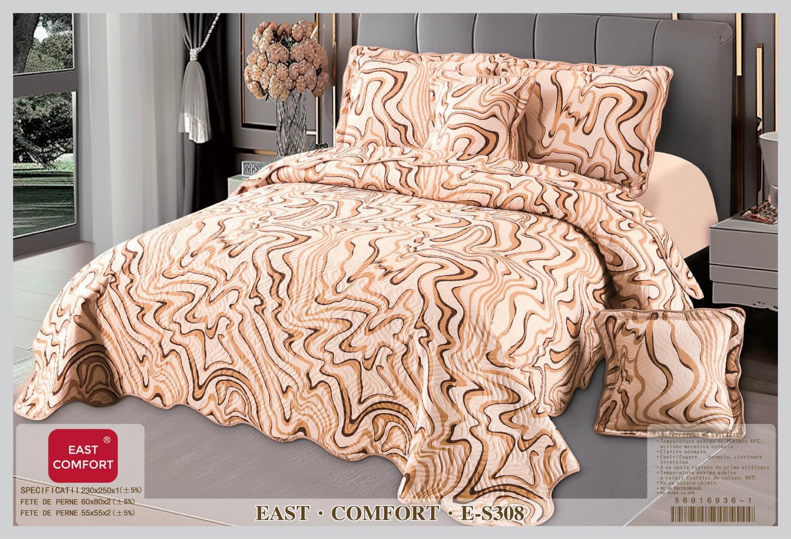 Împrospătează-ți dormitorul cu această cuvertură de 230x250 cm, însoțită de patru fețe de perne în dimensiuni diferite, perfecte pentru orice tip de pat și decor. Confectionată dintr-un material rezistent, care își păstrează aspectul impecabil în timp, cuvertura adaugă o notă de eleganță și protejează eficient lenjeria de pat.