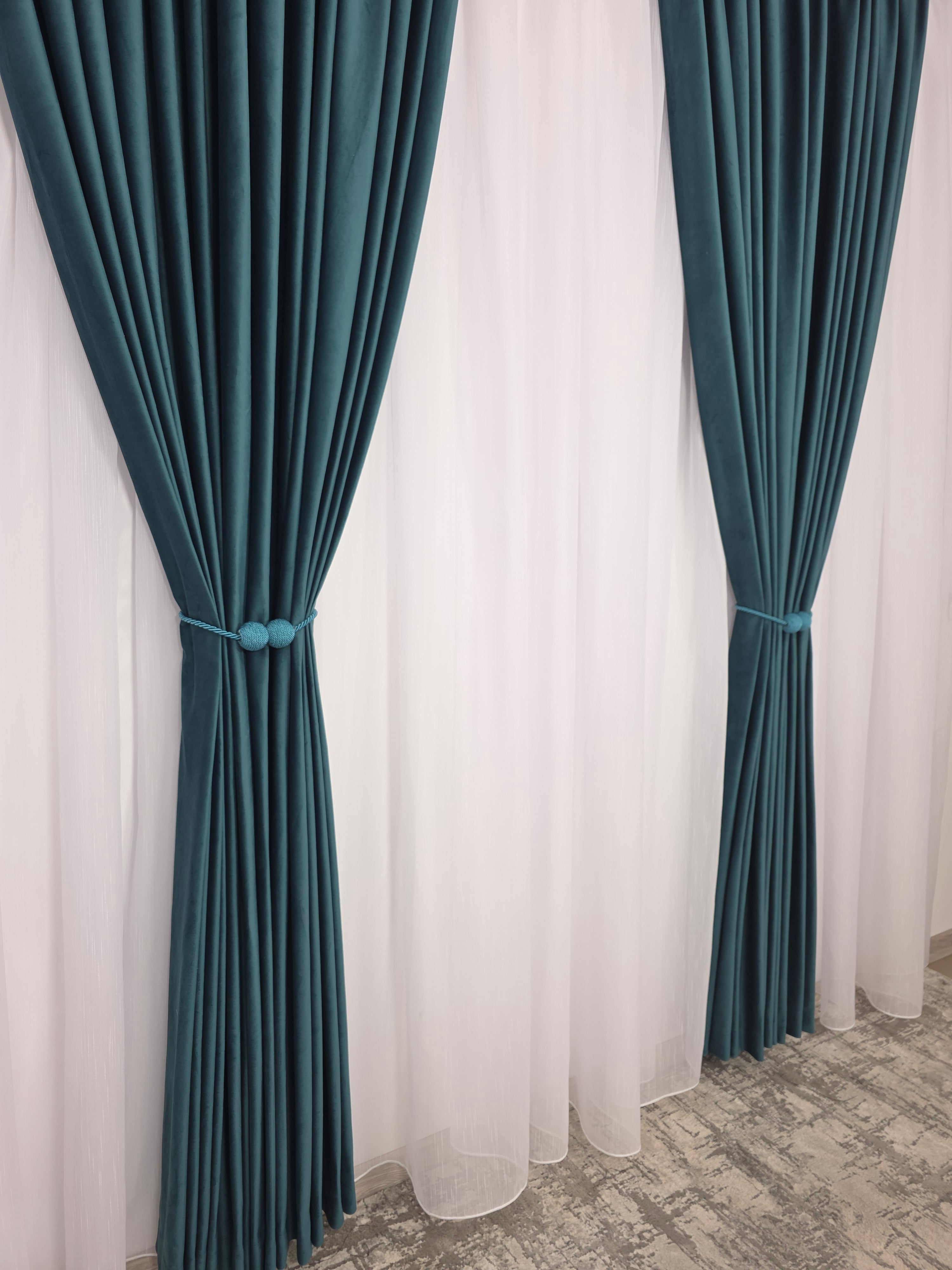 Acest set reunește naturalețea perdelei tip sable, cu țesătură densă, mată și delicată, alături de profunzimea cromatică a unei draperii grele din catifea verde-turcoaz cu opacitate 90%. O alegere perfectă pentru interioare sofisticate, unde lumina difuză și confortul vizual se completează armonios.