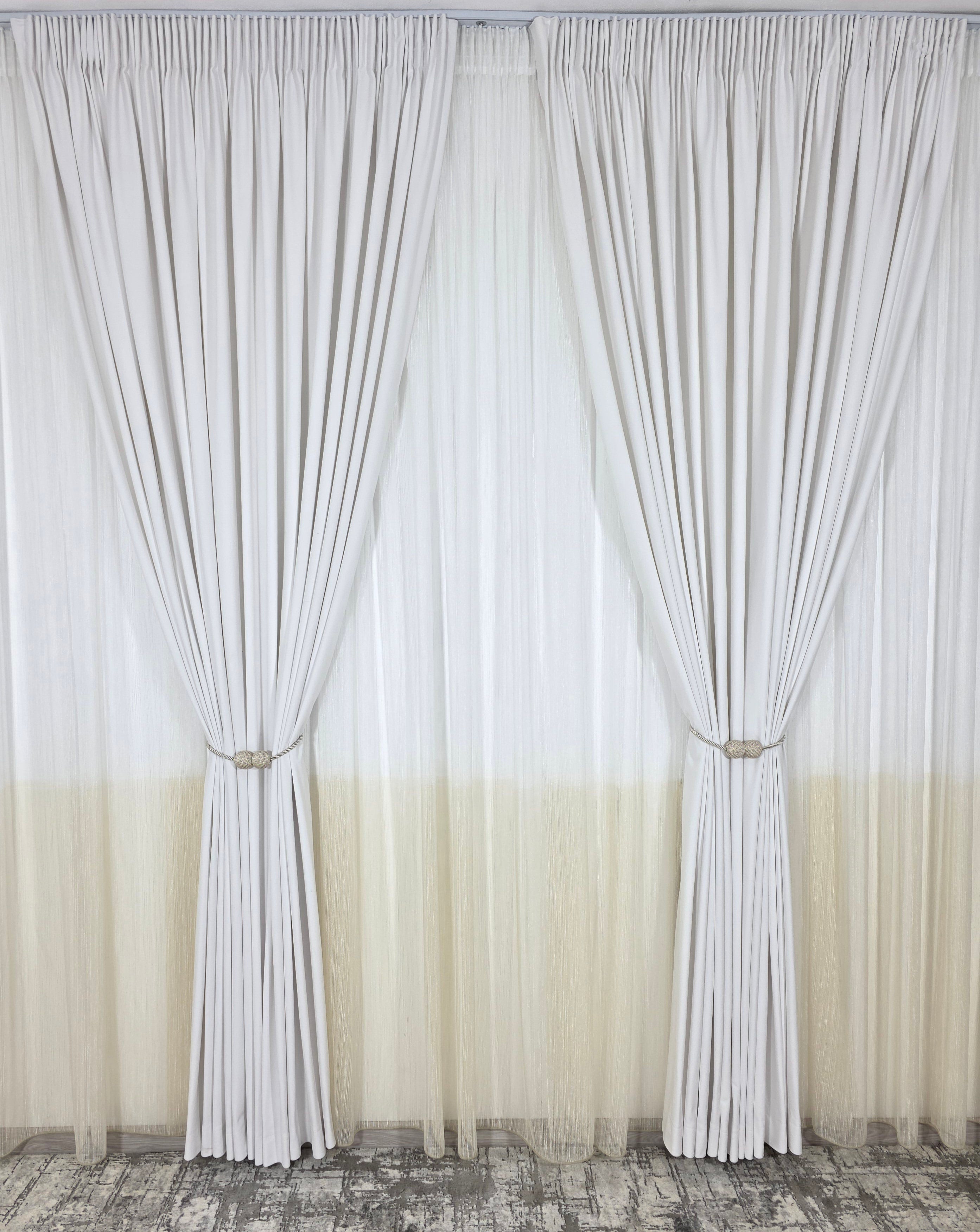 âœ”ï¸ Contrast subtil alb-crem, ideal pentru decoruri naturale și echilibrate âœ”ï¸ Perdea cu textură de borangic – aduce lejeritate și căldură spațiului âœ”ï¸ Draperie din catifea albă – accent de rafinament discret âœ”ï¸ Culori neutre – ușor de integrat în orice paletă decorativă âœ”ï¸ Potrivit pentru livinguri, dormitoare, holuri sau camere de oaspeți