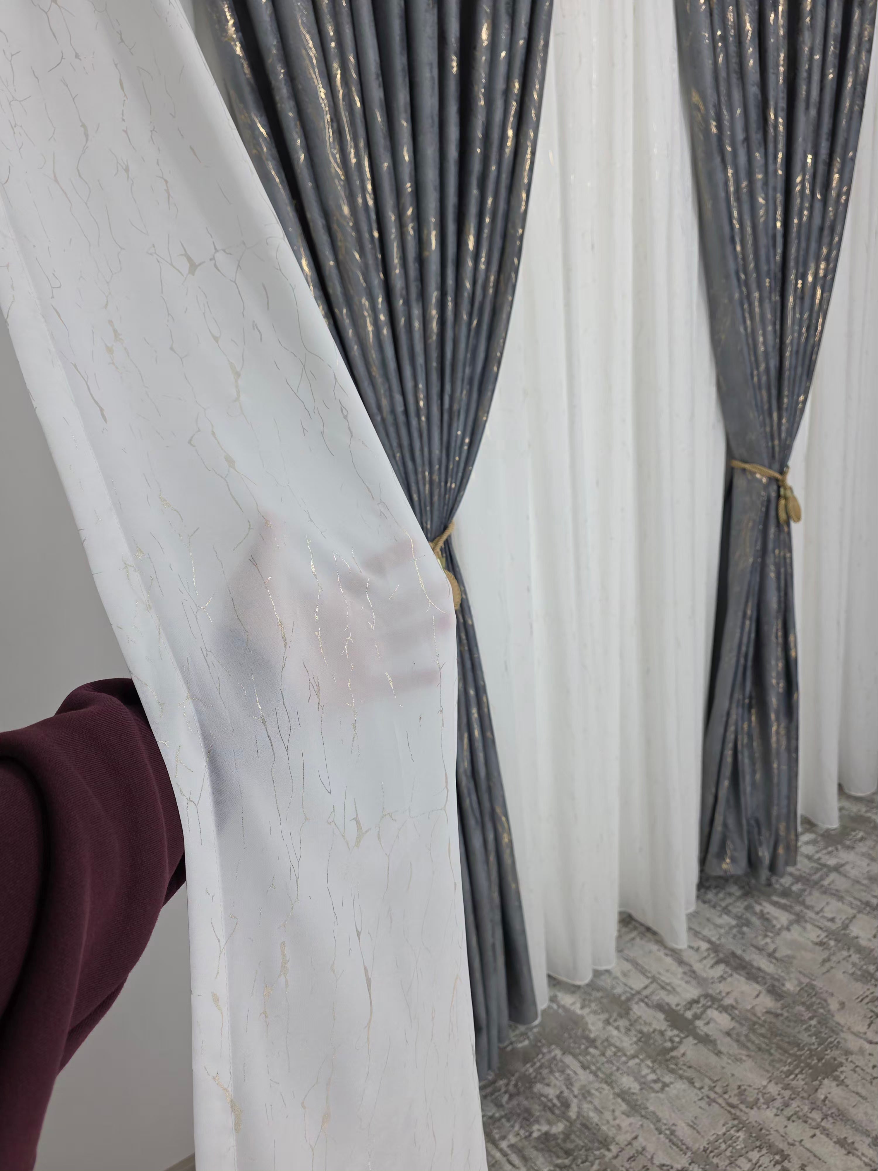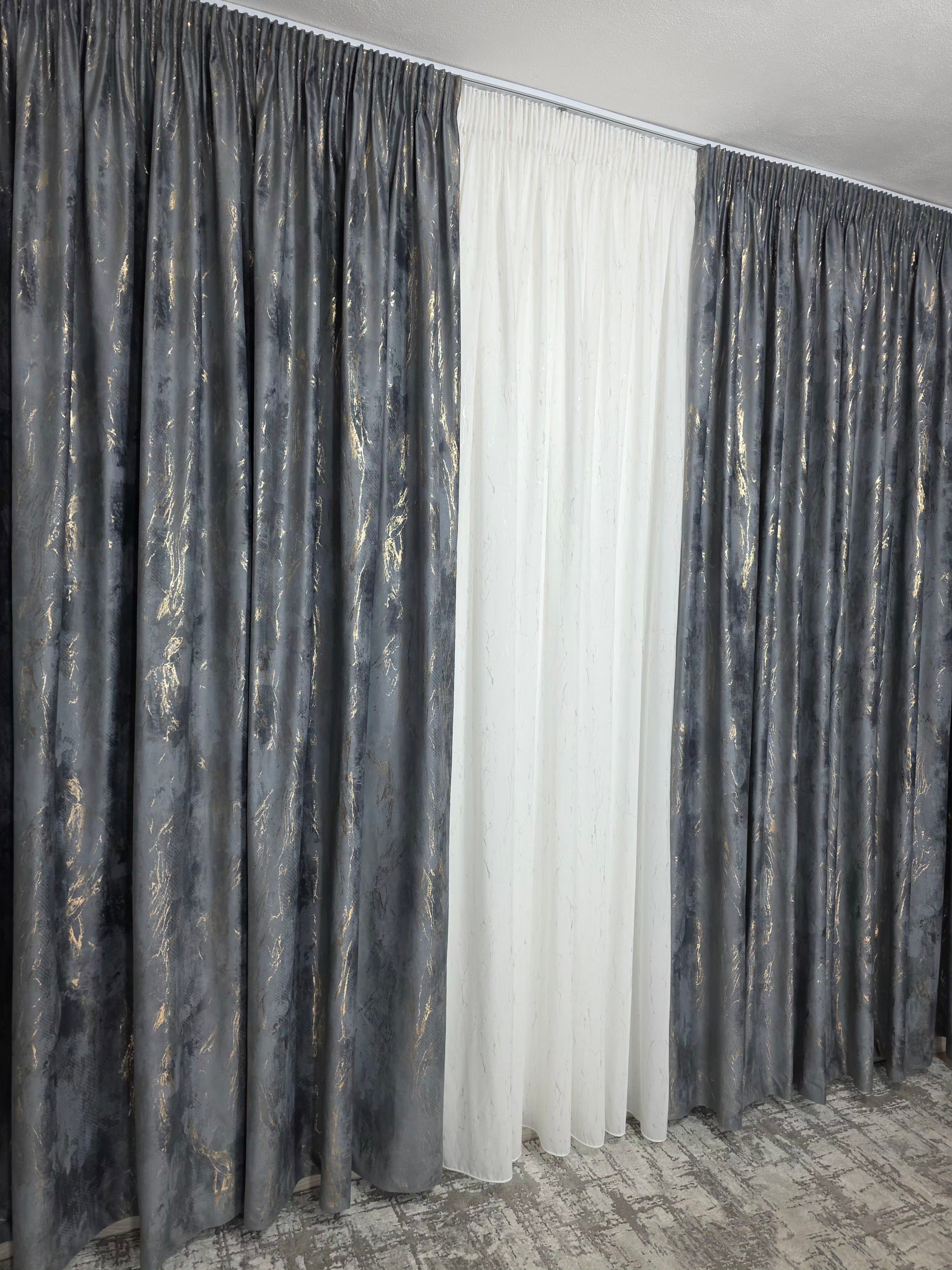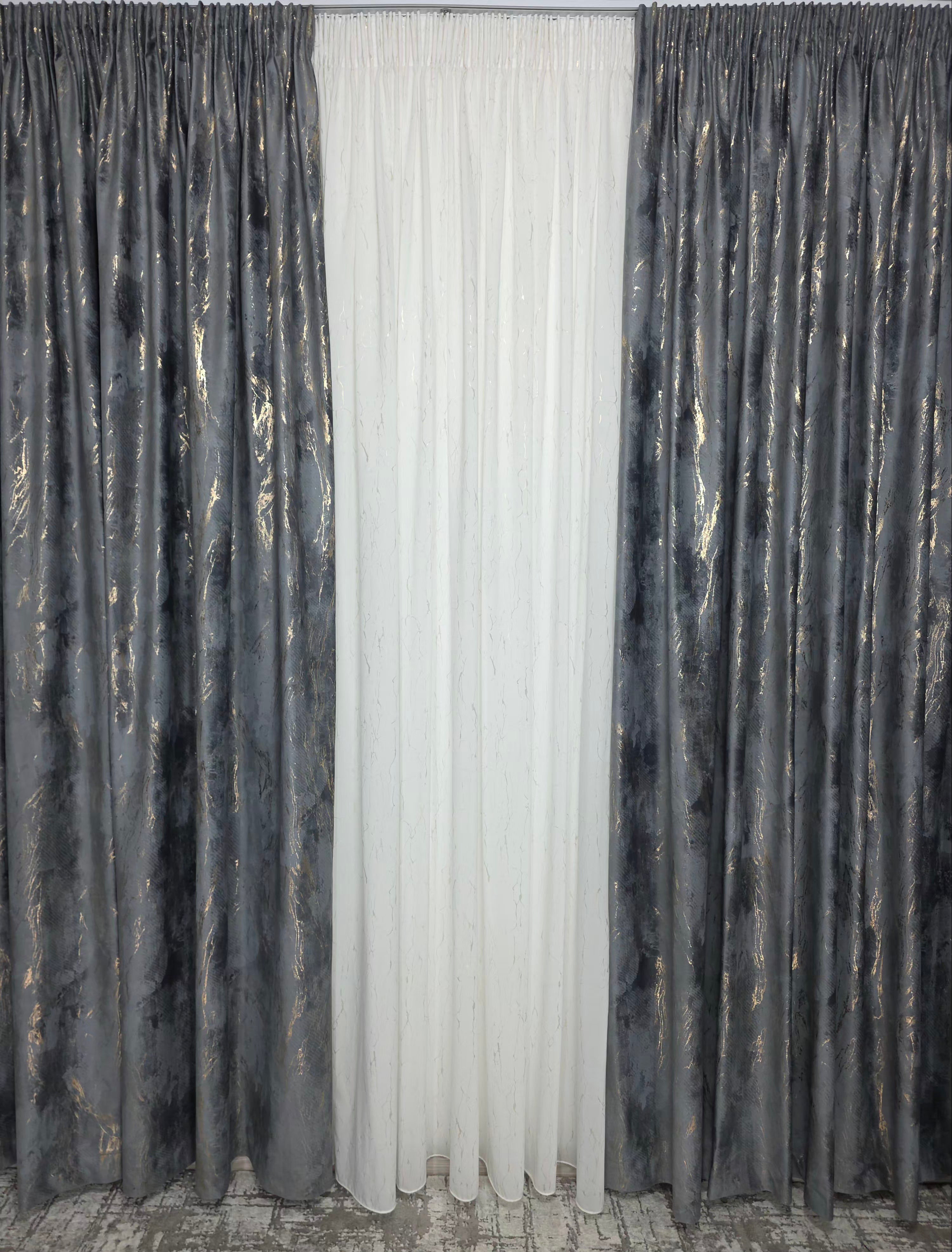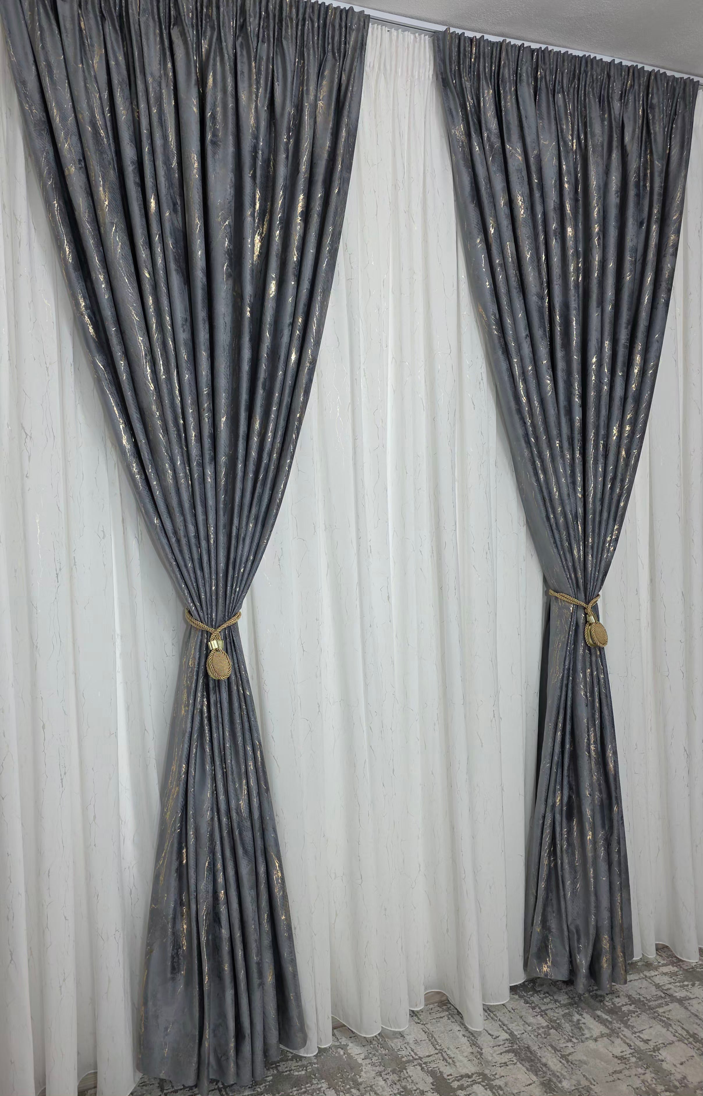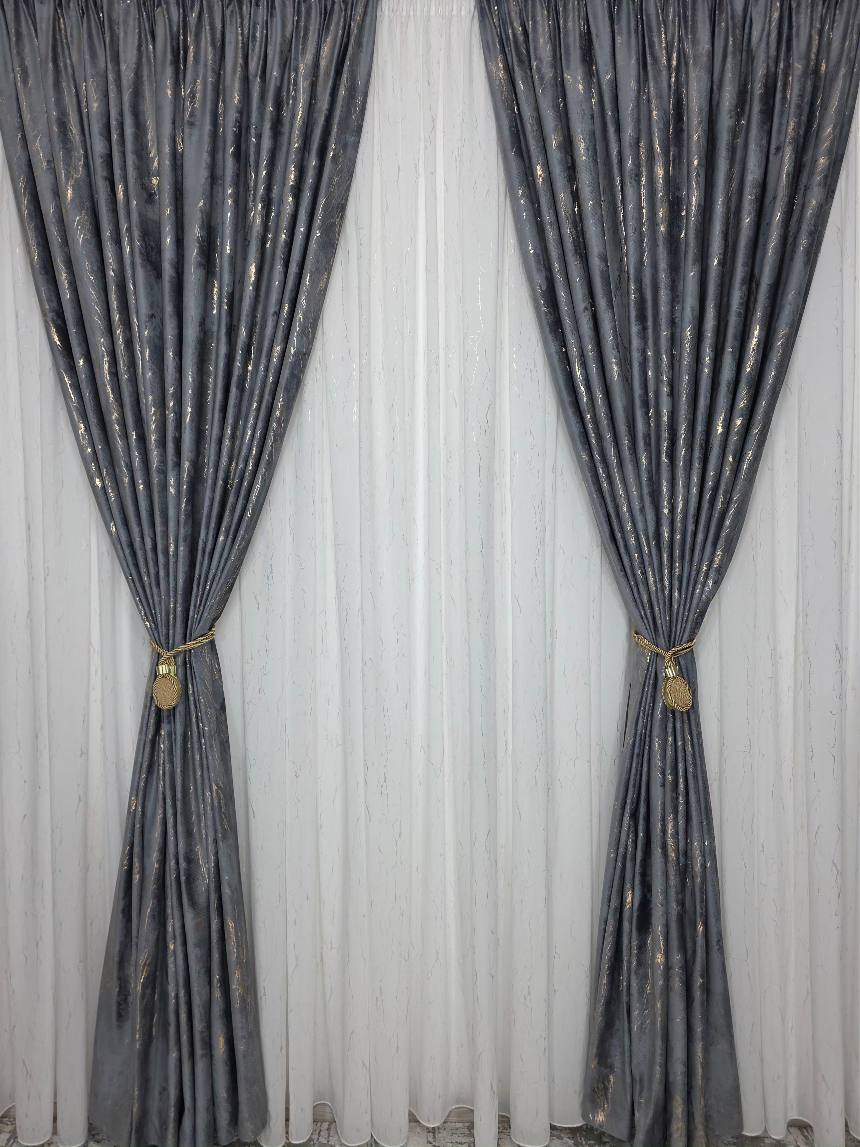 Setul Perdea din mătase albă moale, plină, cu inserții aurii (varianta 1) și Draperie din catifea gri închis cu inserții aurii aduce un contrast elegant și un efect vizual spectaculos în decorul casei. Mătasea albă oferă luminozitate și finețe, în timp ce catifeaua gri închis adaugă profunzime, iar reflexiile aurii creează o armonie luxoasă și echilibrată.