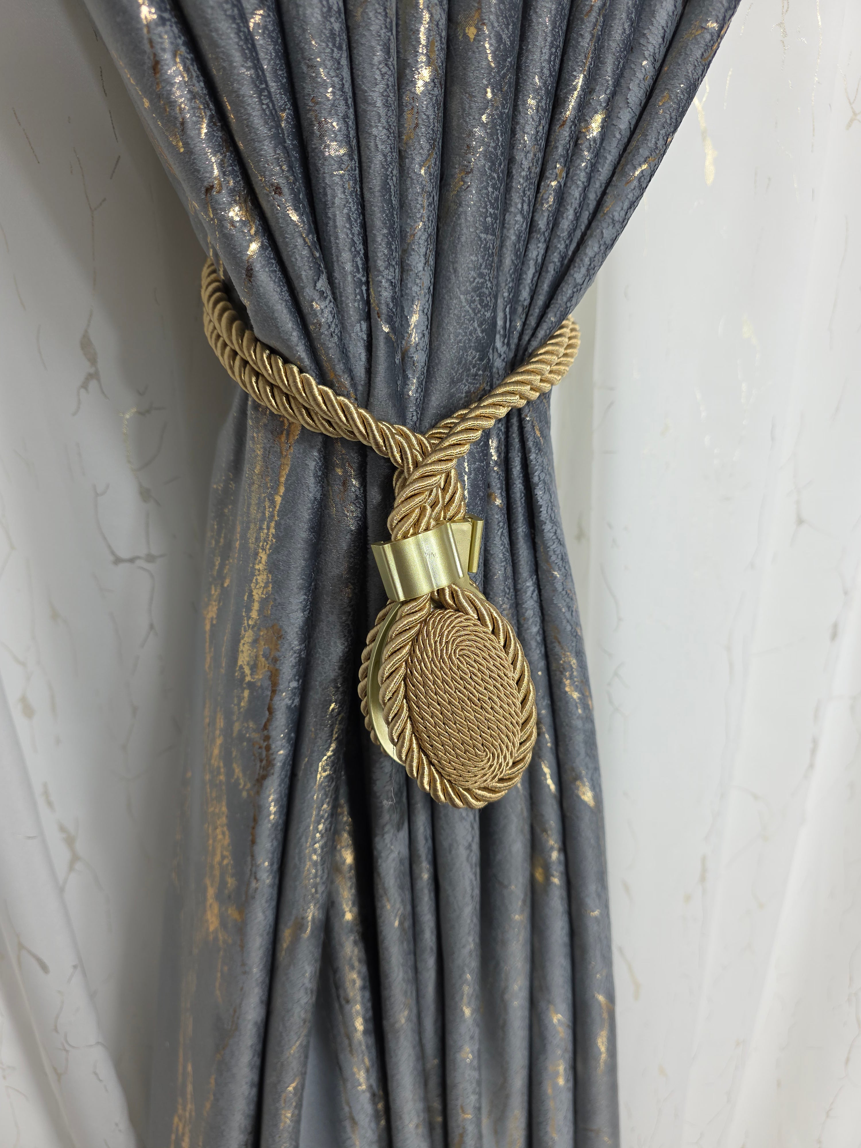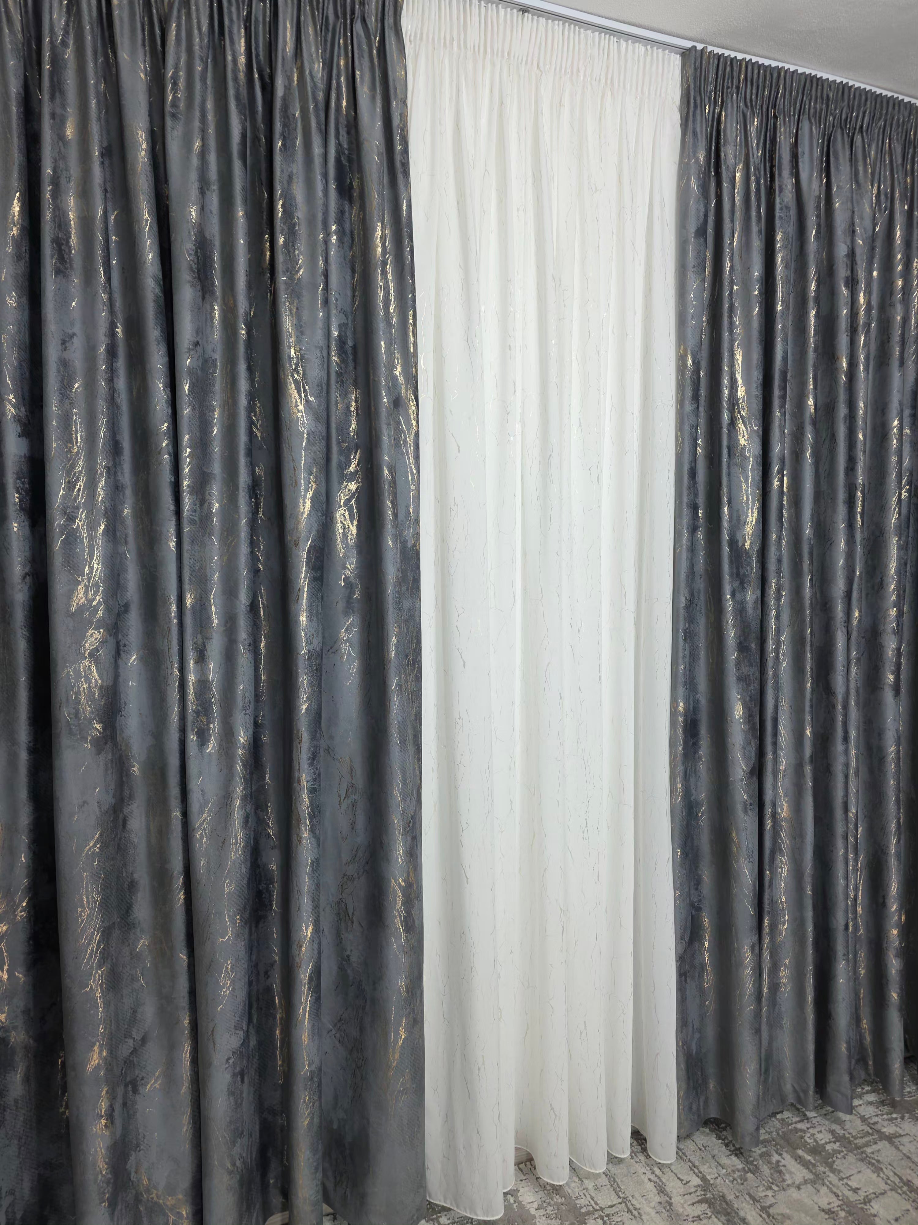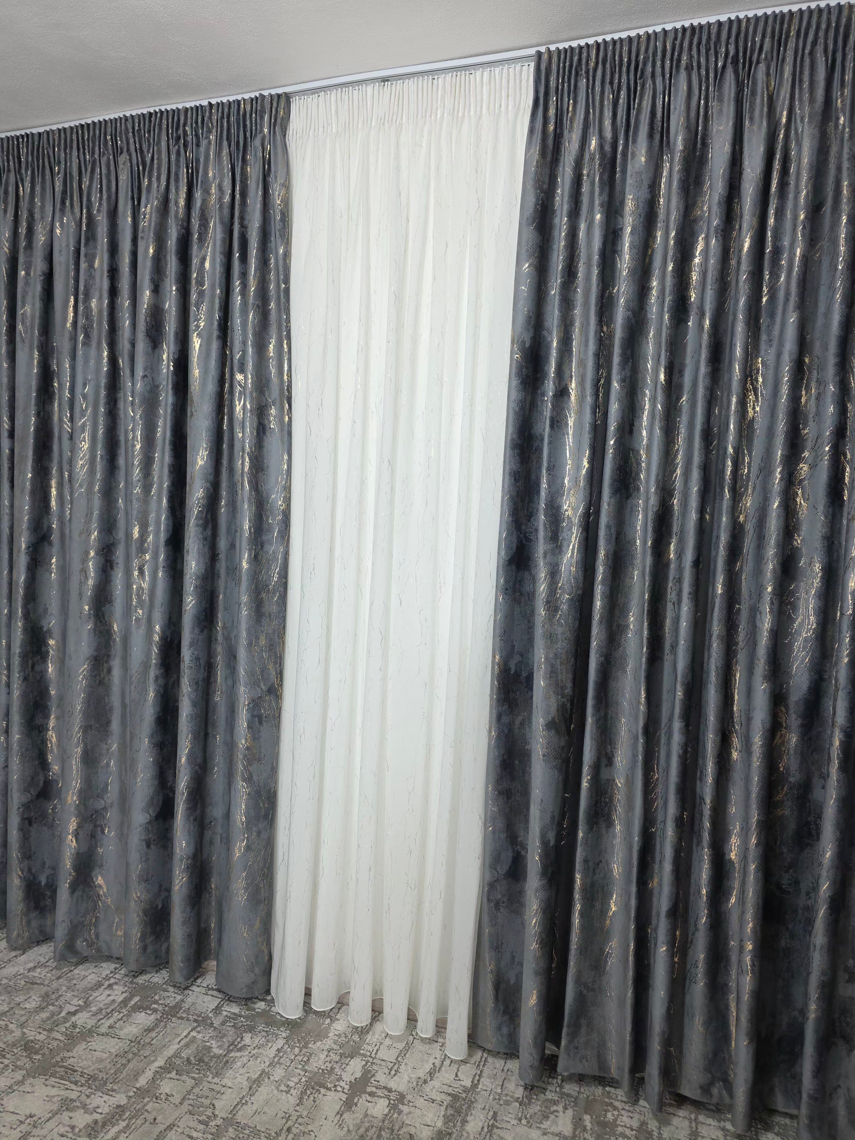 Setul cu perdea din mătase albă cu inserții aurii și draperie din catifea gri închis cu inserții aurii aduce o notă de rafinament absolut și echilibru între lumină și profunzime.