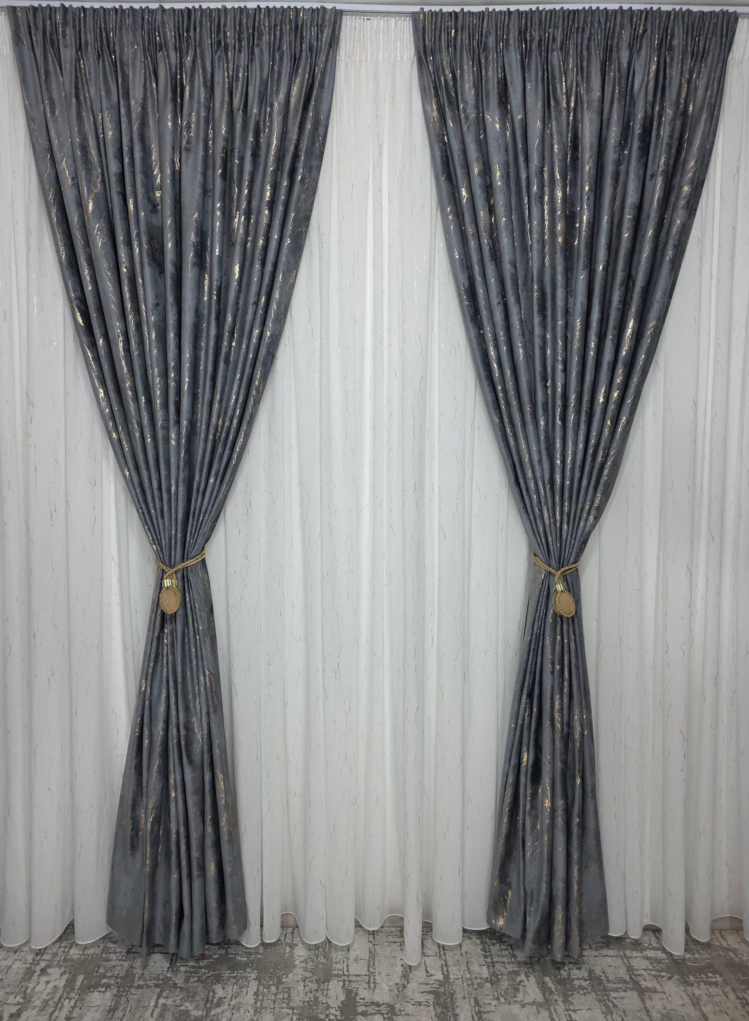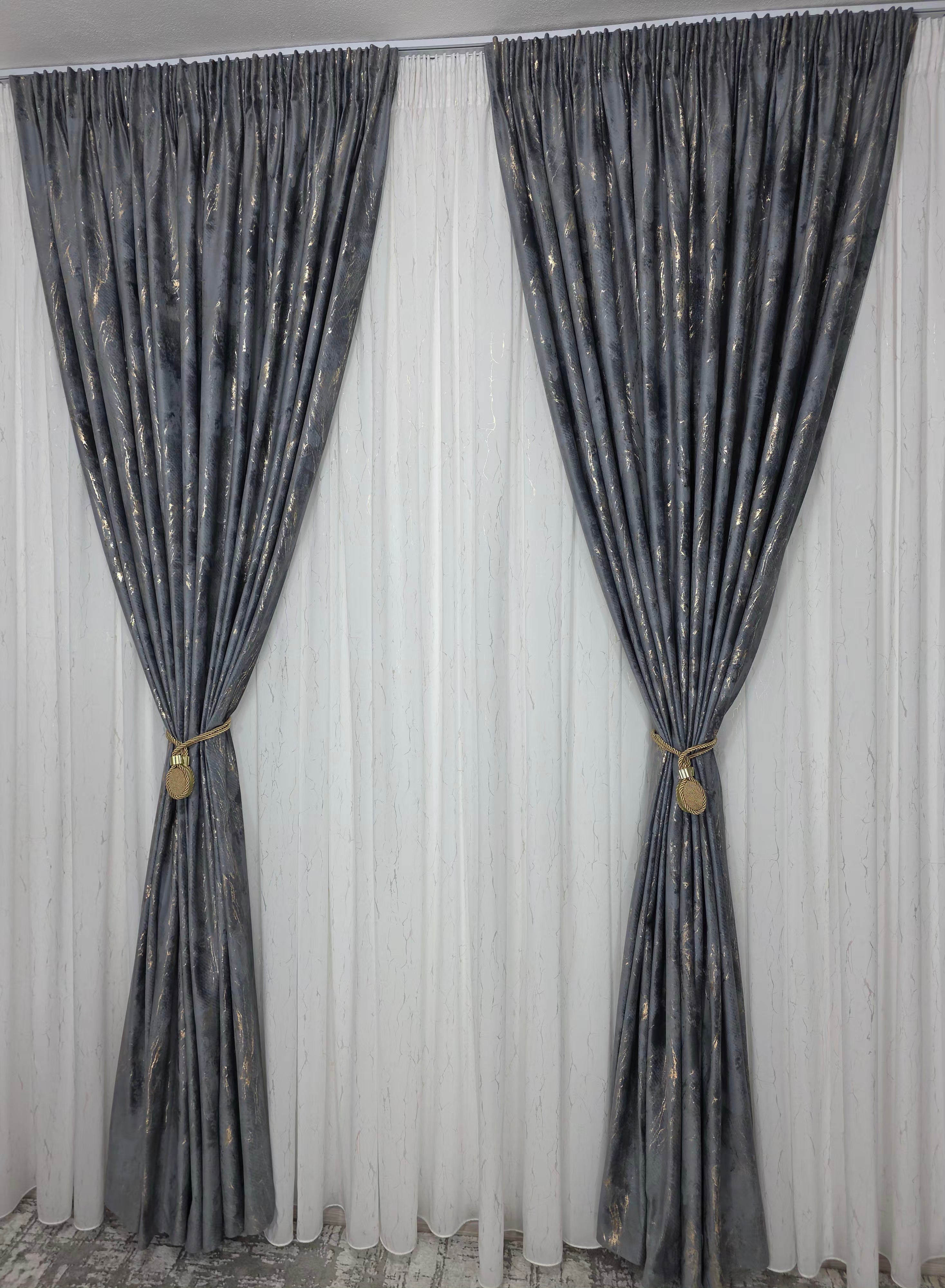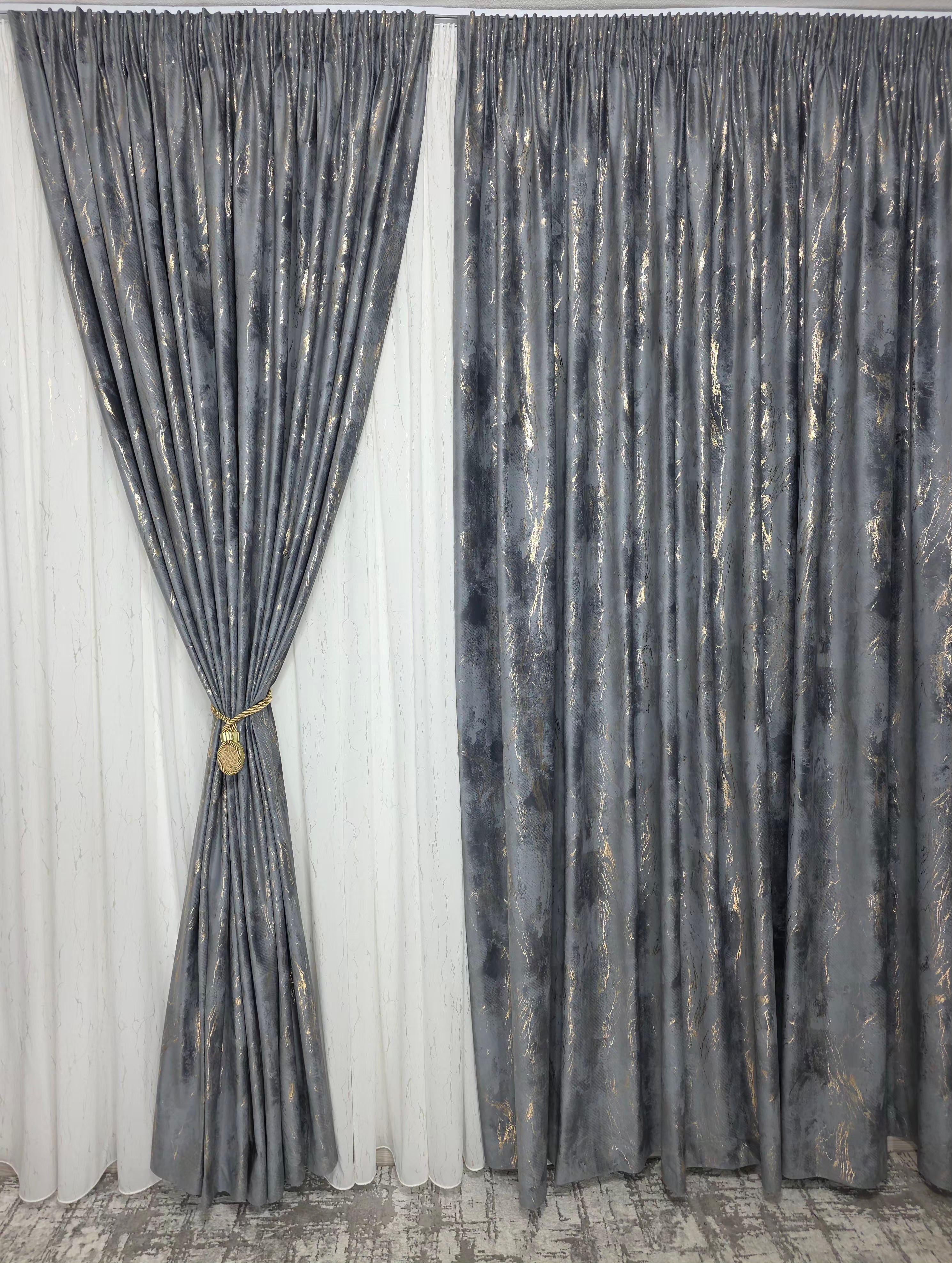Draperie din catifea gri închis, plină, cu inserții aurii elegante