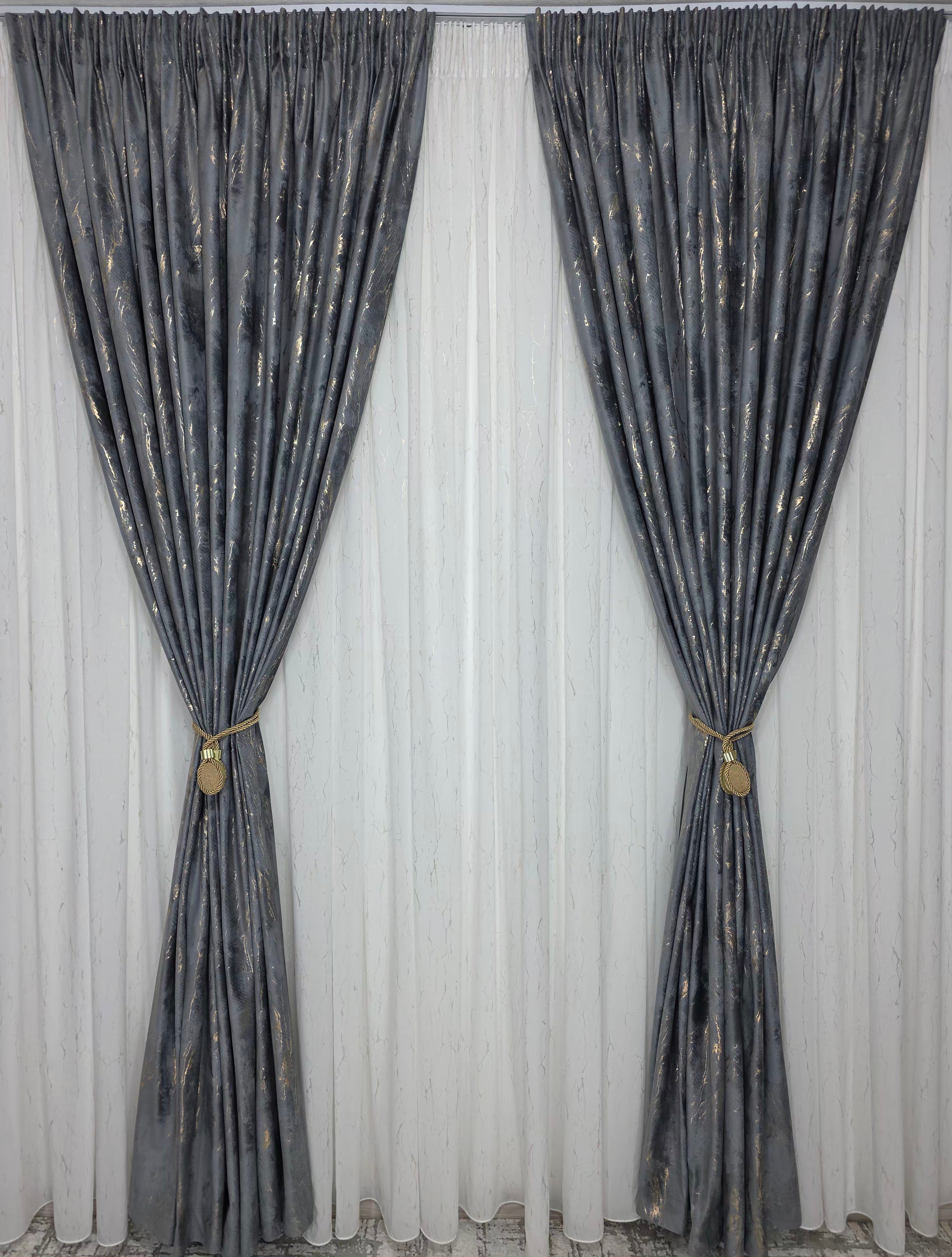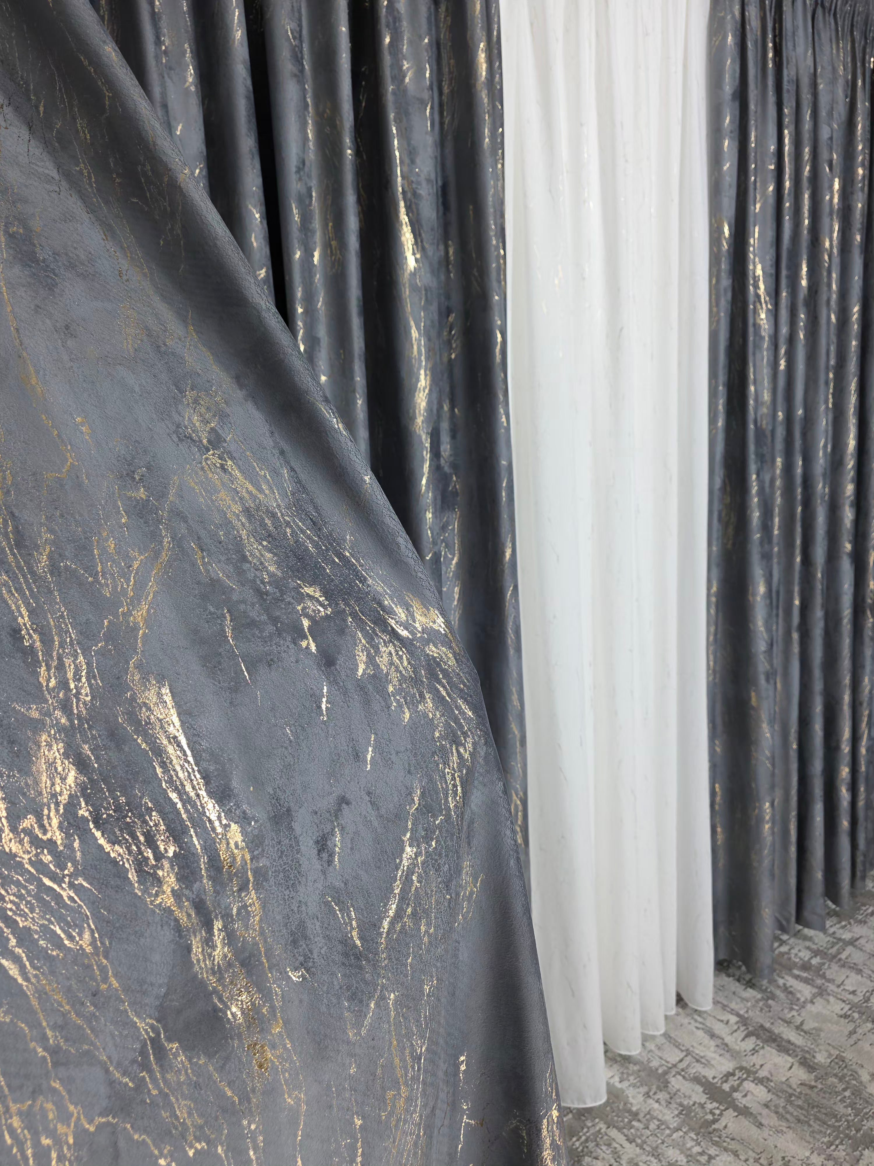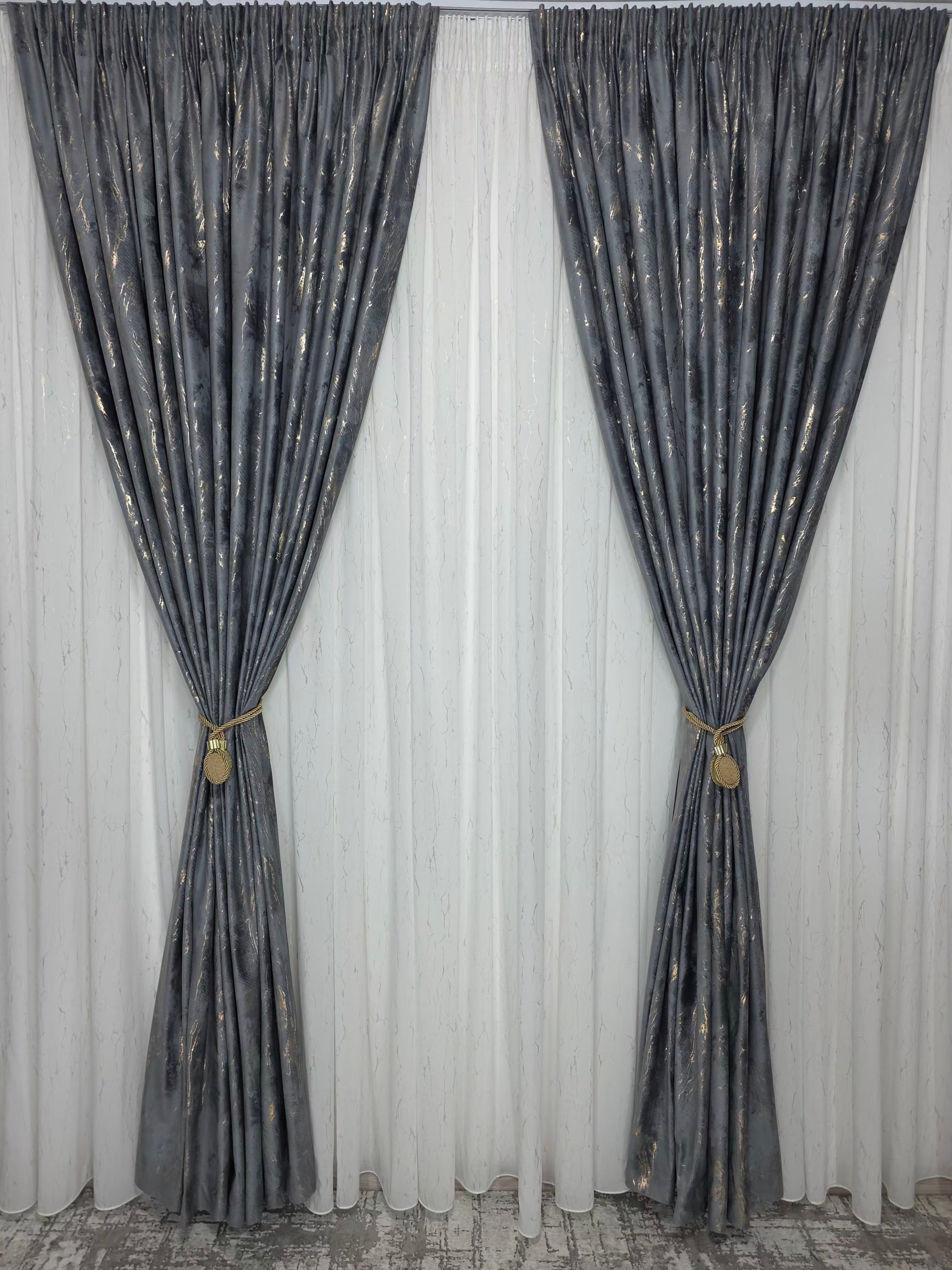 Draperie din catifea gri închis, plină, cu inserții aurii elegante