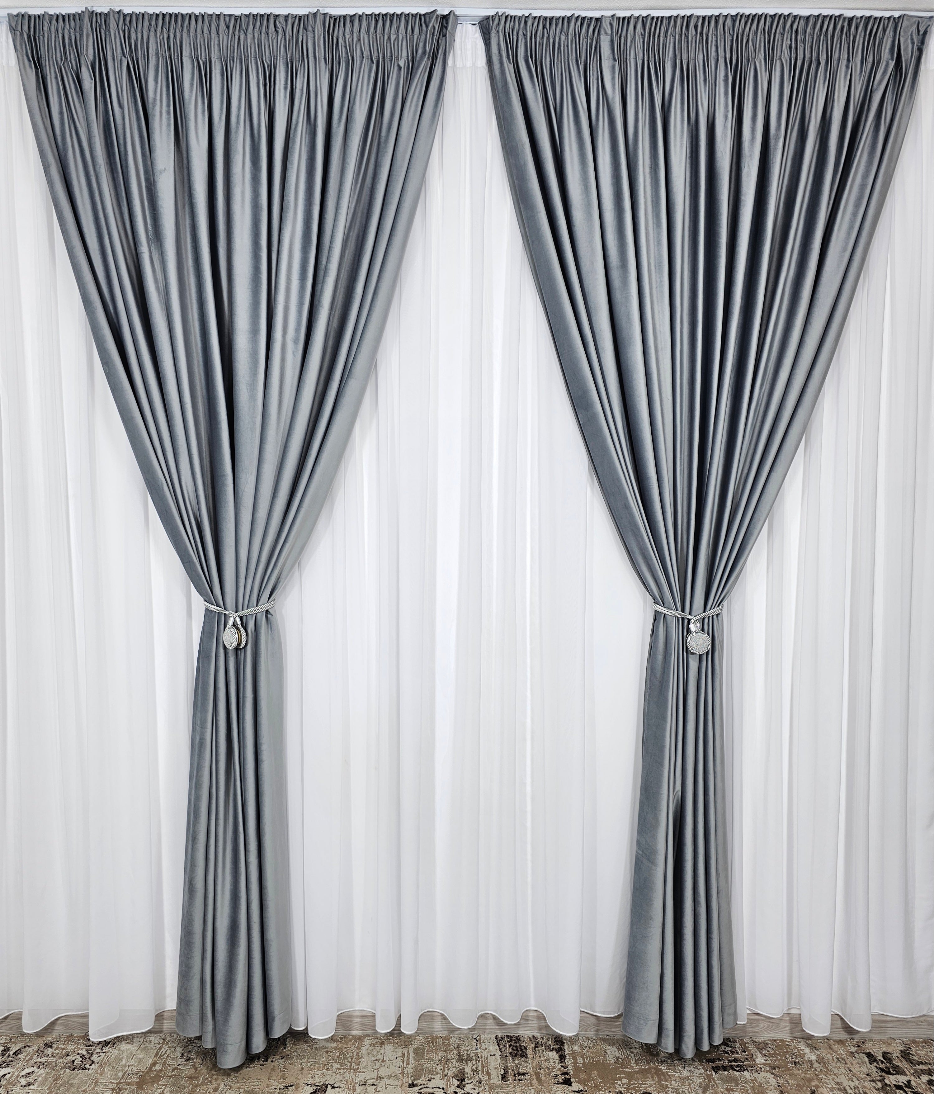 Un set clasic și elegant, alcătuit din perdea albă simplă din voal fin și draperie din catifea gri deschis, perfect pentru a aduce echilibru între luminozitate și rafinament în orice spațiu.