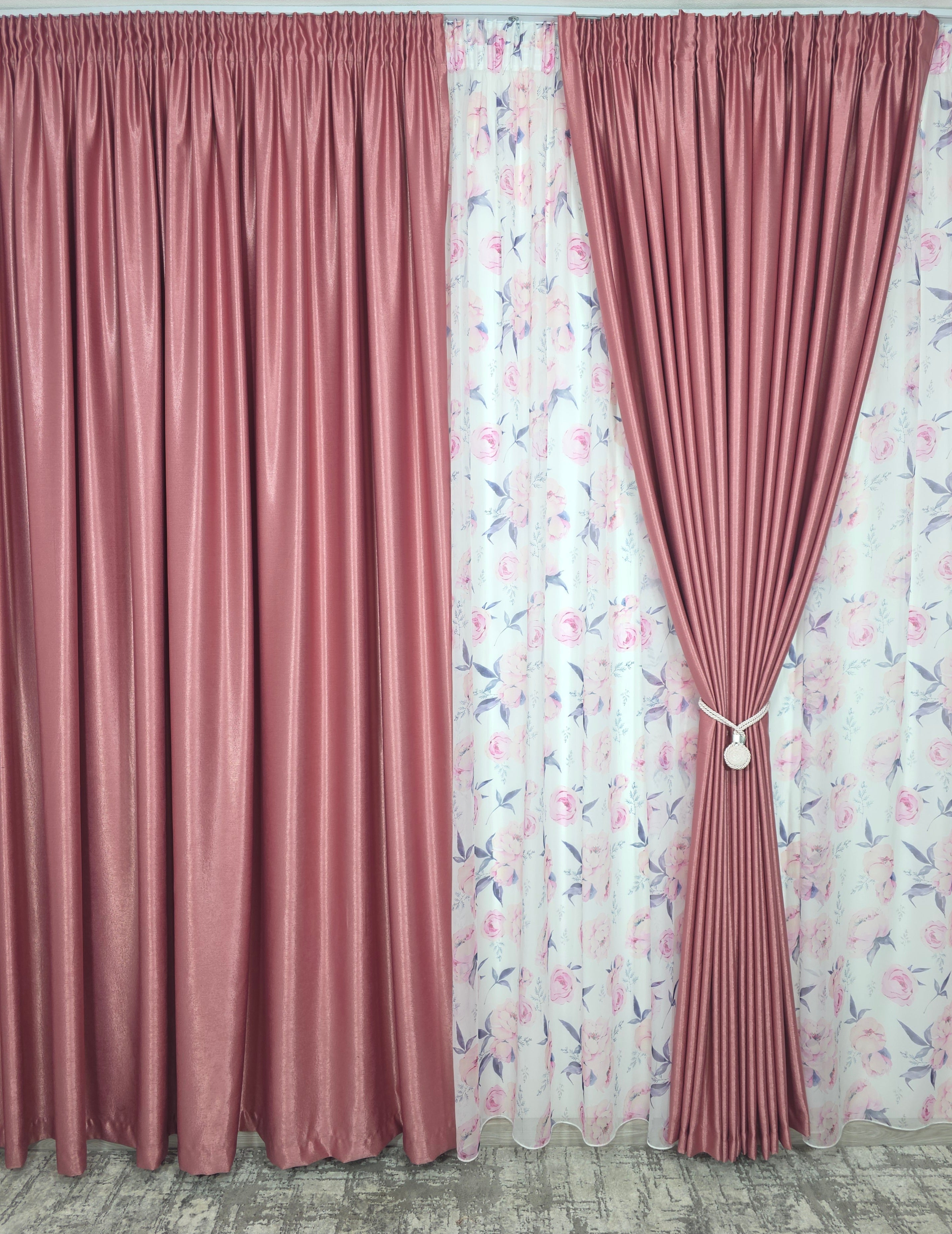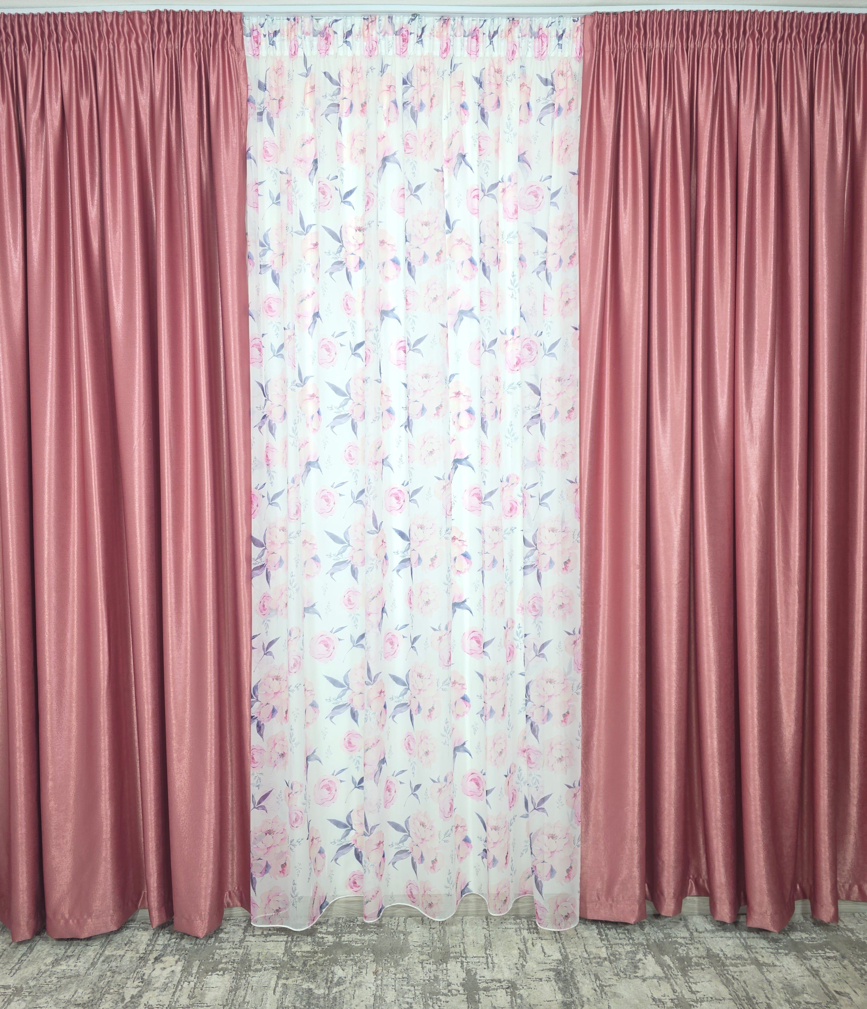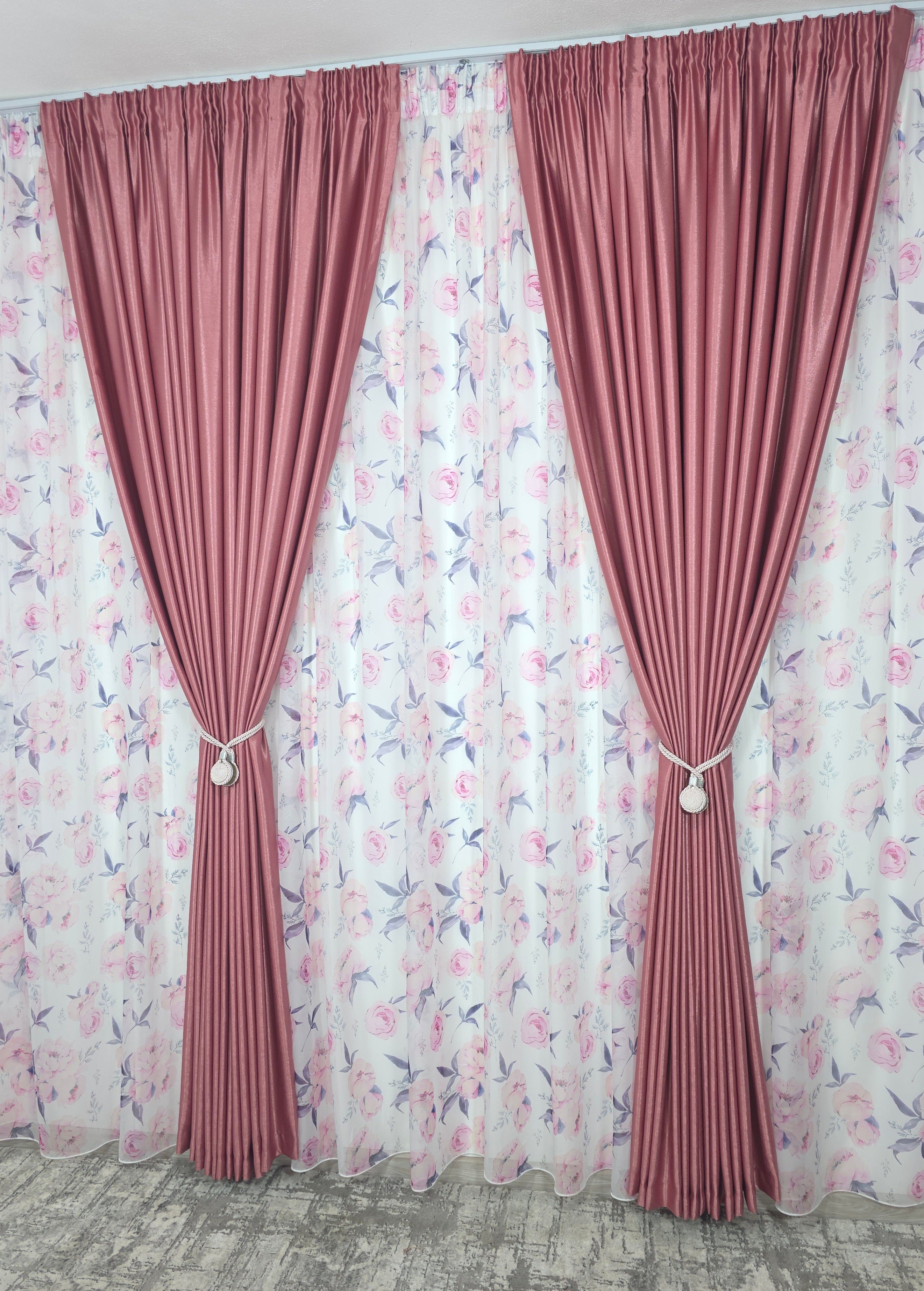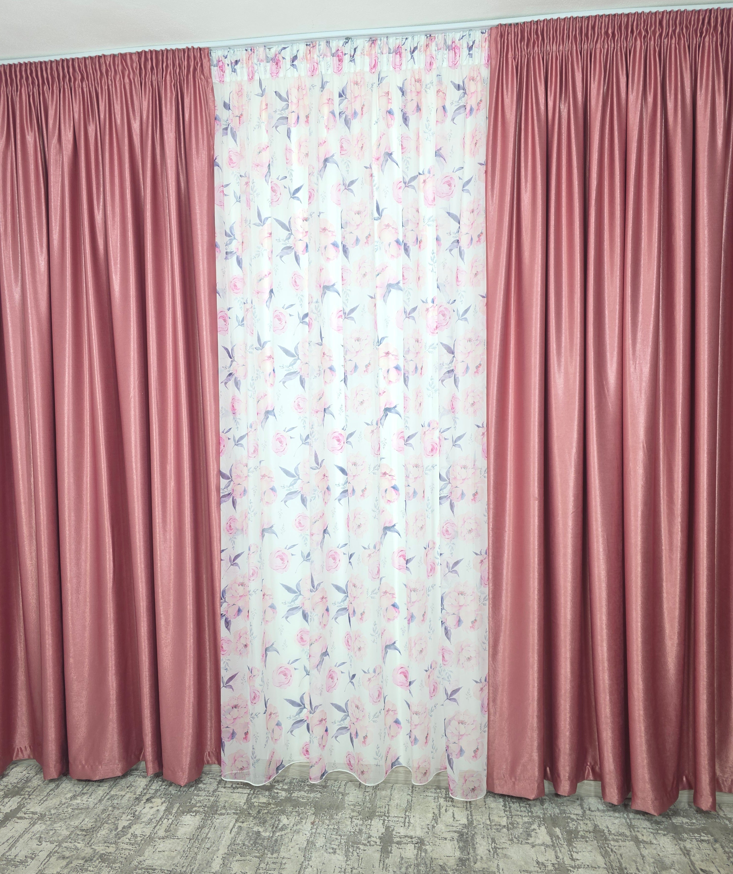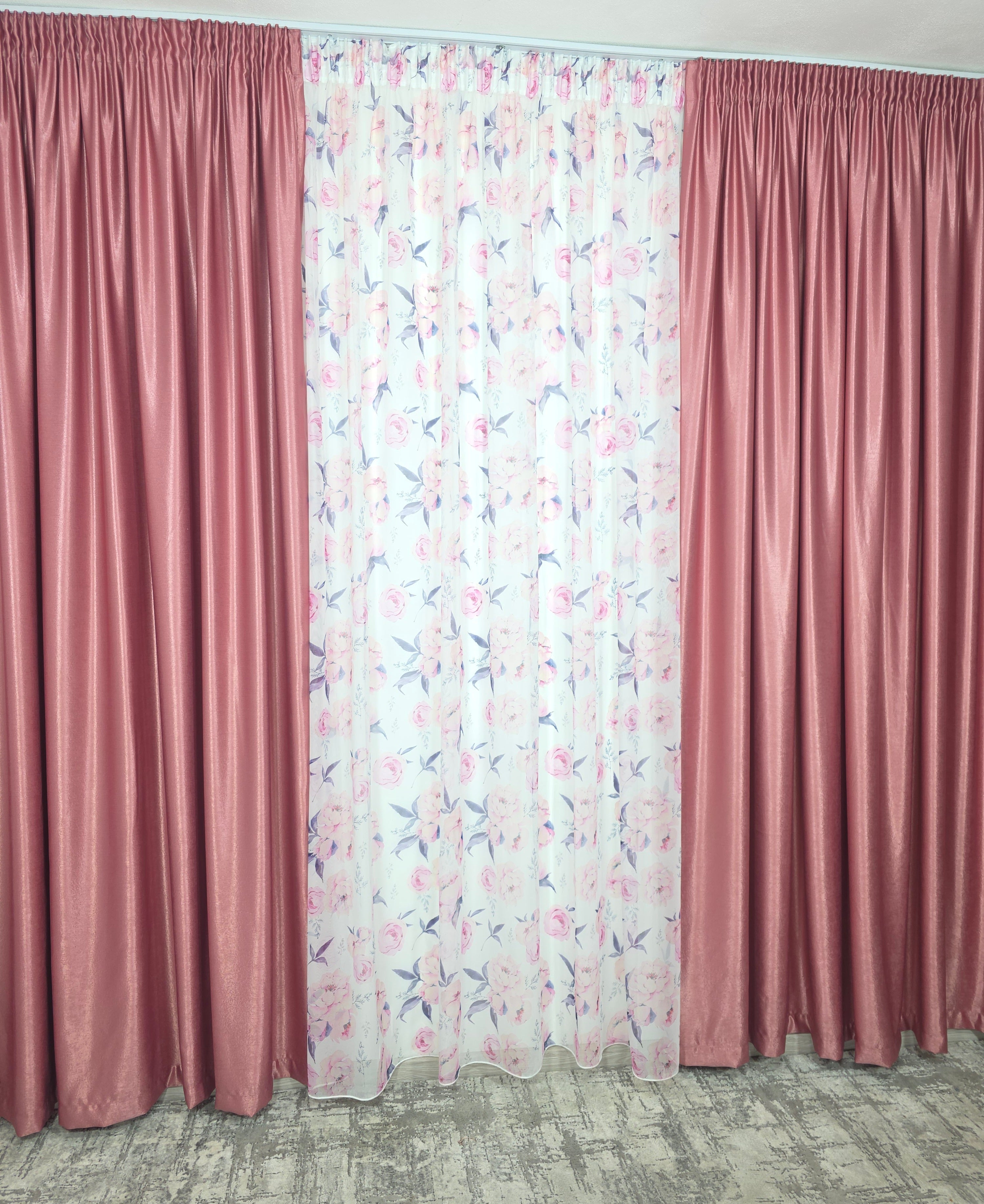 Setul cu perdea voal floral și draperie soft roz semi-opacă aduce prospețime, rafinament și o notă romantică în orice spațiu – ideal pentru decoruri luminoase și elegante.