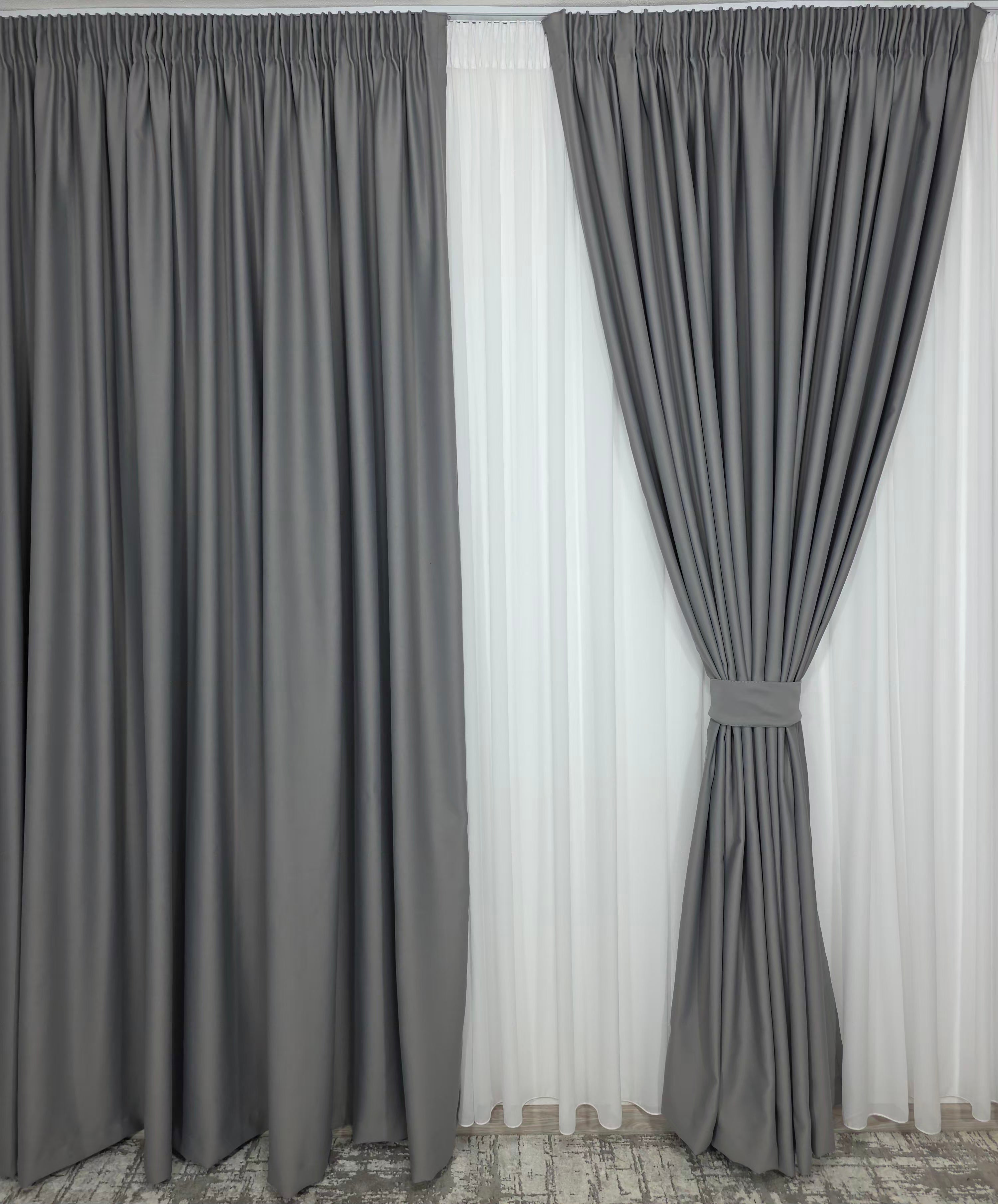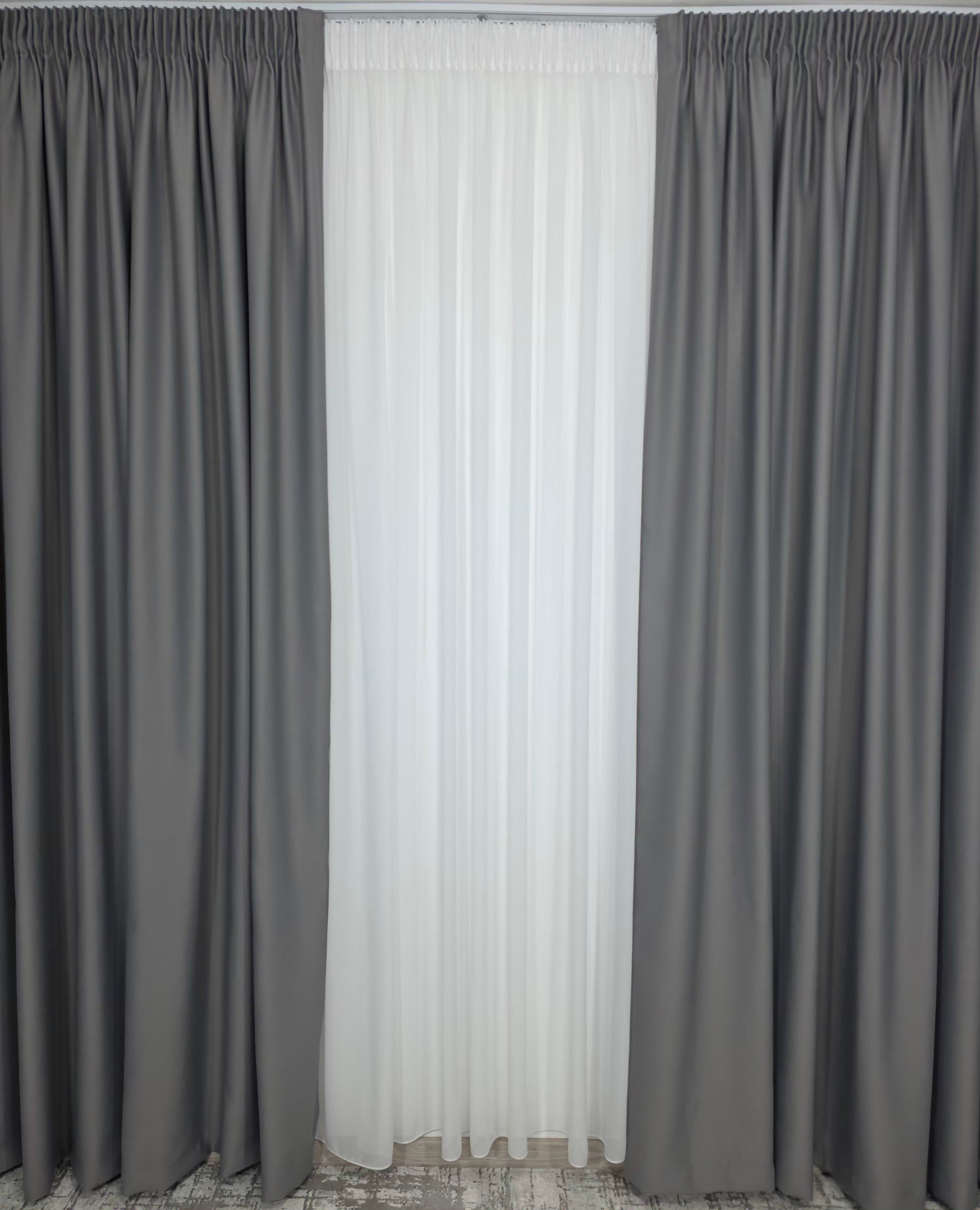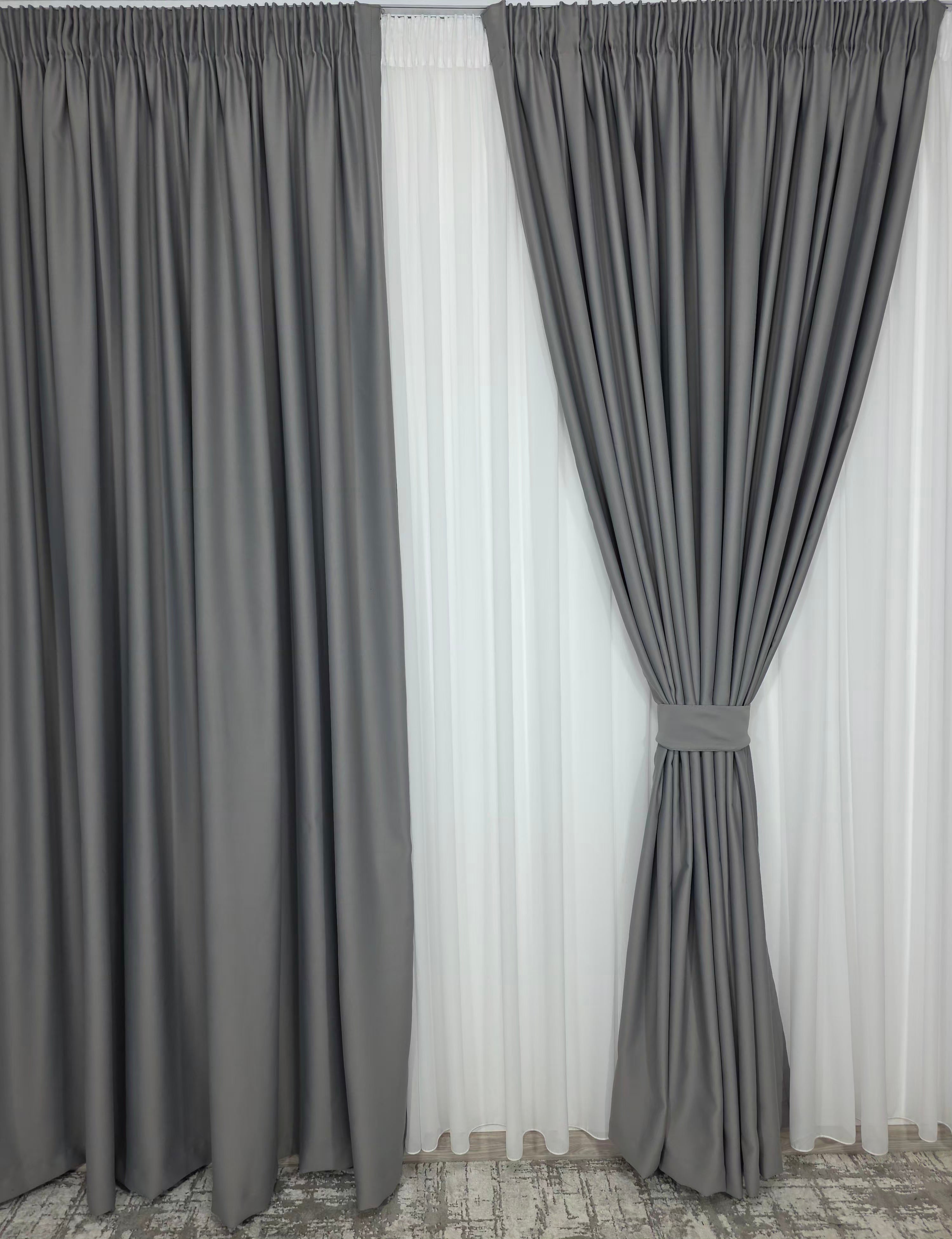 Set Perdea din Voal Alb & Draperie Simplă Gri Cenușiu Blackout 98% – Luminozitate Pură și Control Total al Luminii