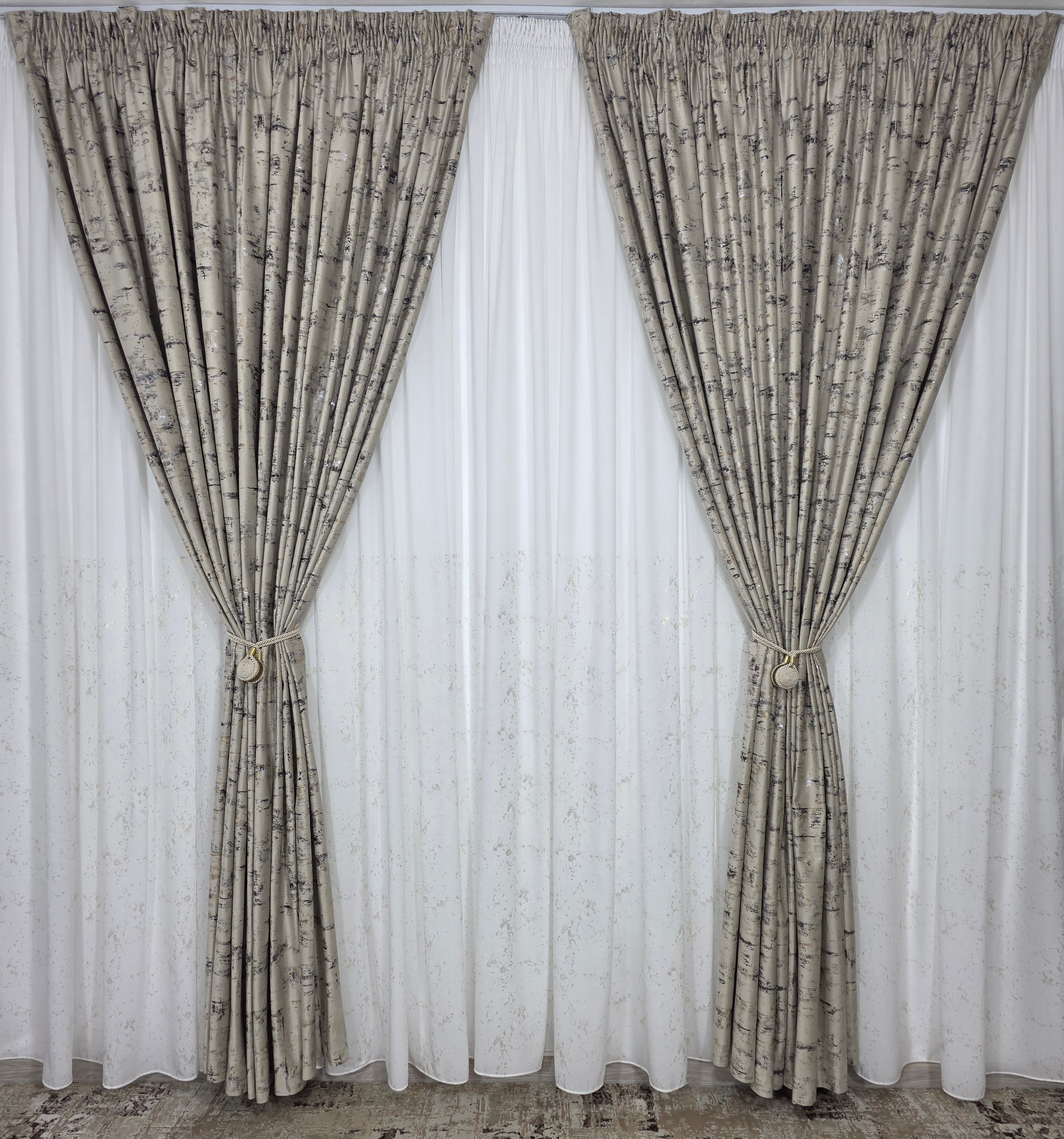 Acest set spectaculos îmbină delicatețea perdelei albe din mătase, decorată cu inserții aurii subtile, cu rafinamentul draperiei din catifea bej cu inserții elegante. Împreună, creează un ambient sofisticat și luminos, unde transparența fină și detaliile luxoase se completează armonios.