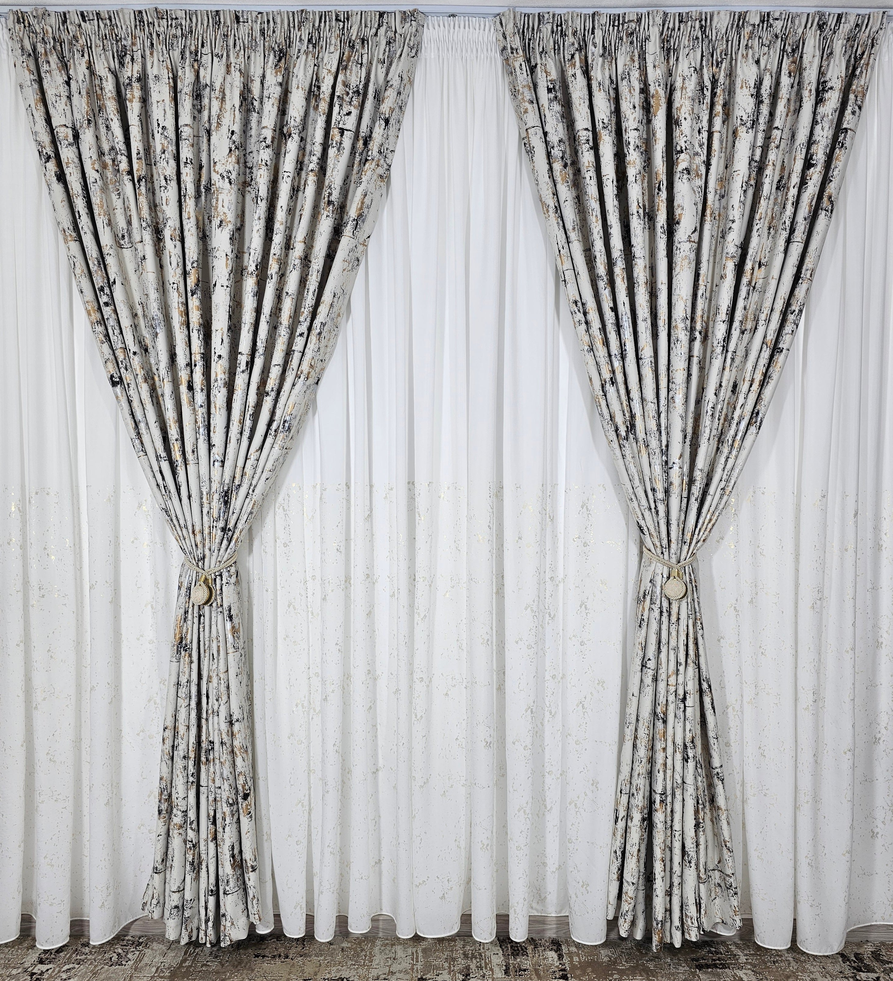 Un set sofisticat și modern, alcătuit din perdea albă din material tip mătase cu inserții aurii delicate și draperie ivoire blackout cu inserții, ce adaugă eleganță și echilibru decorului.