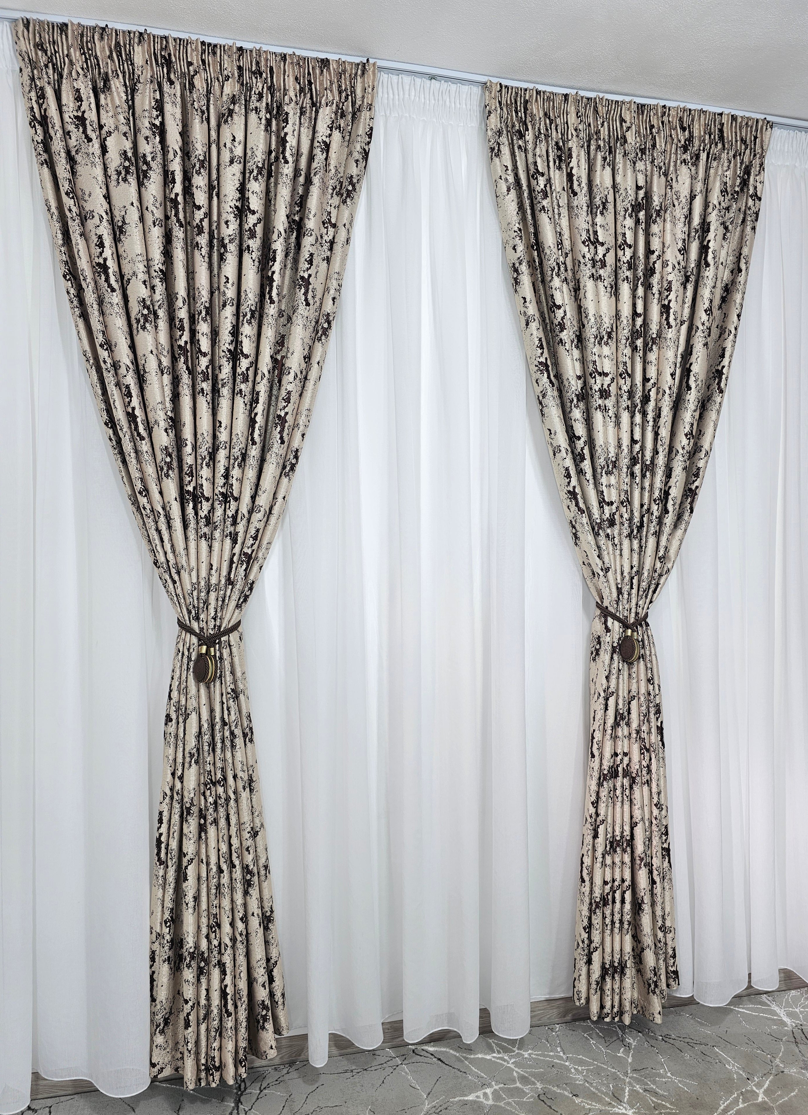 Un set modern ce combină perdeaua tip in cu textură naturală și draperia blackout model granit, ideal pentru un decor elegant și funcțional. Contrastul dintre simplitatea perdelei și aspectul texturat al draperiei aduce profunzime și rafinament oricărui spațiu.