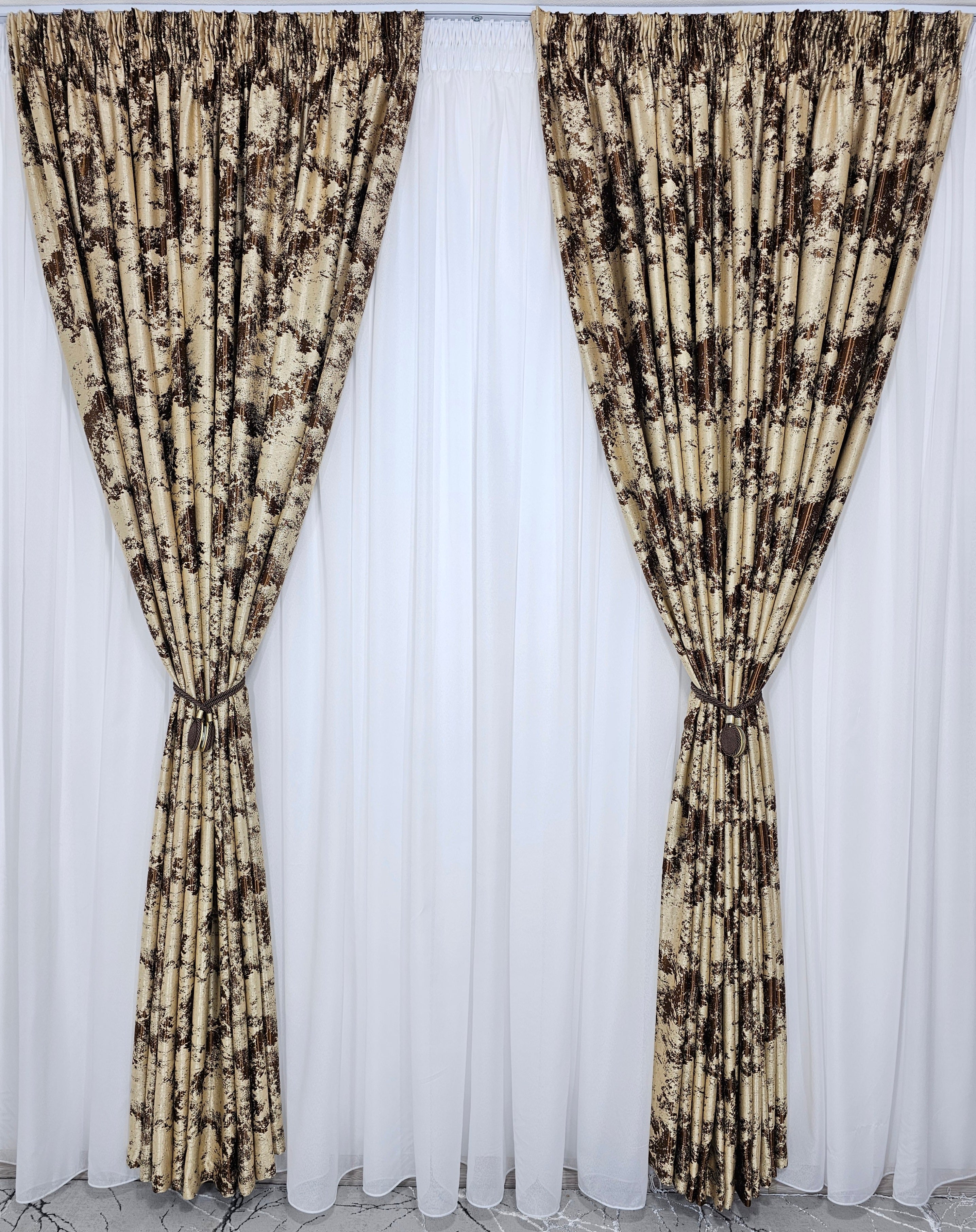 Acest set elegant combină rafinamentul perdelei albe din tafta, cu textură fluidă și luminoasă, cu aspectul sofisticat al draperiei crem maro blackout 80%, decorată cu model travertin inspirat din piatra naturală. Împreună, creează un decor modern și rafinat, unde luminozitatea fină se îmbină armonios cu accentele de stil și funcționalitate.