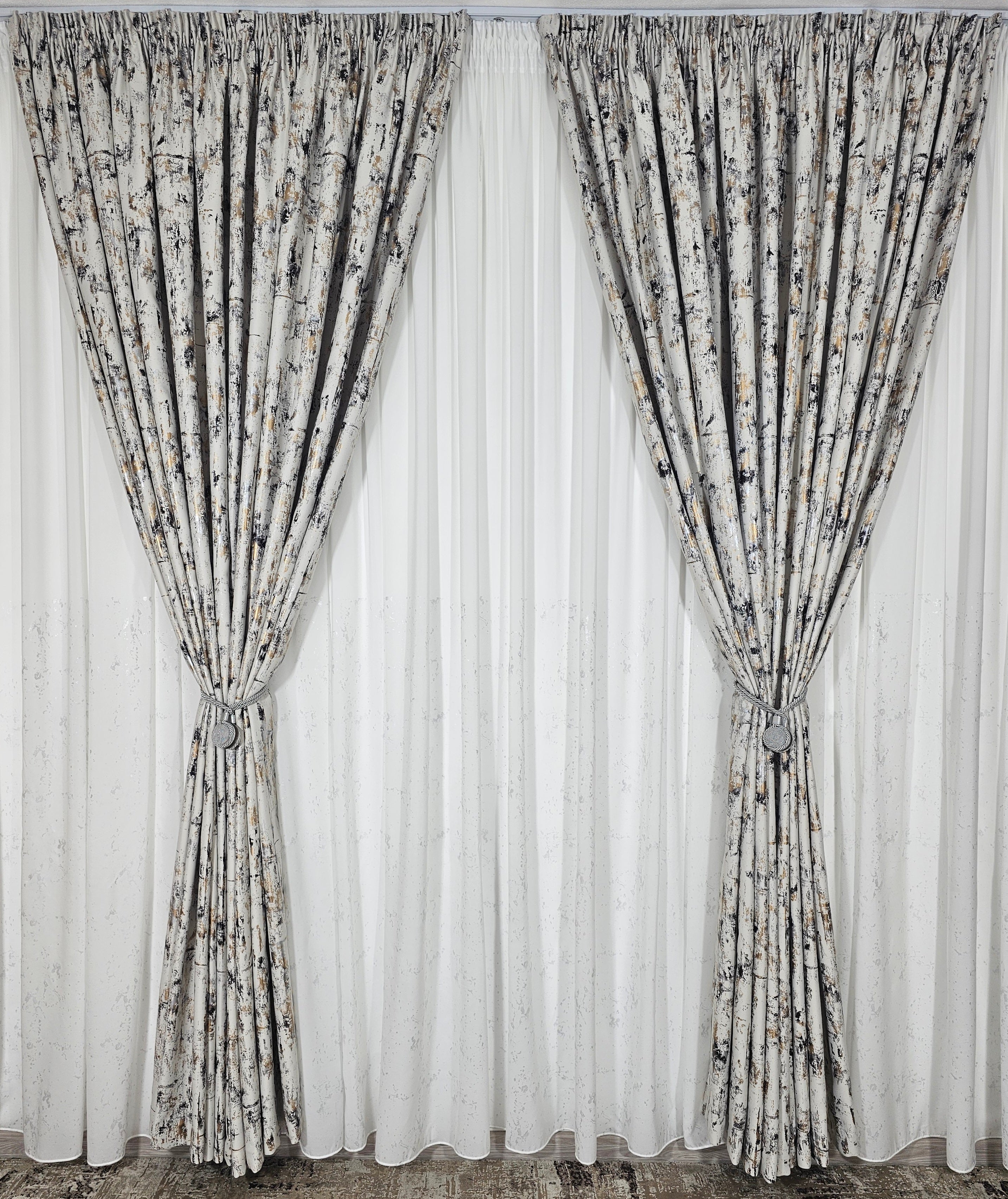 Un set sofisticat ce reunește strălucirea subtilă a perdelei din imitație de mătase albă cu inserții argintii și eleganța draperiei ivoire blackout 90% decorată cu inserții delicate, creând un echilibru între rafinament și funcționalitate.