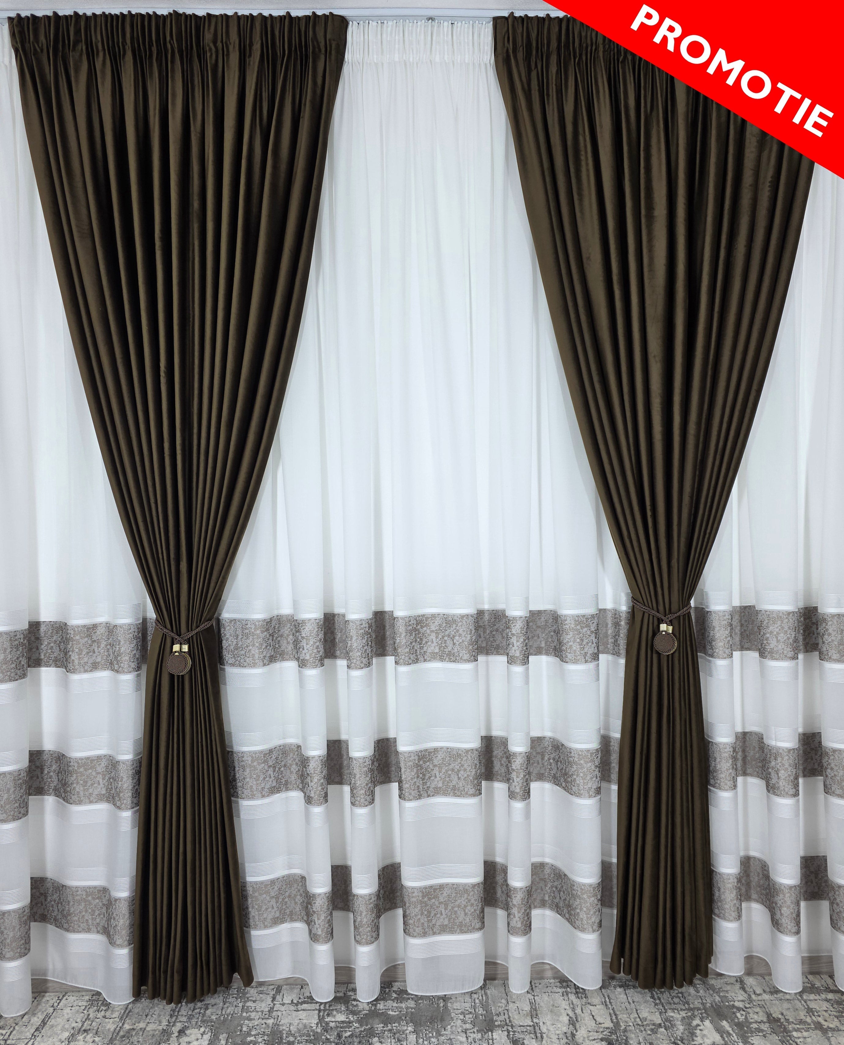 Set Perdea din In Cristal cu Dungi Capucino și Draperie din Catifea Maro Blackout 90% – Eleganță Naturală și Funcționalitate de Top