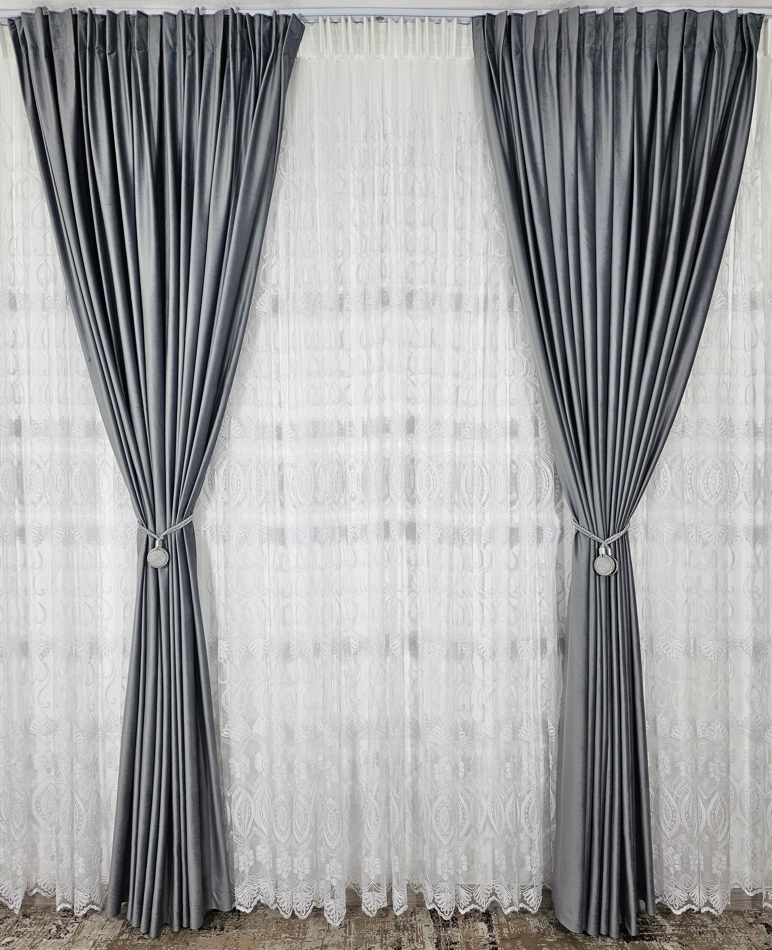 Prin combinația dintre delicatețea broderiei albe pe tul și eleganța practică a catifelei gri blackout, acest set aduce un plus de stil și armonie în locuința ta. ✨