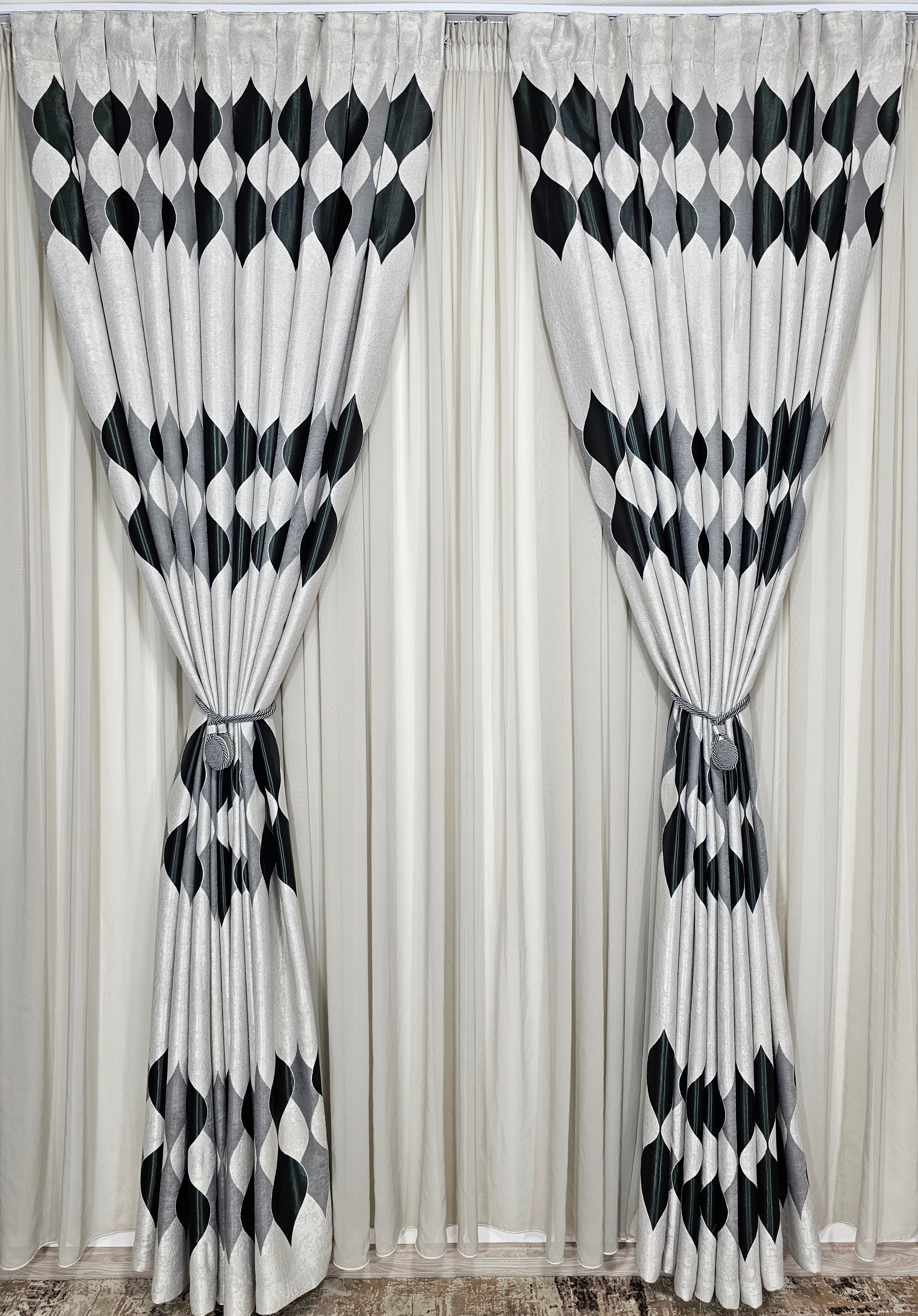 Transformă-ți spațiul într-un sanctuar de stil și rafinament cu acest set elegant format din perdea gri simplă din jorjet și draperie cu model sofisticat în nuanțe de gri și negru. Ideal pentru interioare moderne, setul îmbină perfect funcționalitatea cu designul atrăgător.