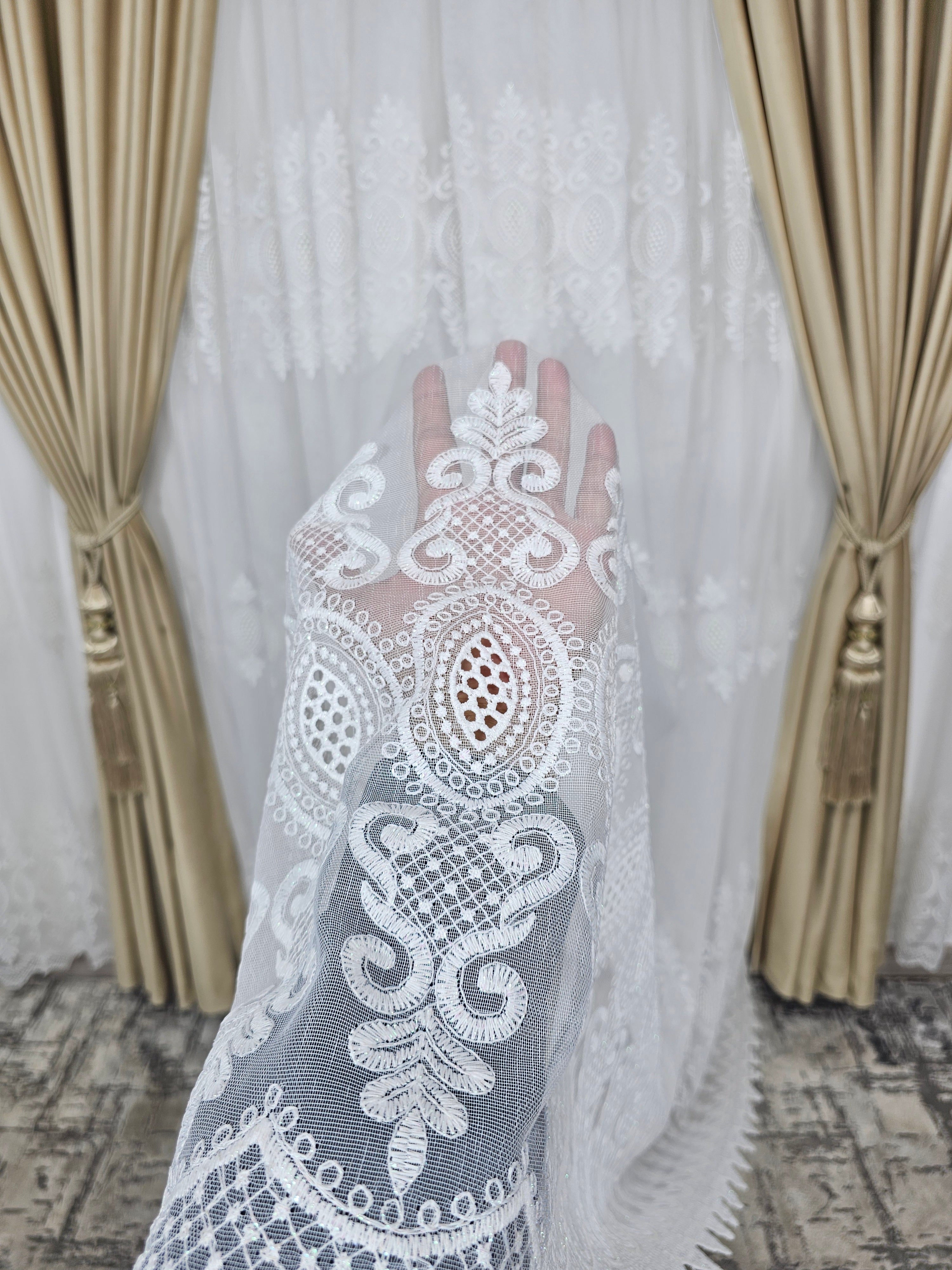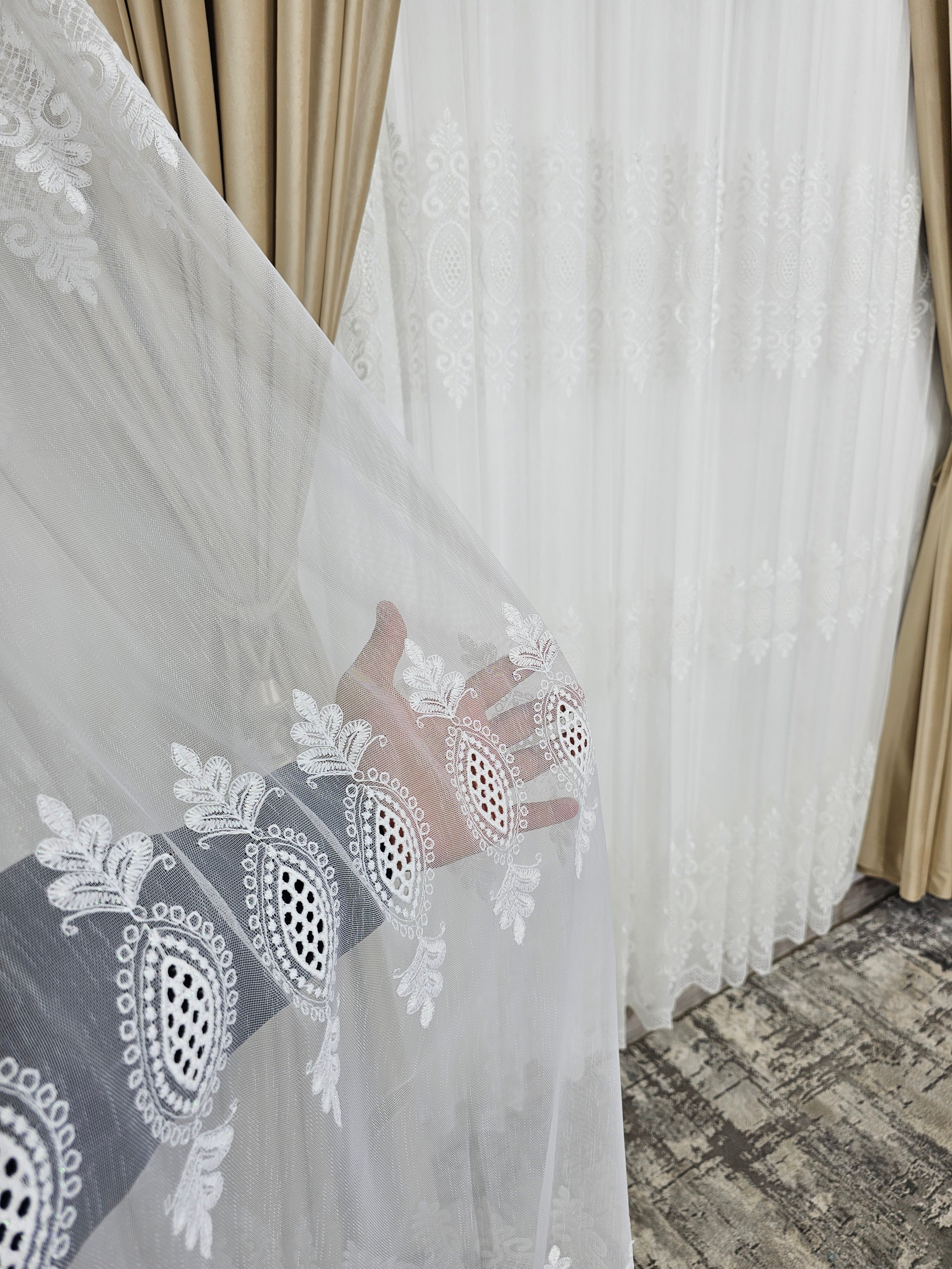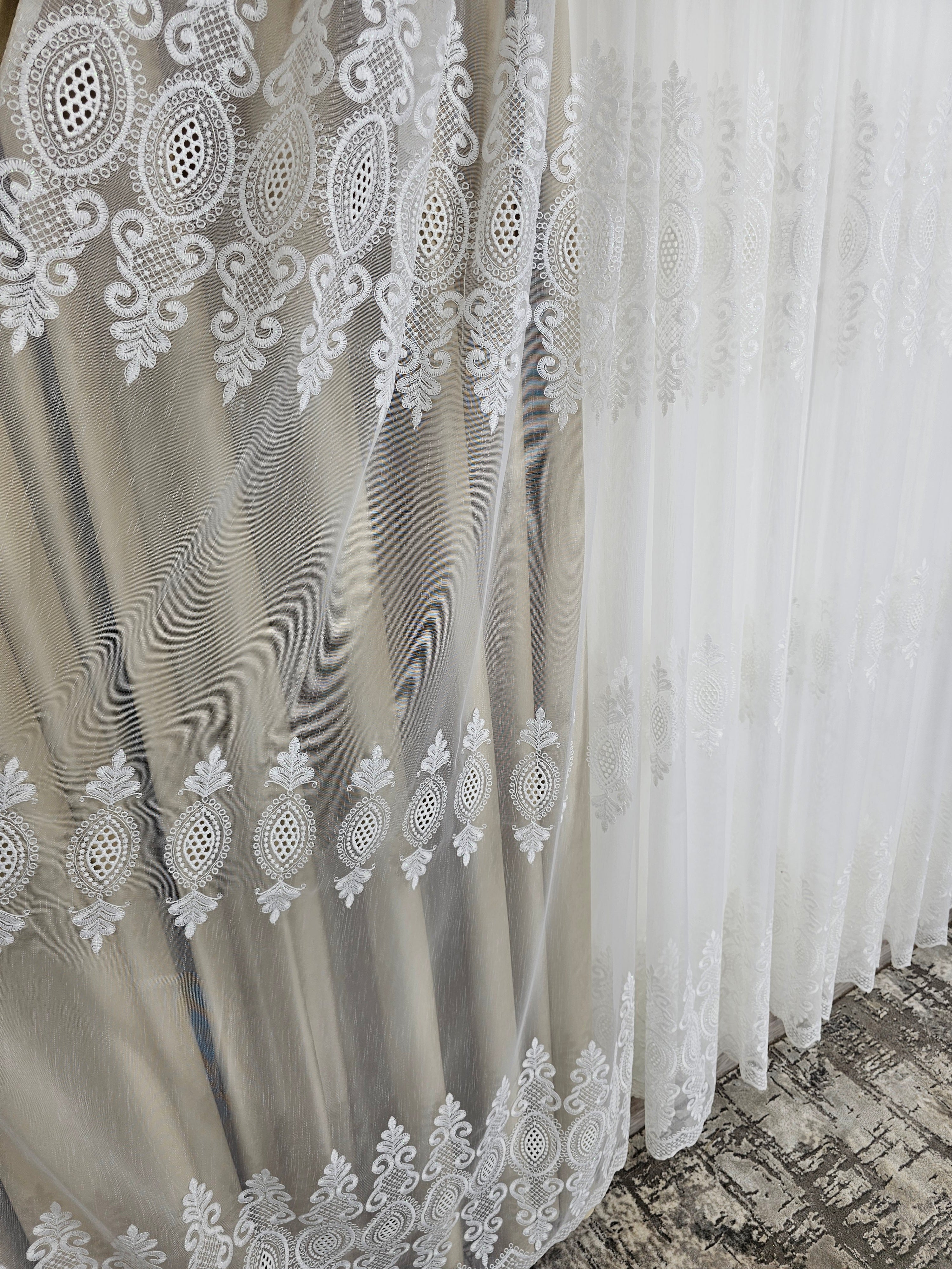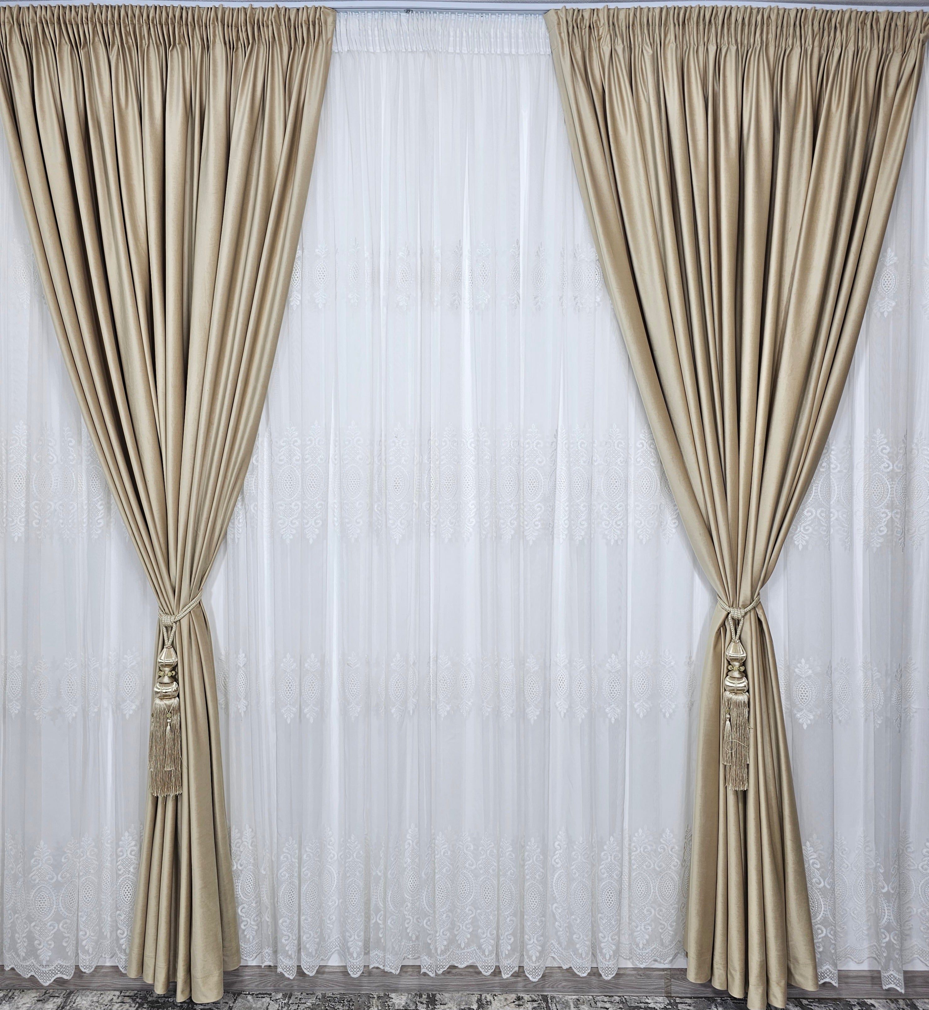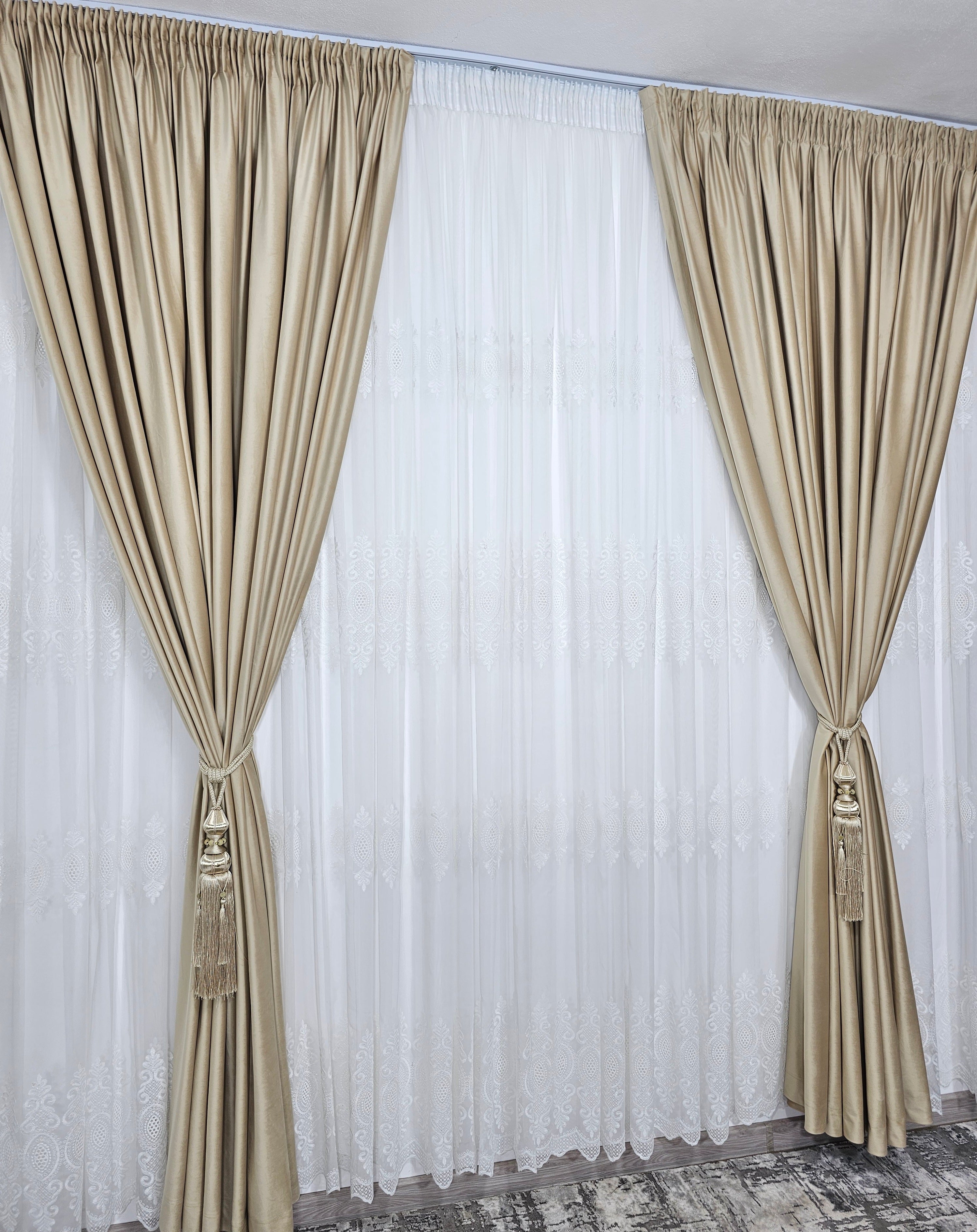 Acest set elegant combină delicatețea perdelei crem-ivoire tip bamboo, îmbogățită cu broderie fină, cu rafinamentul draperiei din catifea crem blackout 80%. Împreună, creează un echilibru între naturalețea materialului ce imită bamboo-ul și confortul oferit de draperia opacă, perfectă pentru controlul luminii și intimitate.