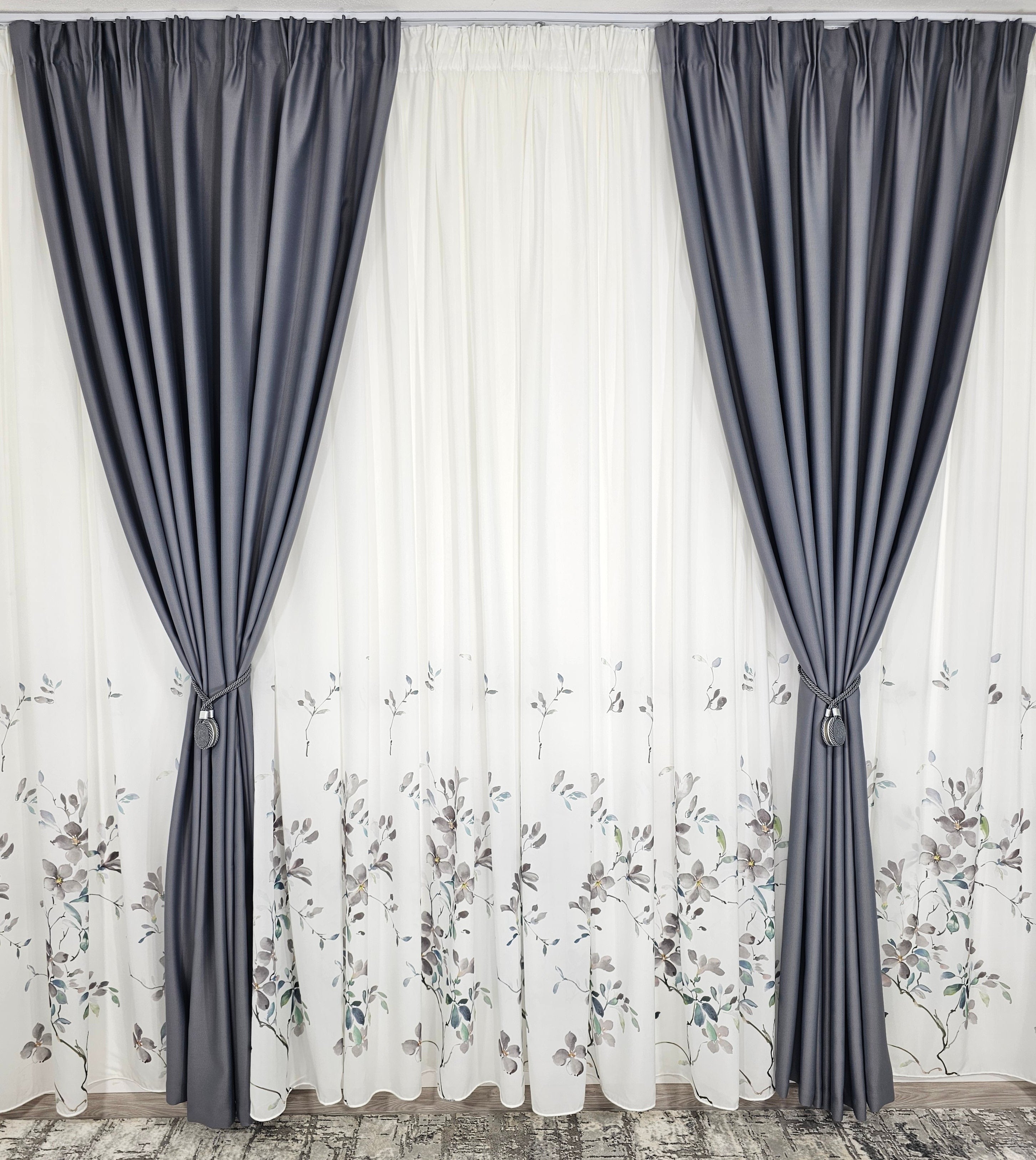 Un set elegant și sofisticat, alcătuit din perdea albă din material tip mătase cu imprimeu floral gri și draperie gri blackout 98%, ideal pentru interioare moderne, unde rafinamentul se îmbină cu funcționalitatea.