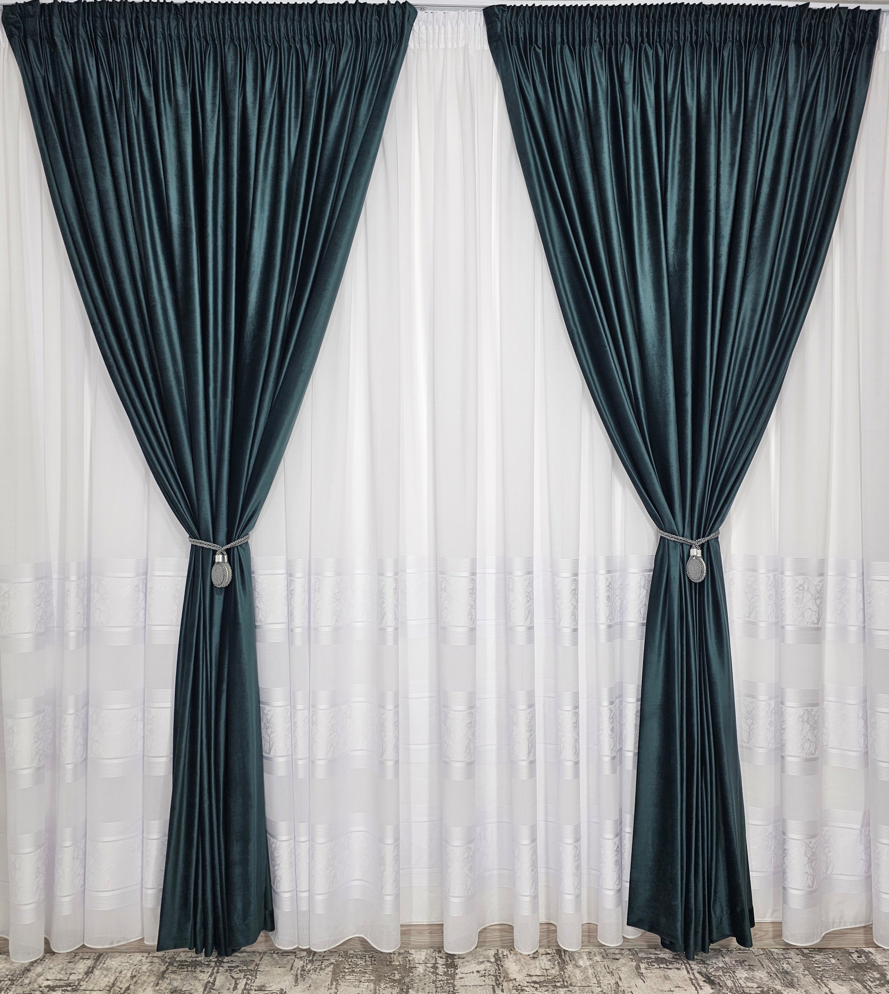 Un set sofisticat și elegant, compus din perdea din material tip in cristal cu benzi verticale albe și draperie din catifea verde onix închis, ideal pentru a aduce un aer nobil și modern în orice încăpere.