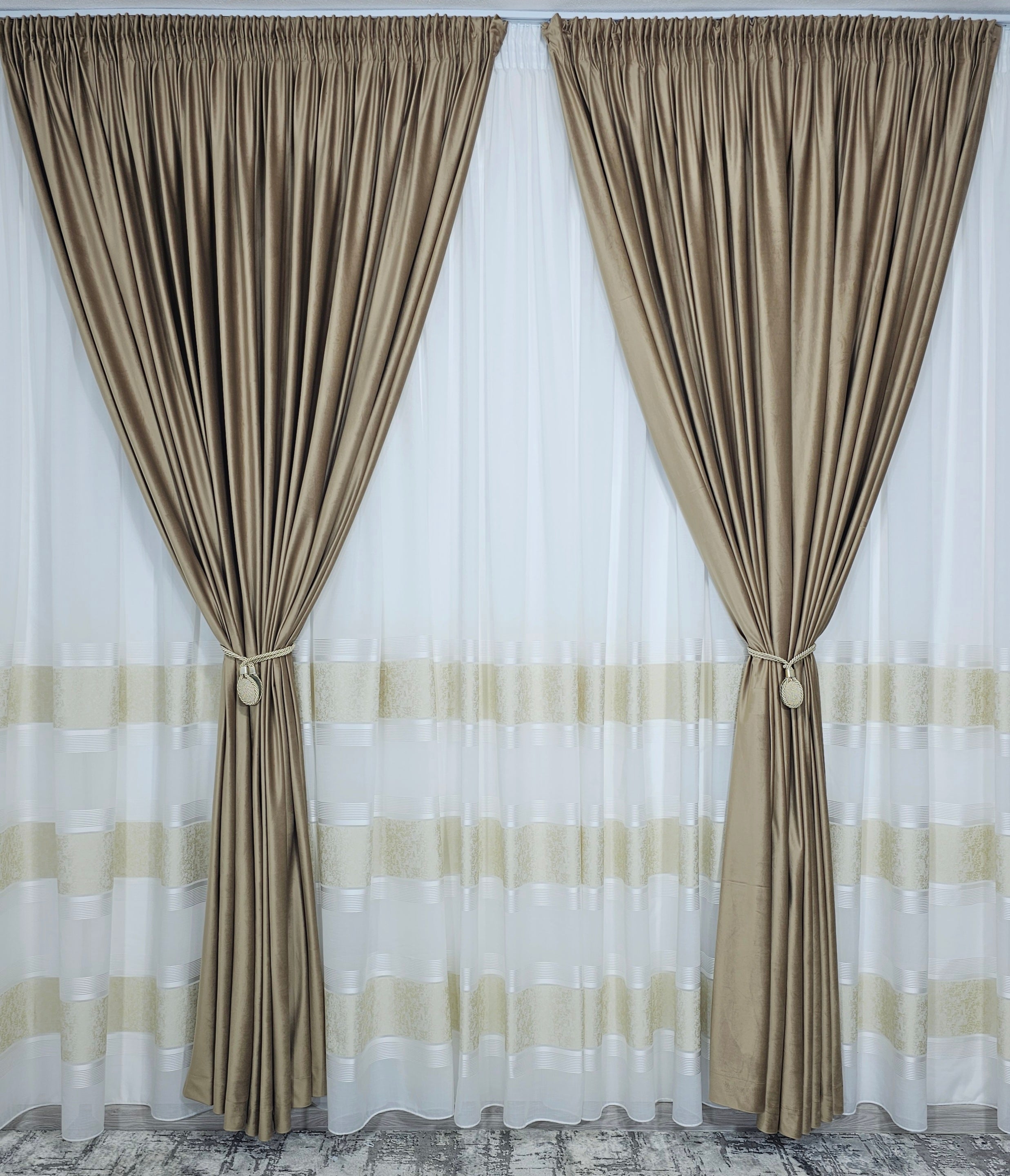 Set Perdea In Cristal cu Benzi Crem și Draperie Catifea Caramel – Eleganță și Confort pentru Fereastra Ta