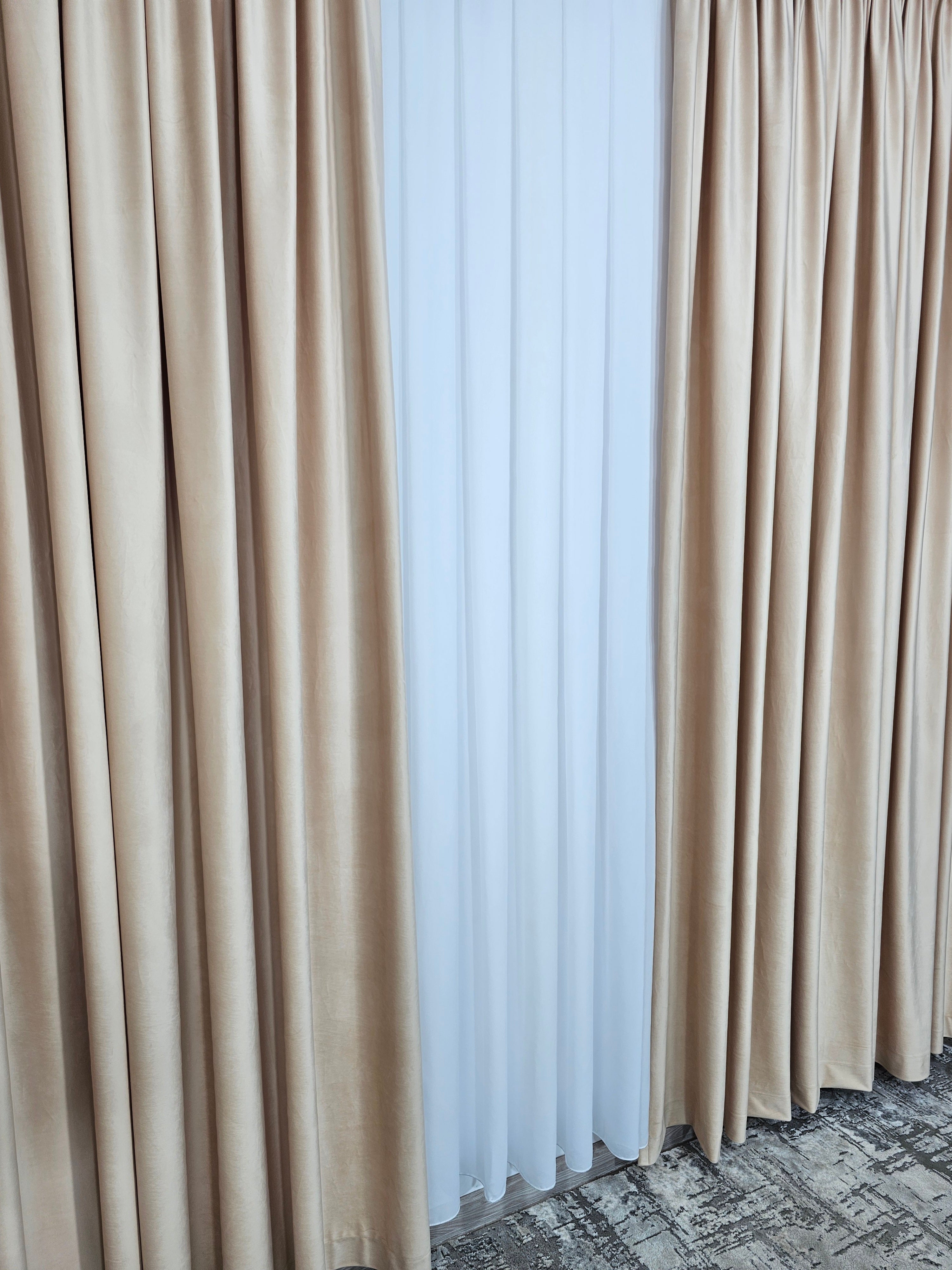 Design integrat și armonios, ce îmbină luminozitatea perdelei din jorjet cu confortul și intimitatea draperiei blackout.