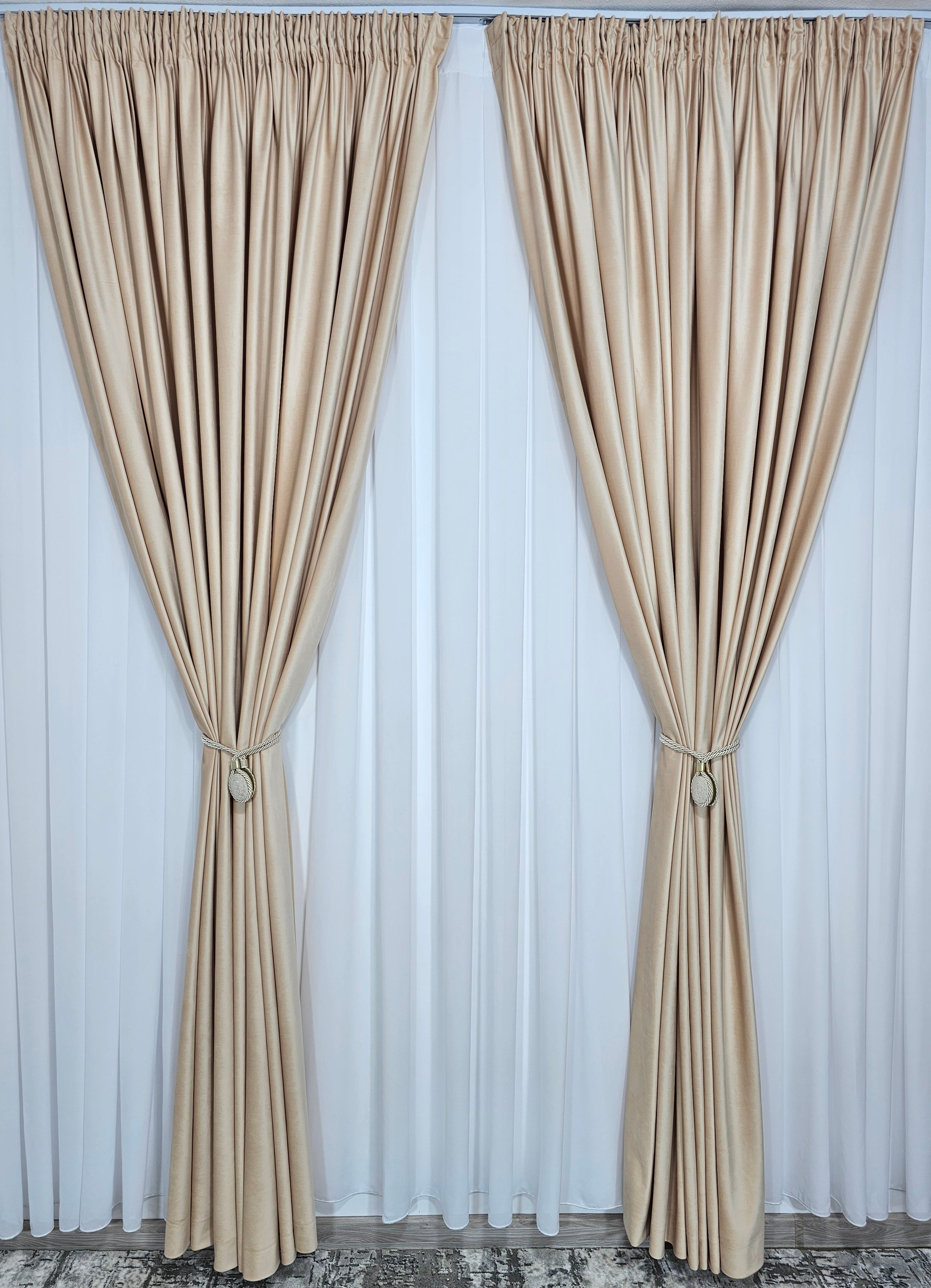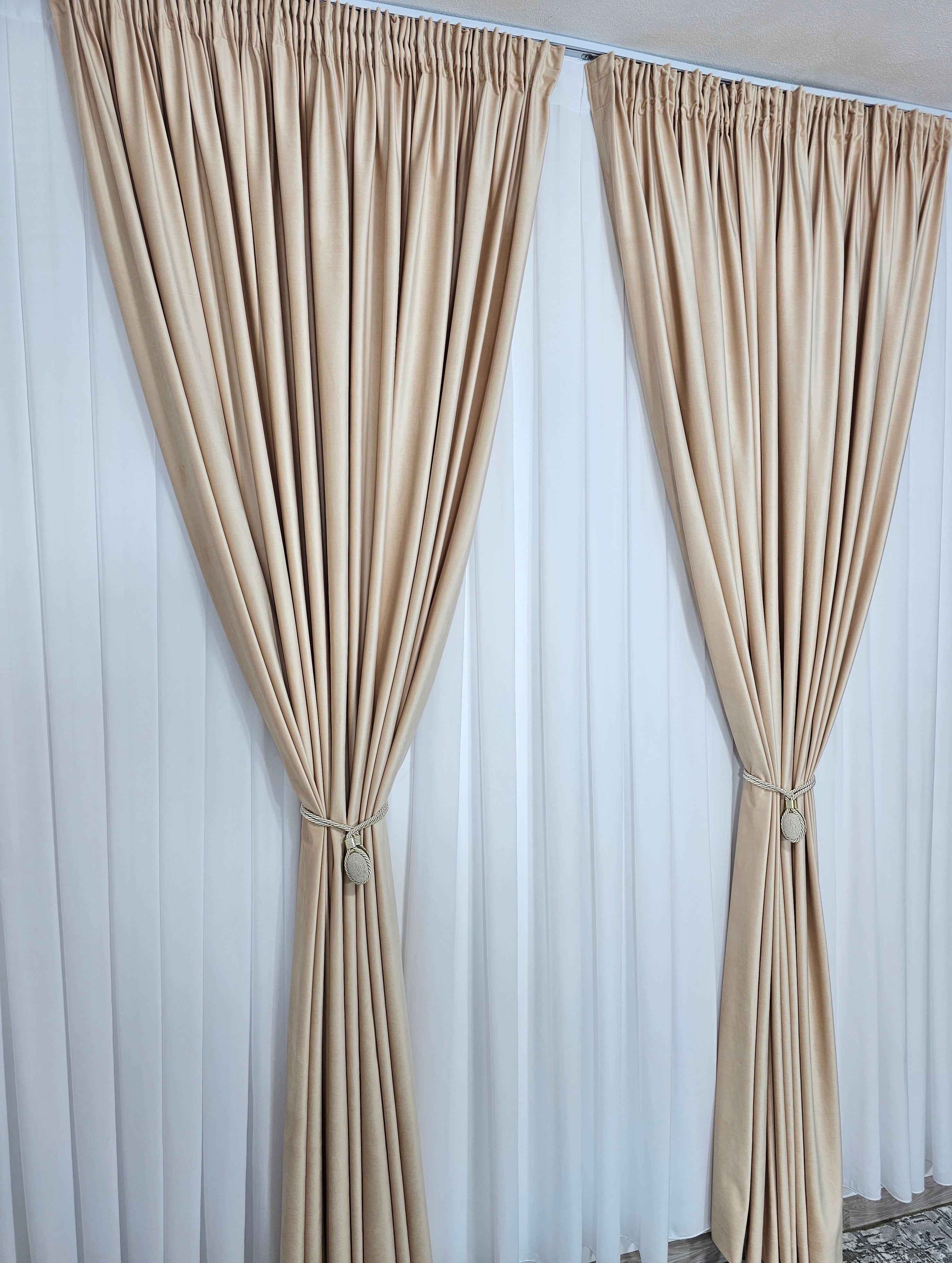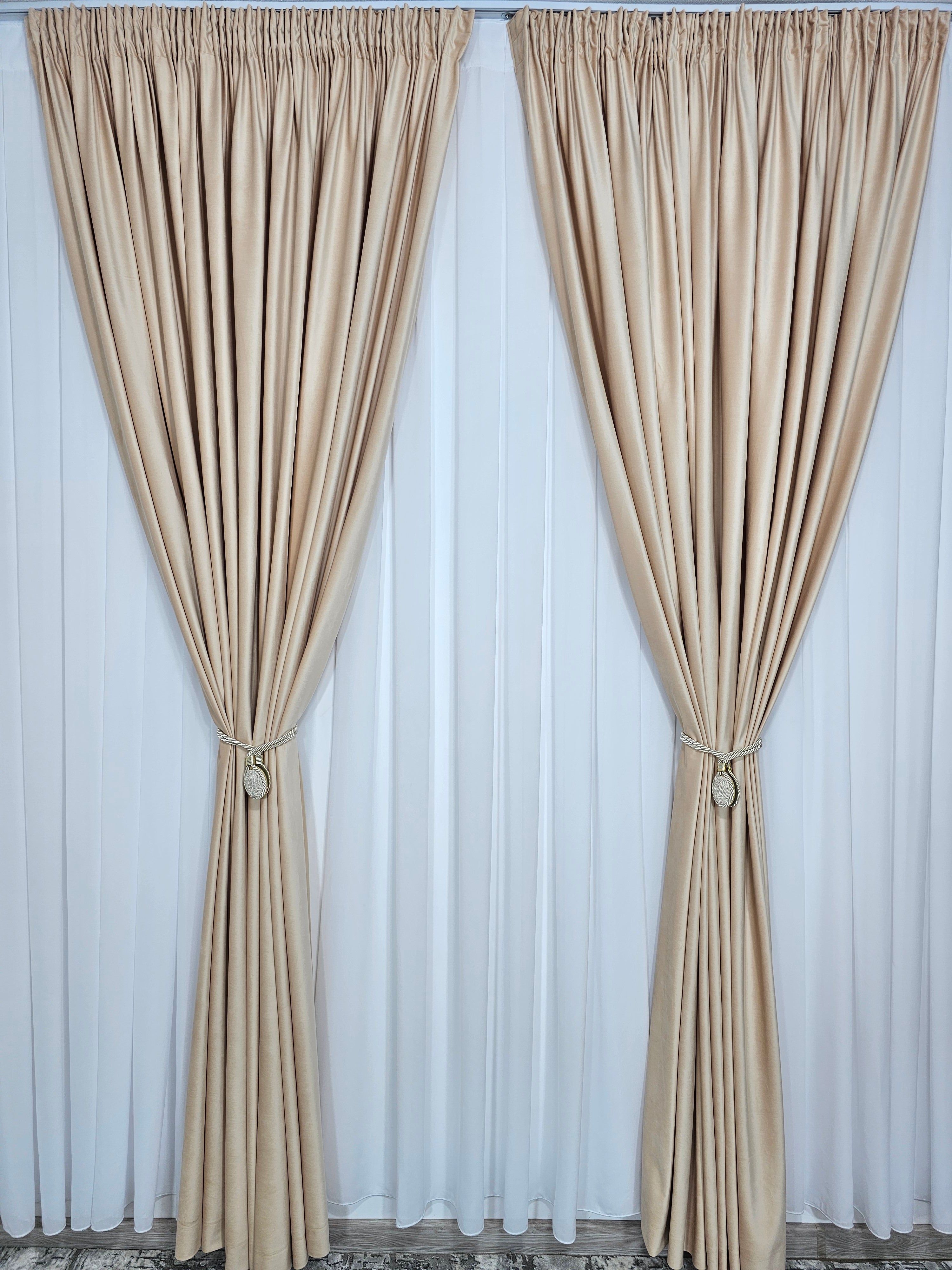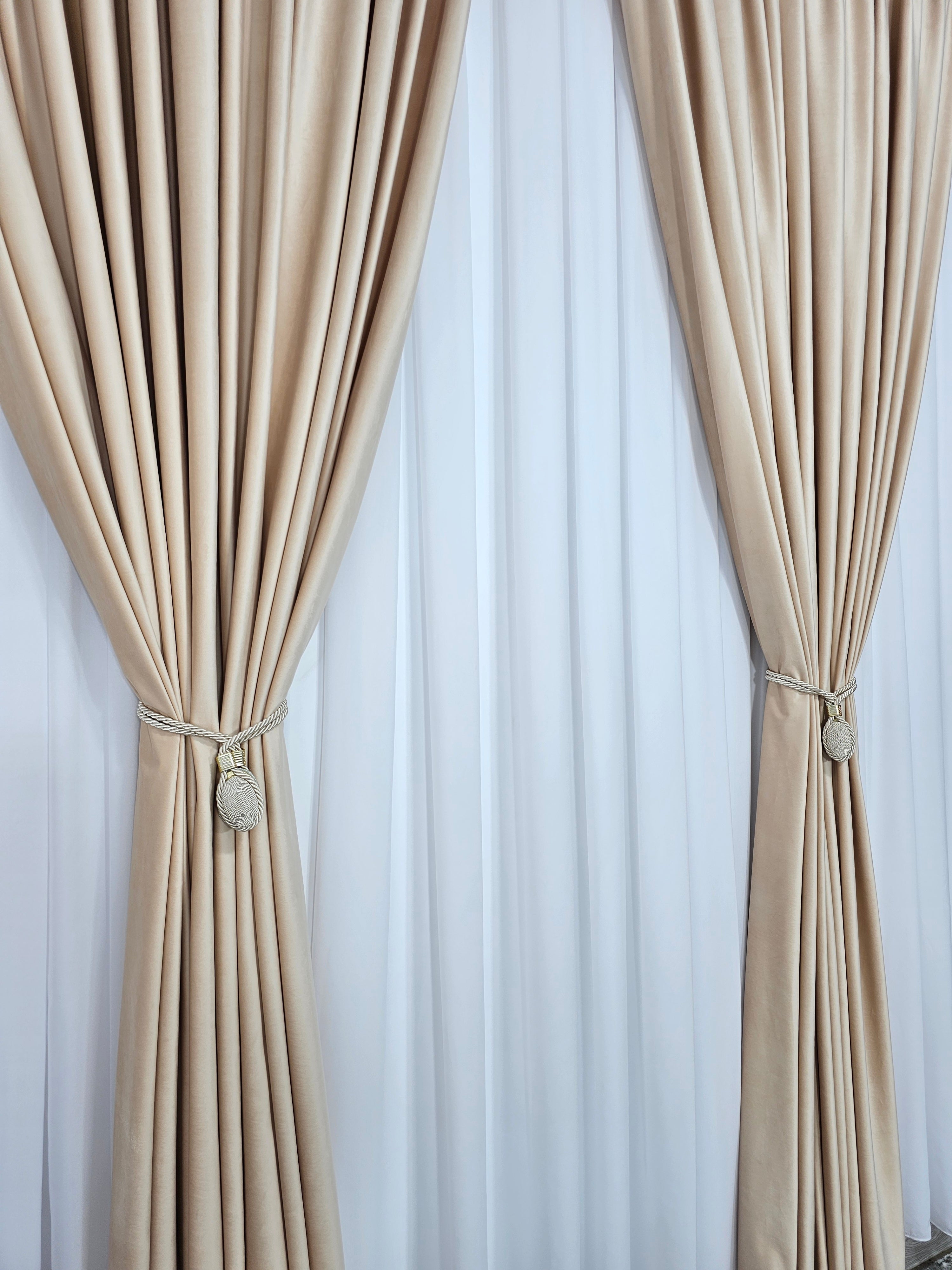Set Perdea din Jorjet Alb Imaculat și Draperie din Catifea Piersicuta Blackout 90% – Eleganță și Funcționalitate pentru Ferestrele Tale