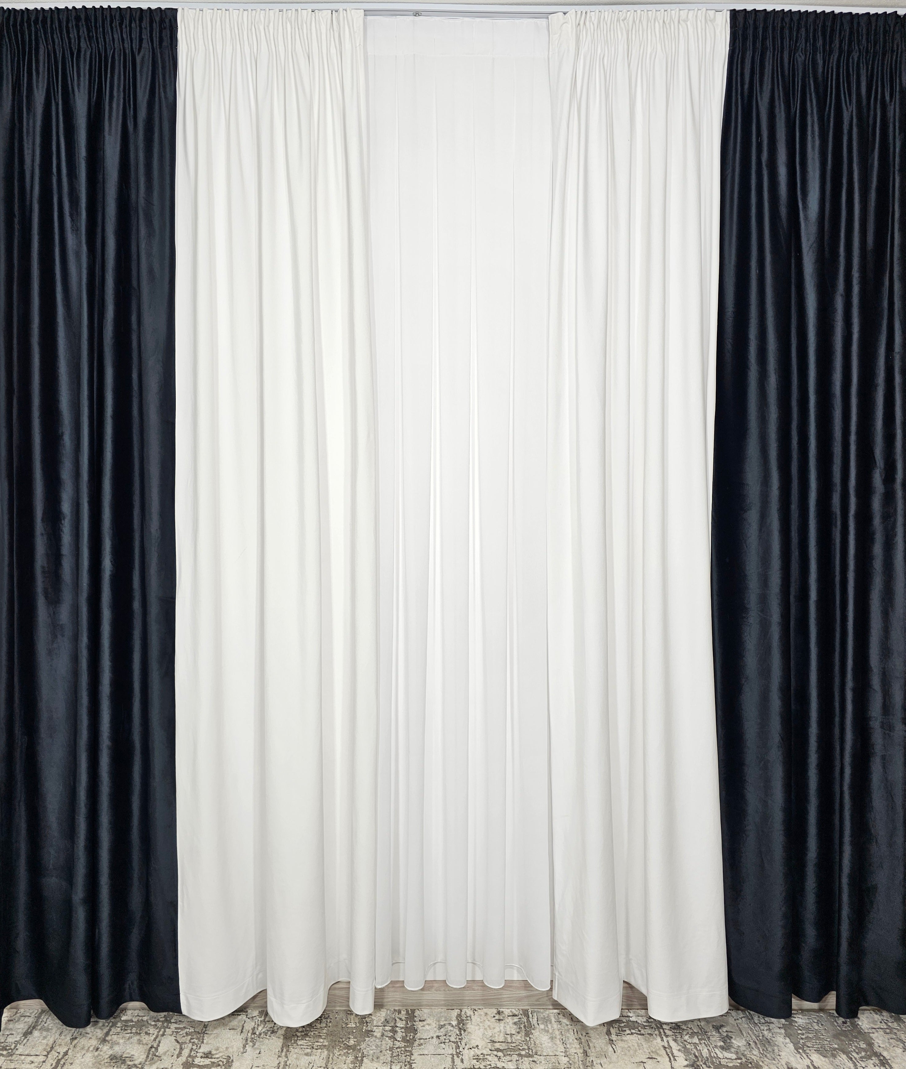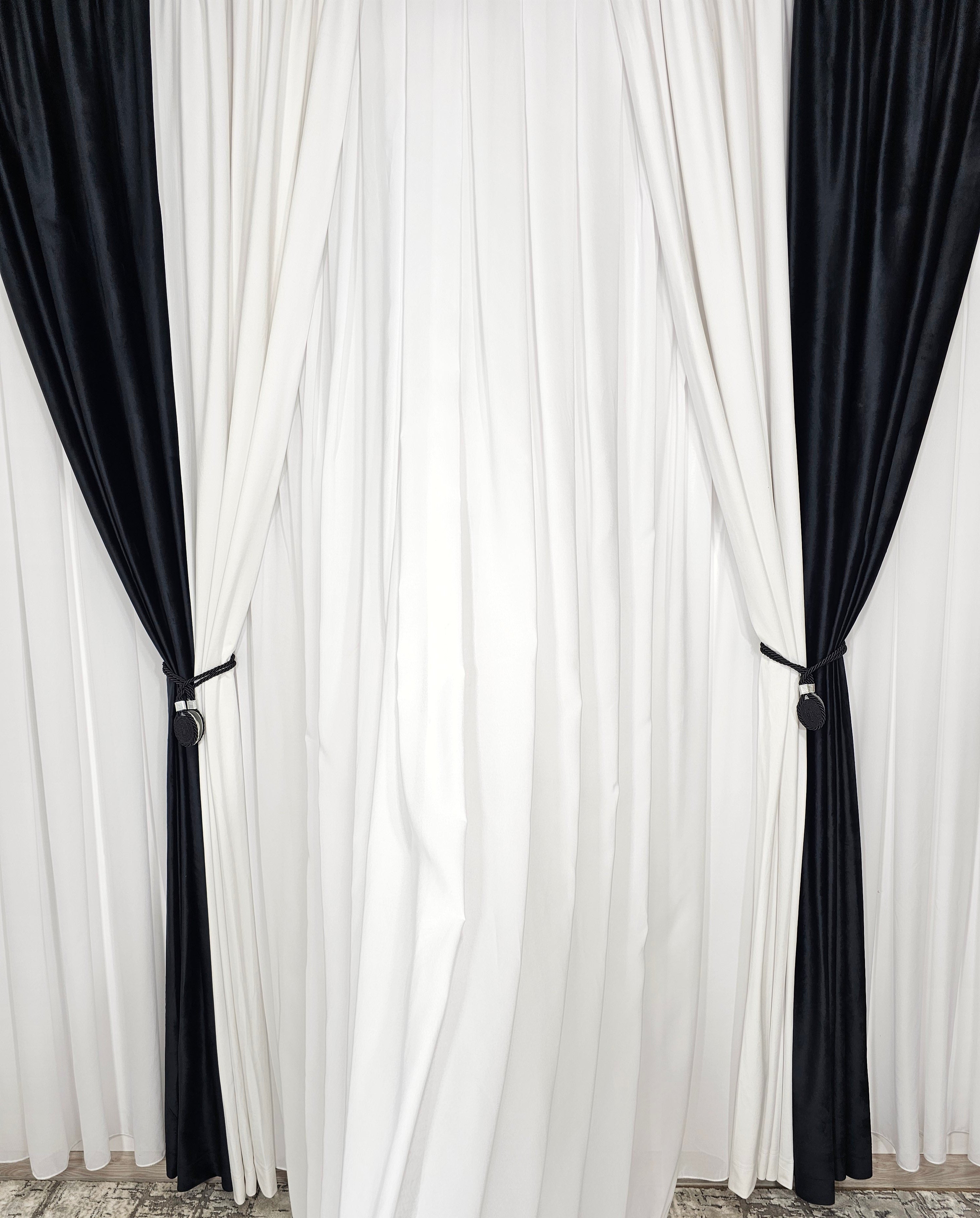 • Combinație spectaculoasă alb-negru, pentru un decor memorabil • Perdea luminoasă și draperie opulentă, perfect echilibrate • Texturi contrastante – finețea jorjetului și densitatea catifelei • Ușor de asortat în livinguri moderne, dormitoare elegante sau spații office premium