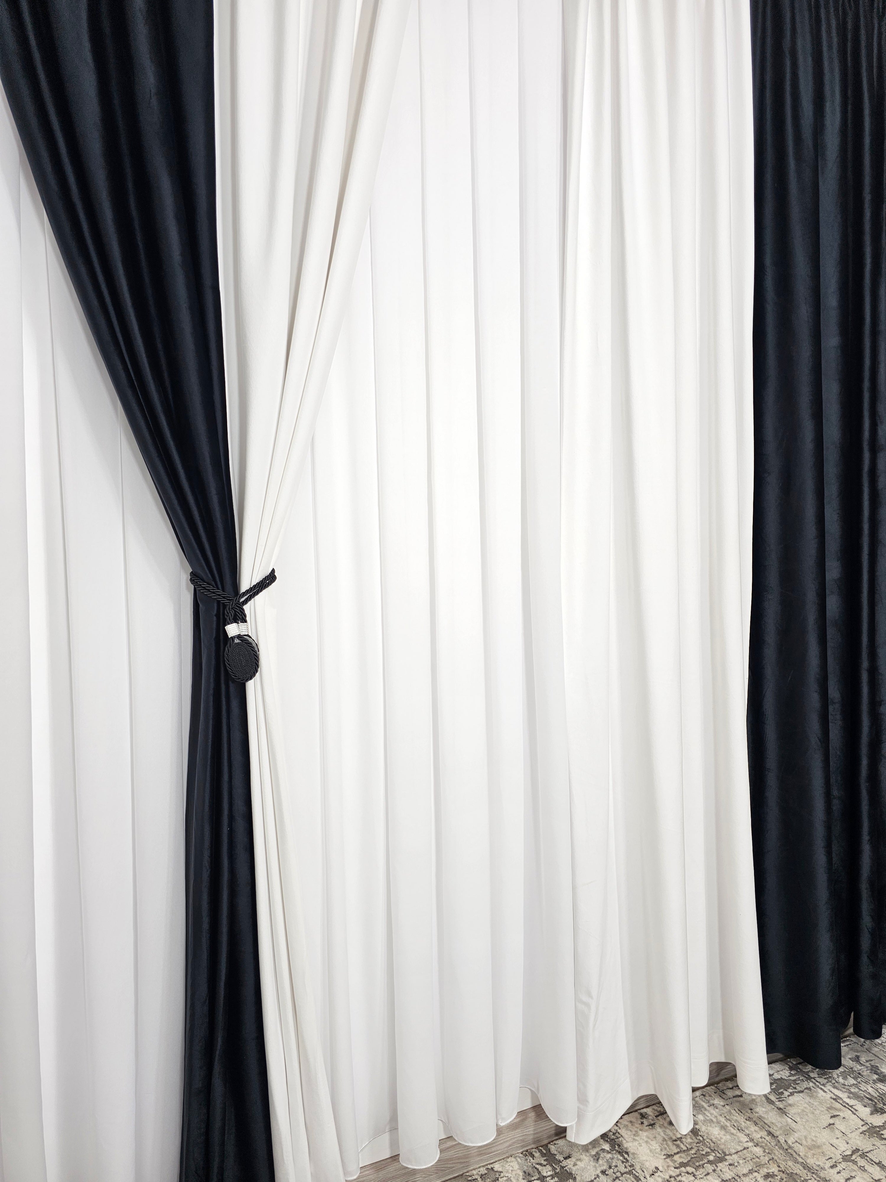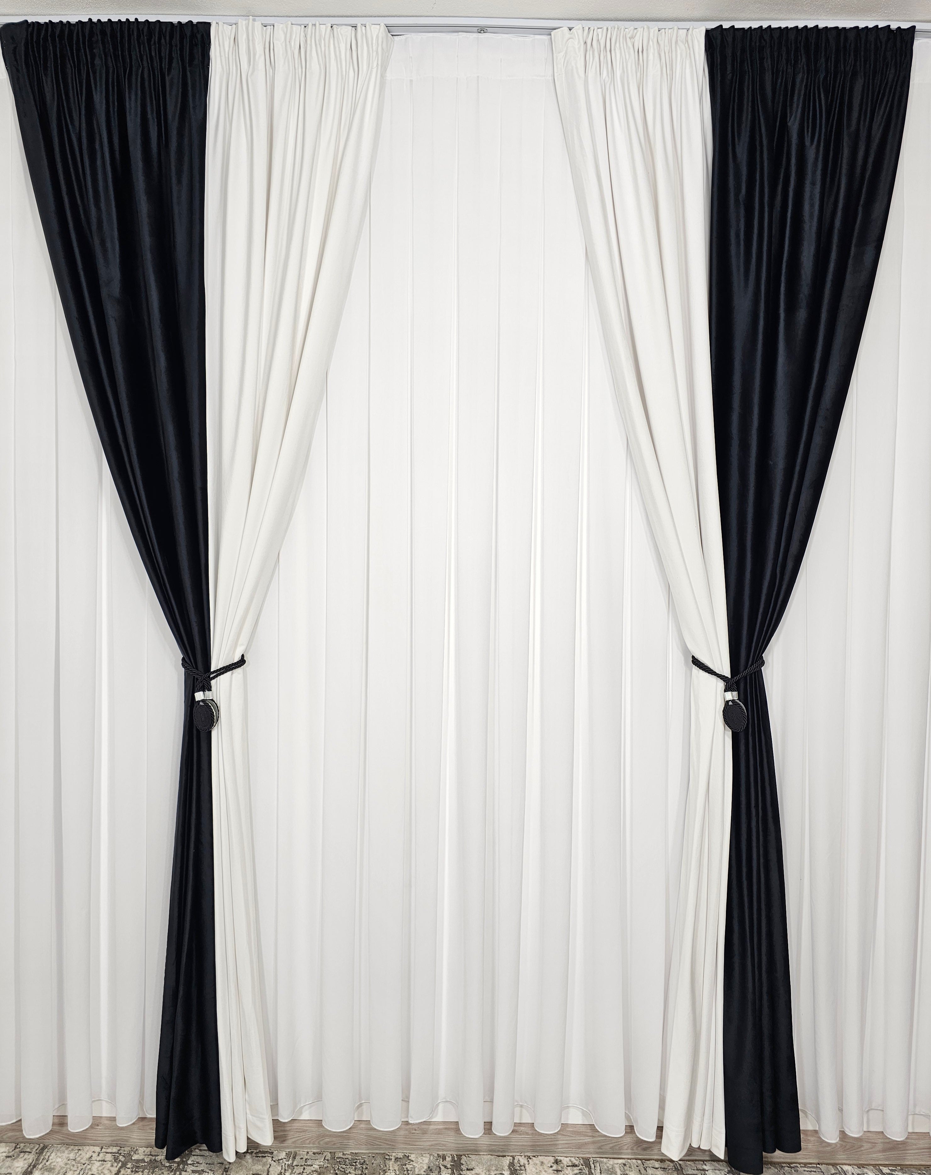 Acest set spectaculos combină delicatețea fină a perdelei din jorjet alb imaculat cu impactul vizual al draperiei din catifea bicoloră, realizată în două tonuri contrastante – jumătate albă și jumătate neagră. Perdeaua adaugă luminozitate și aerisire, în timp ce draperia creează un efect dramatic, oferind un decor sofisticat și contemporan.