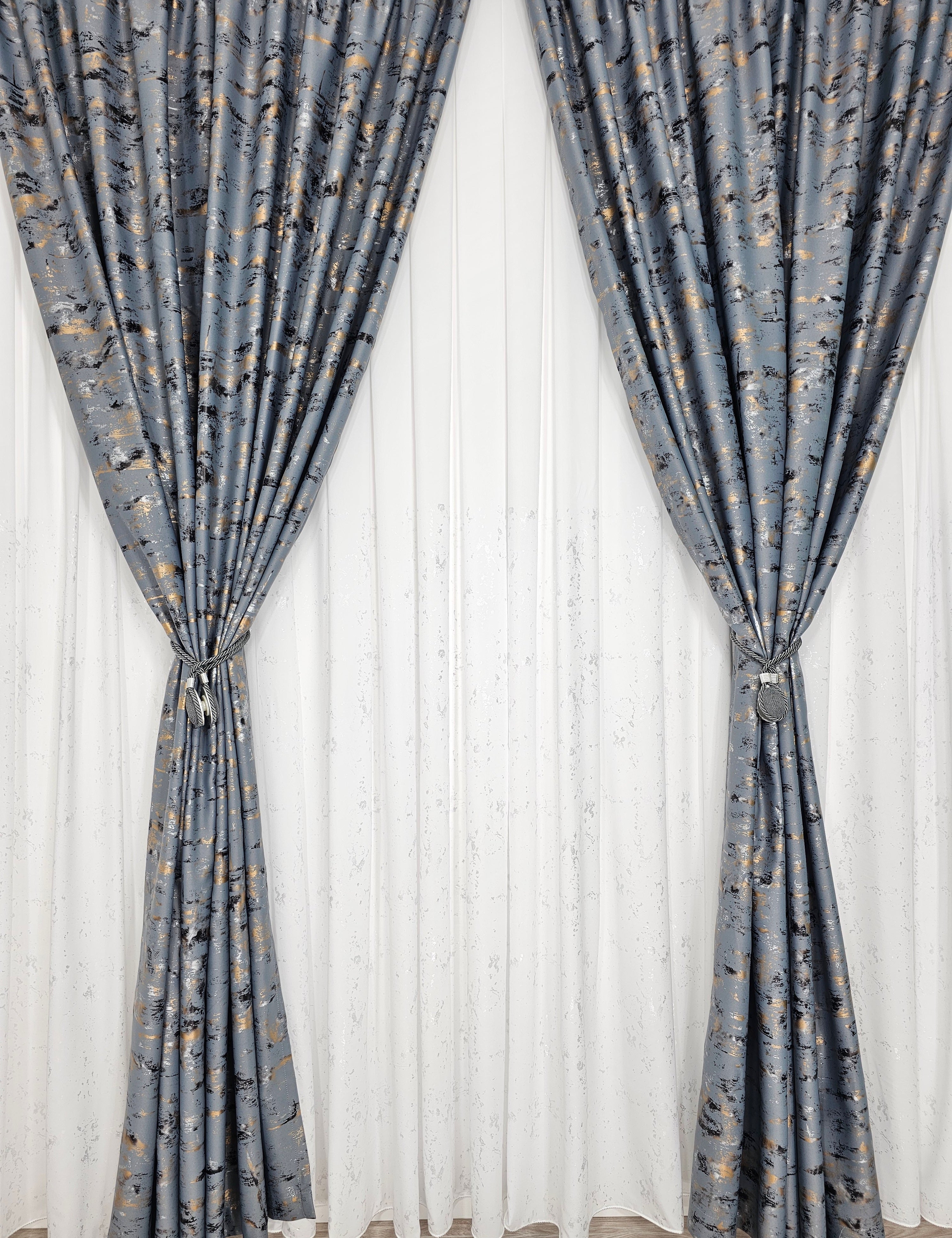 Eleganța subtilă se regăsește în acest set format din perdea din mătase cu inserții gri și draperie blackout 90% gri cu inserții decorative, o combinație perfectă între rafinament și funcționalitate. Perdeaua aduce finețe și luminozitate, în timp ce draperia oferă intimitate și un efect estetic deosebit.